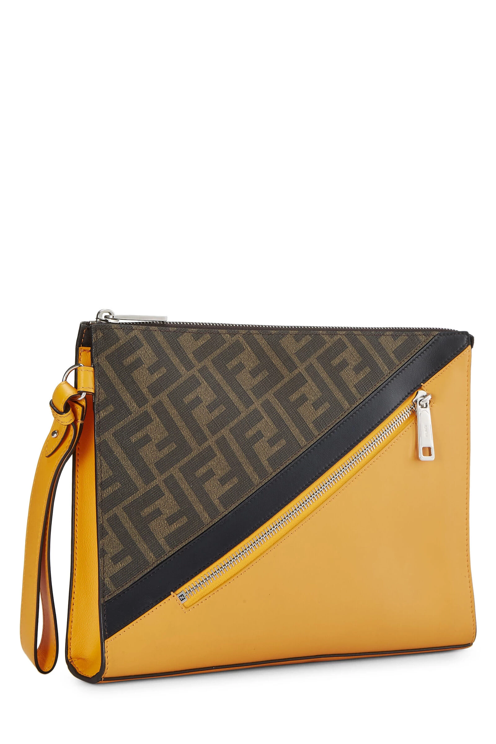 Ultra-sleek and chic clutch from Fendi rendered in a mix of leather and coated canvas. Crafted in bright orange leather on one side and Zucca ‘FF’ coated canvas on the reverse, the clutch is finished with silver-tone hardware for a bit of subtle shine.