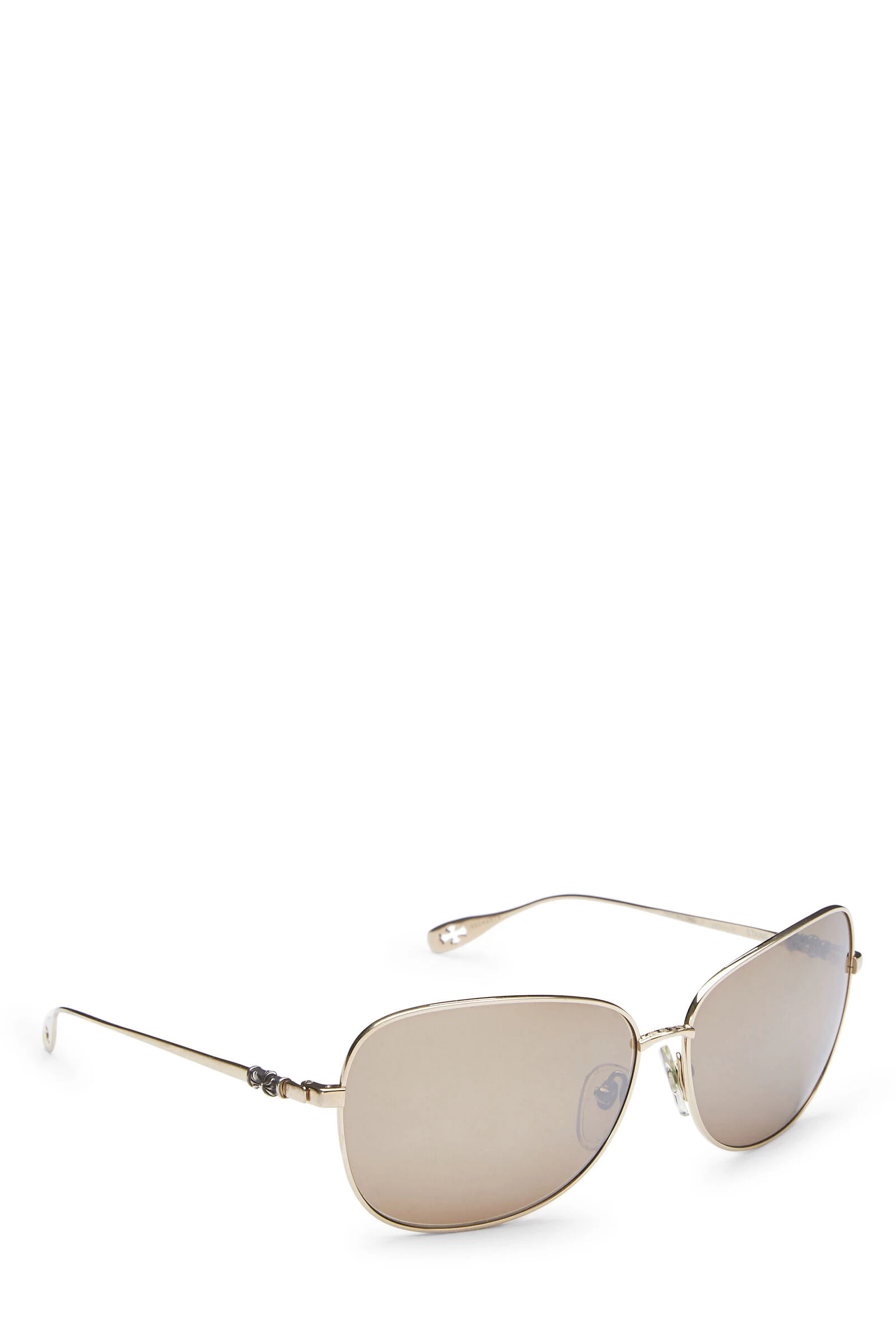 Classic Chrome Hearts Stains III sunglasses featuring gold-tone metal frames, brown-tinted lenses, and logo hardware at temples. Includes branded leather zip case. Measurements: Lens Width 2.4″; Temples: 5.4″; Bridge: 0.5″