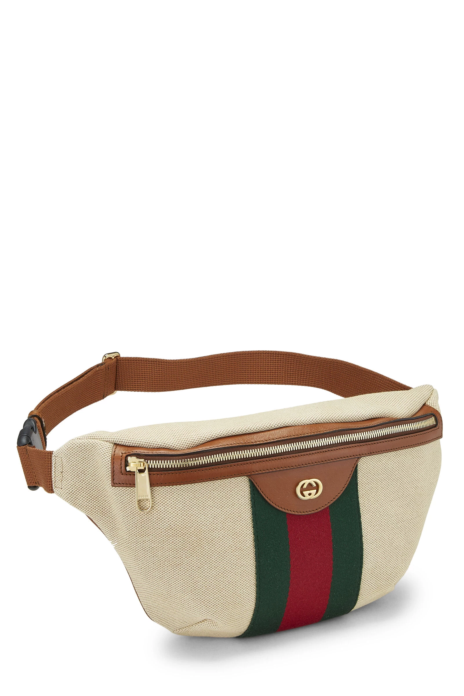 Vintage-inspired Gucci belt bag crafted in beige canvas with brown leather trim, featuring signature red and green striped Web panel and finished with interlocking ‘GG’ logo in gold-tone hardware.