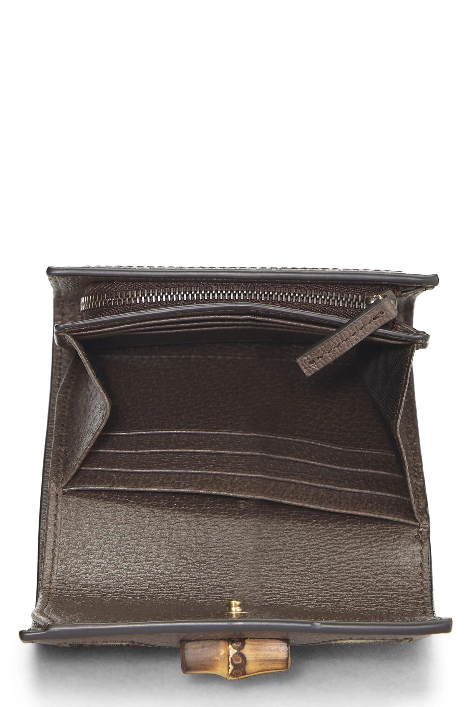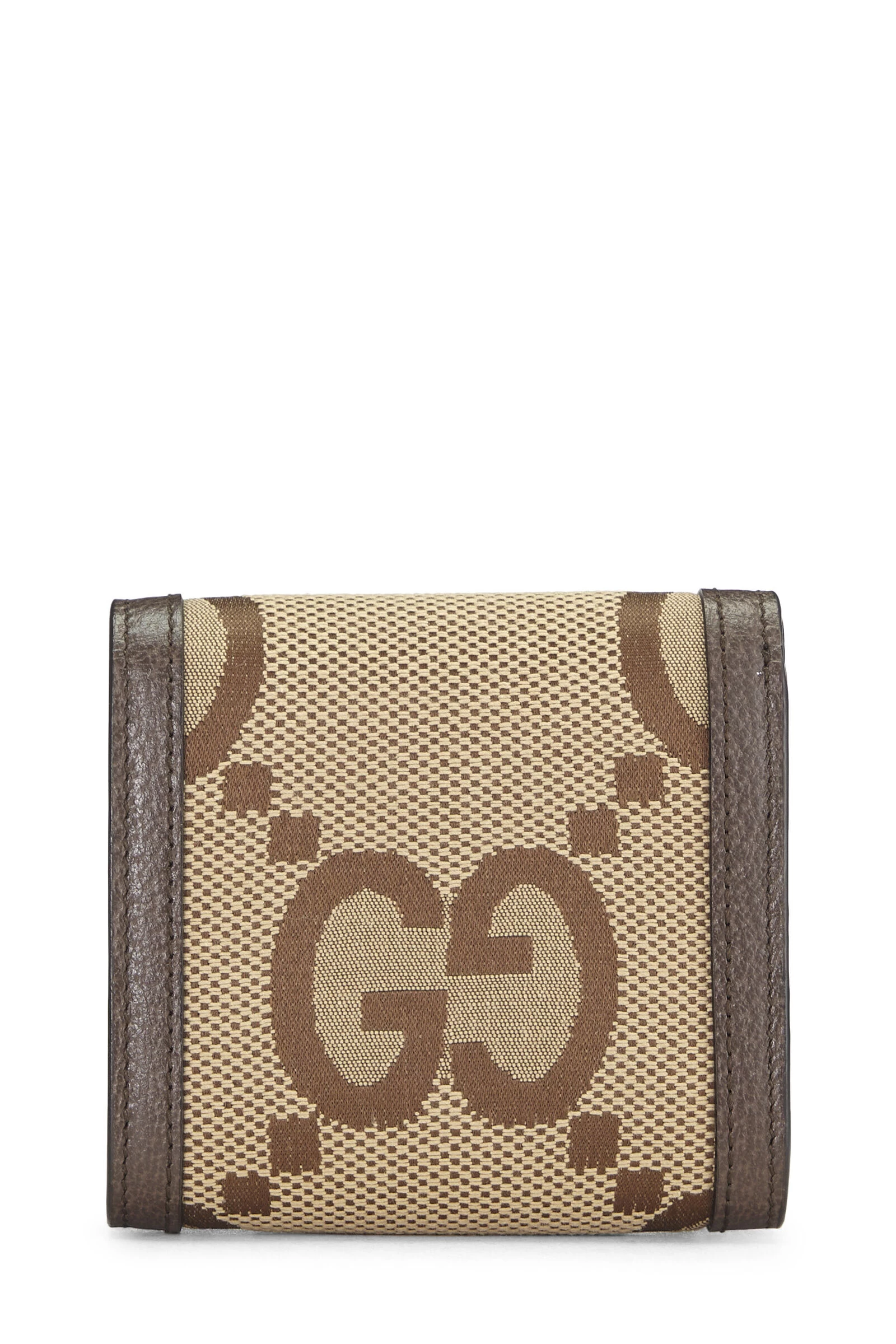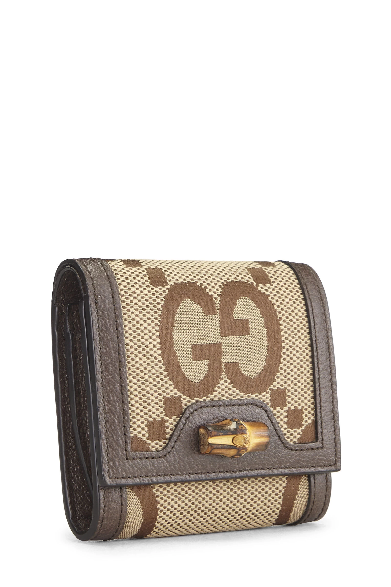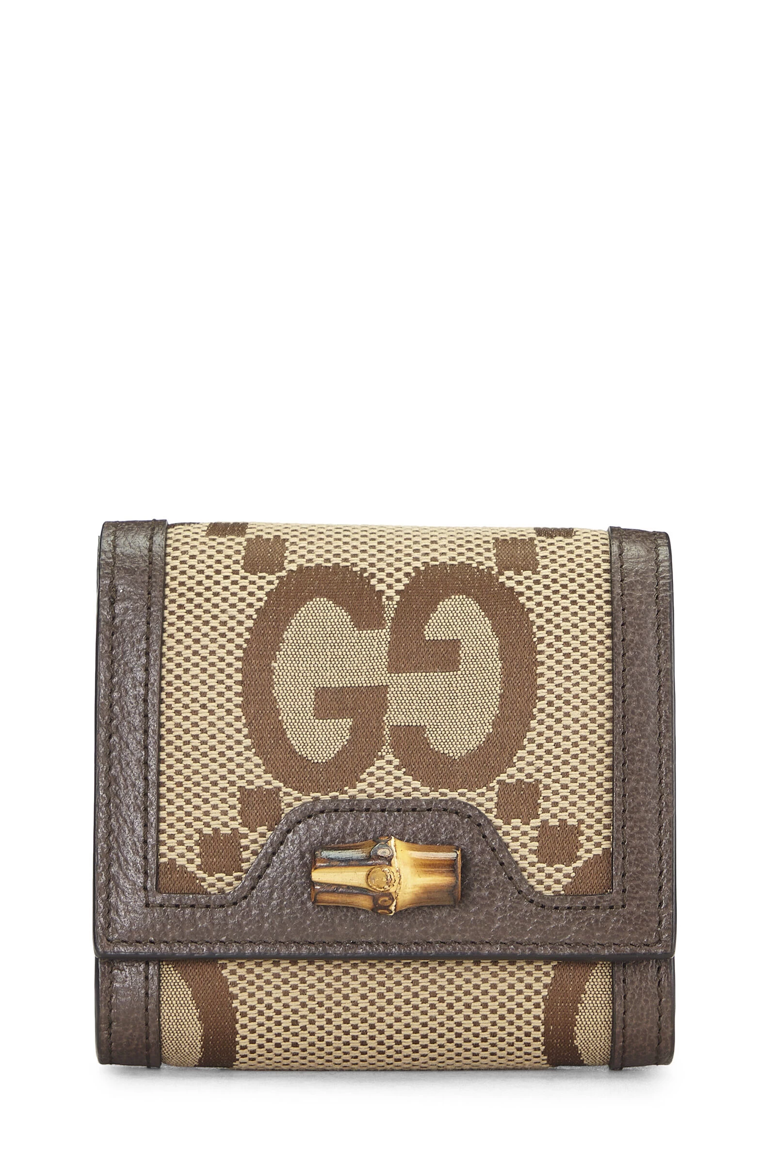 Chic Gucci Diana compact wallet rendered in the house’s Jumbo GG canvas, featuring brown leather trim and gold-tone hardware which includes the iconic bamboo motif.