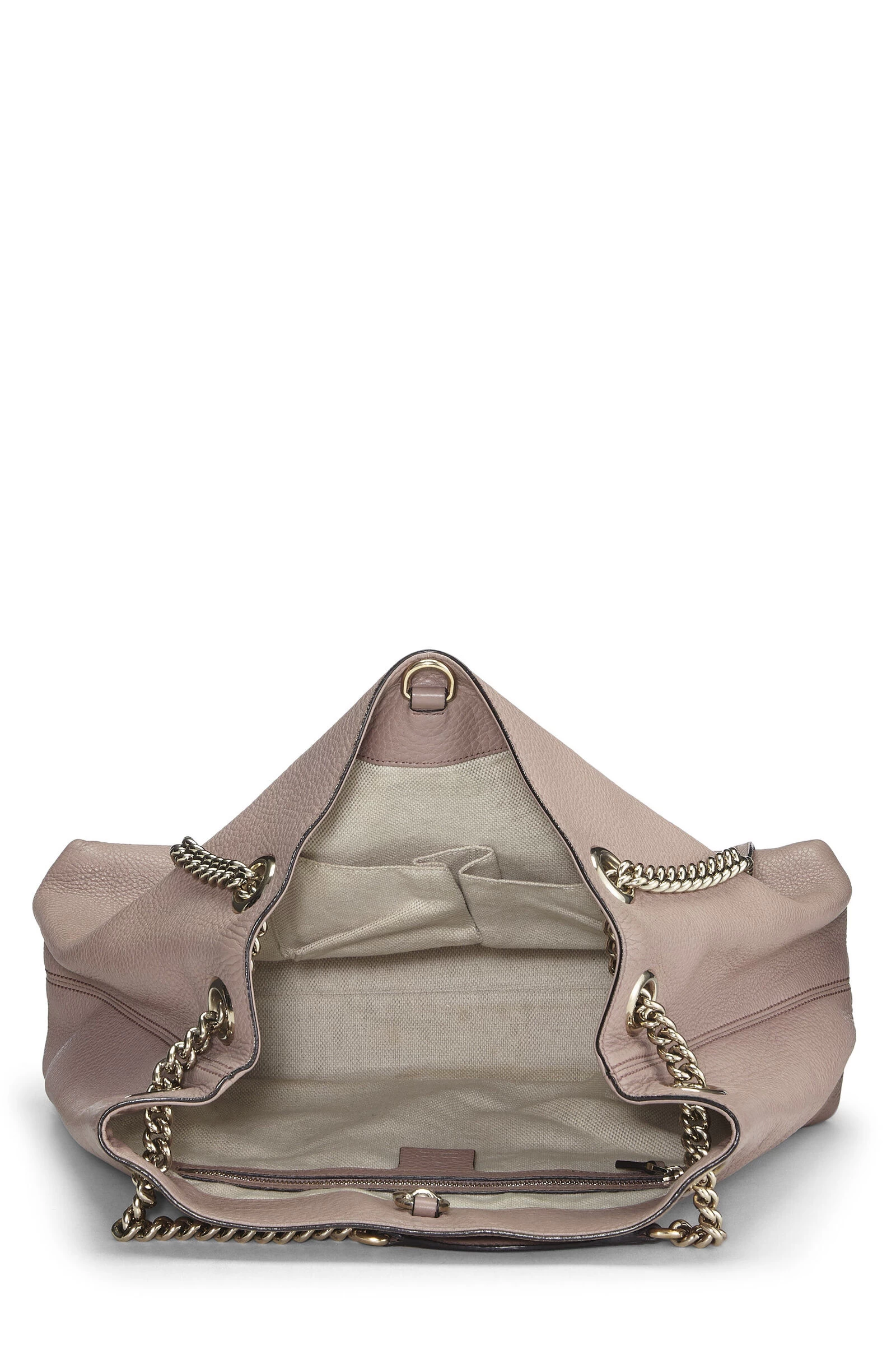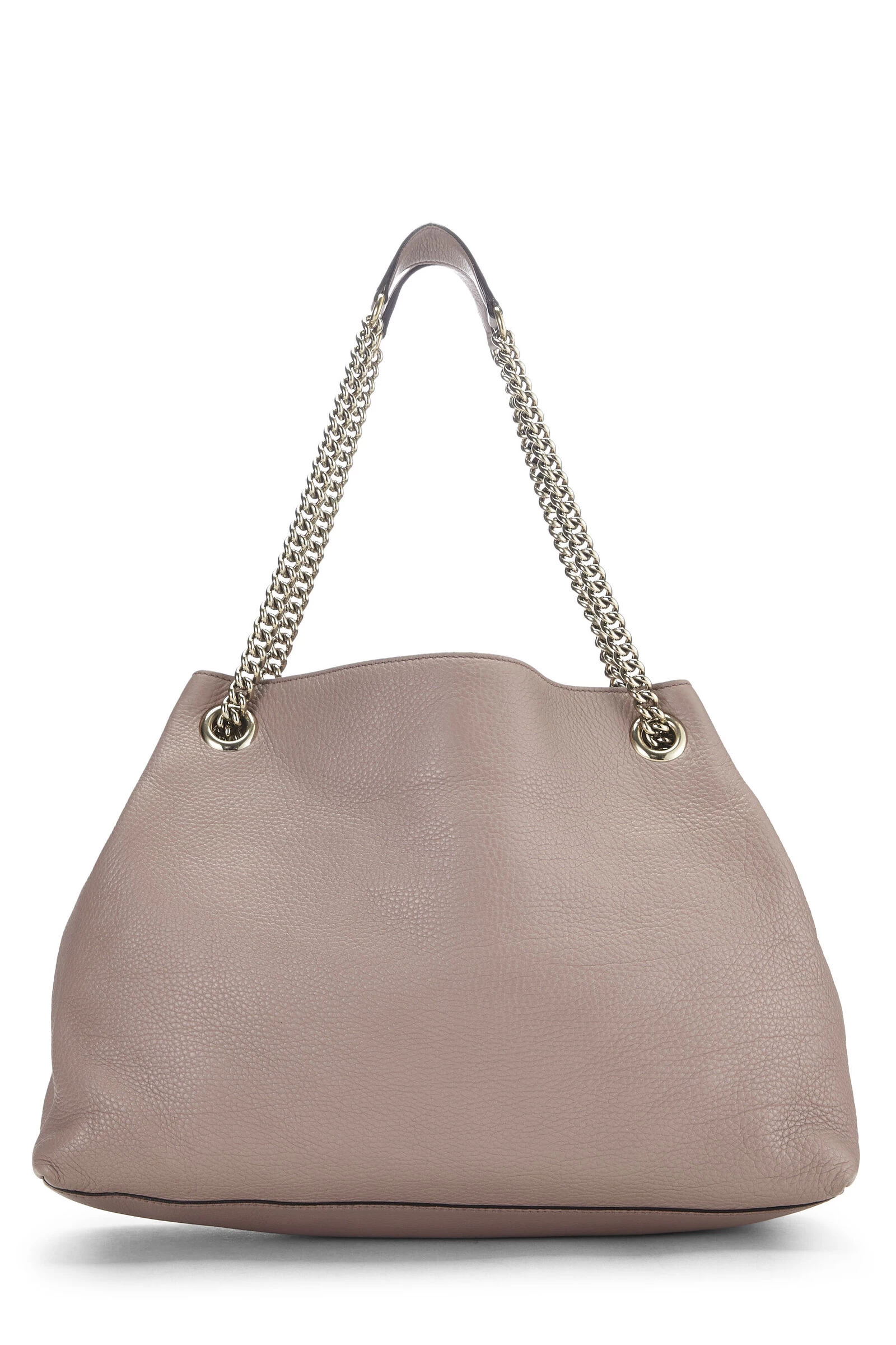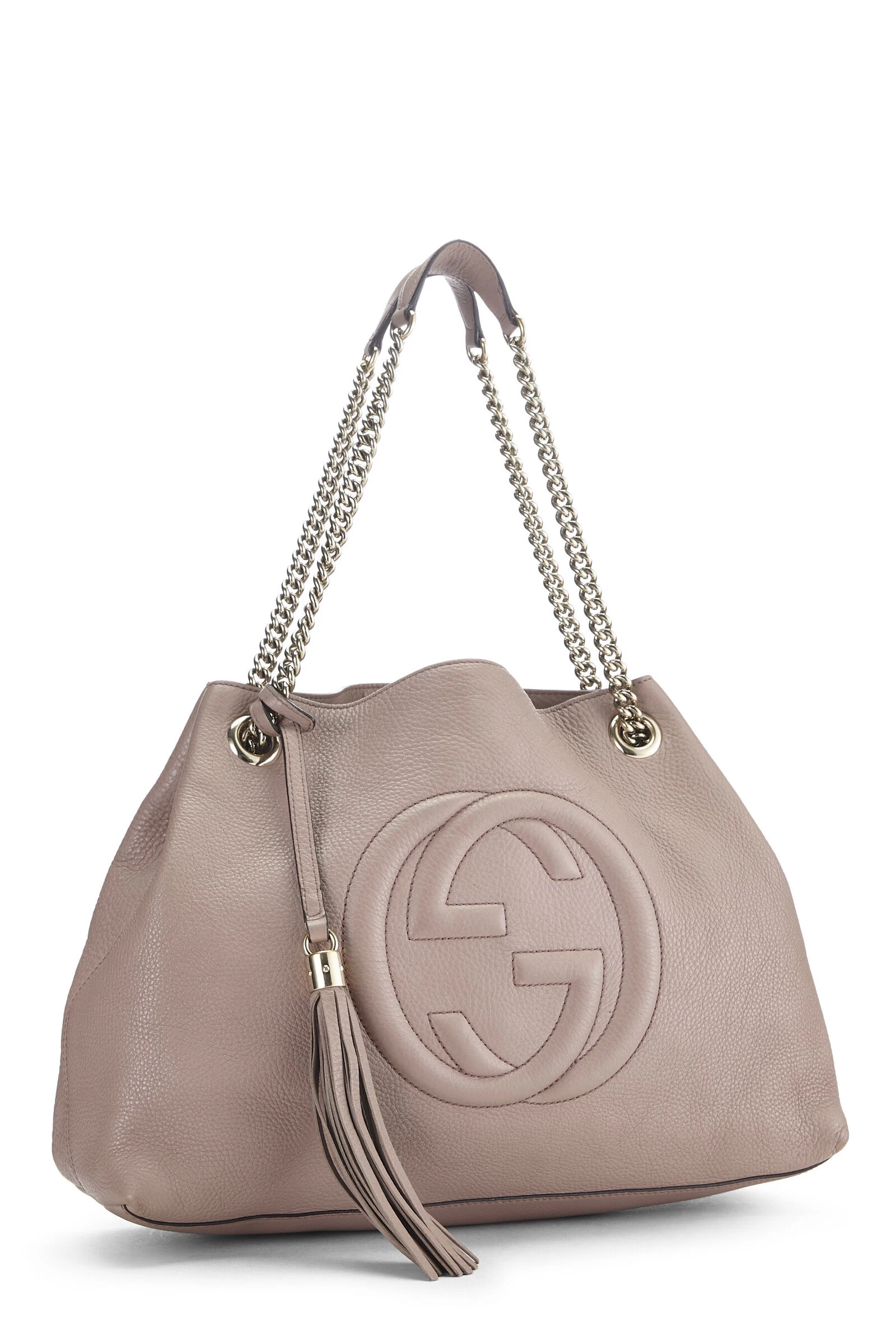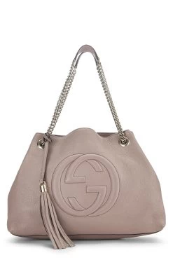 A classic Gucci tote from the Soho collection rendered in beige grained leather, featuring the iconic interlocking ‘GG’ logo embroidered on front, leather tassel embellishment and finished with chain link straps.