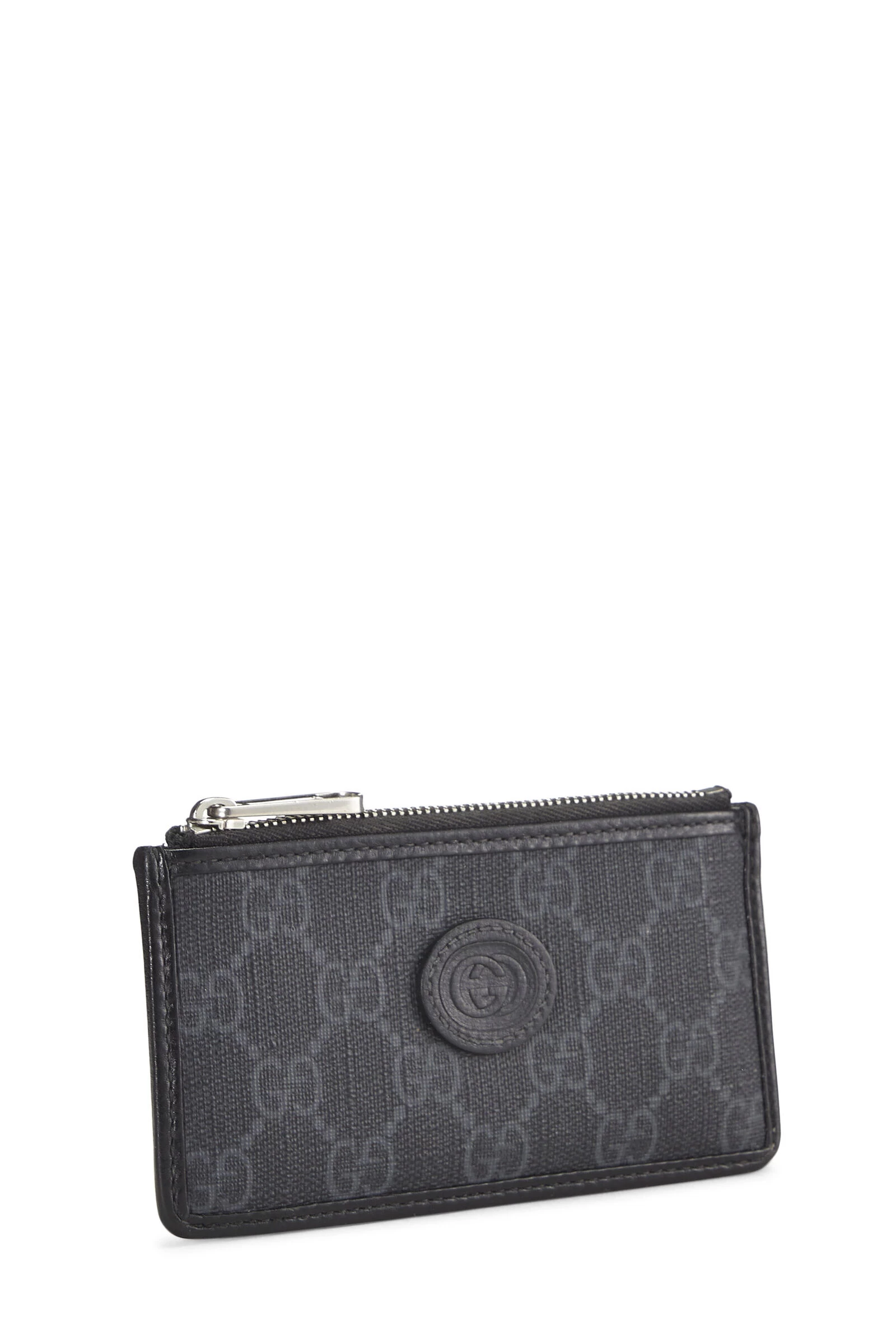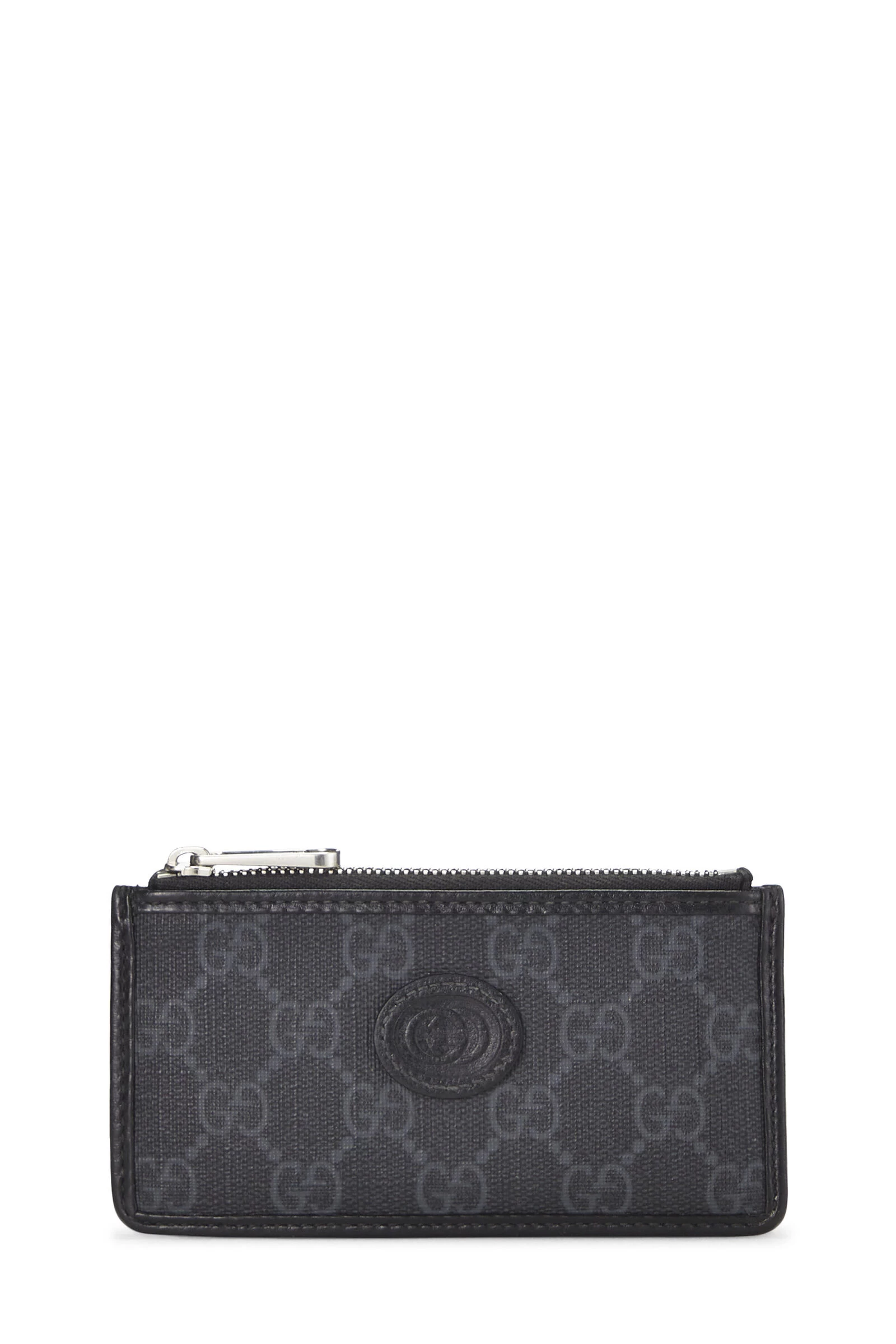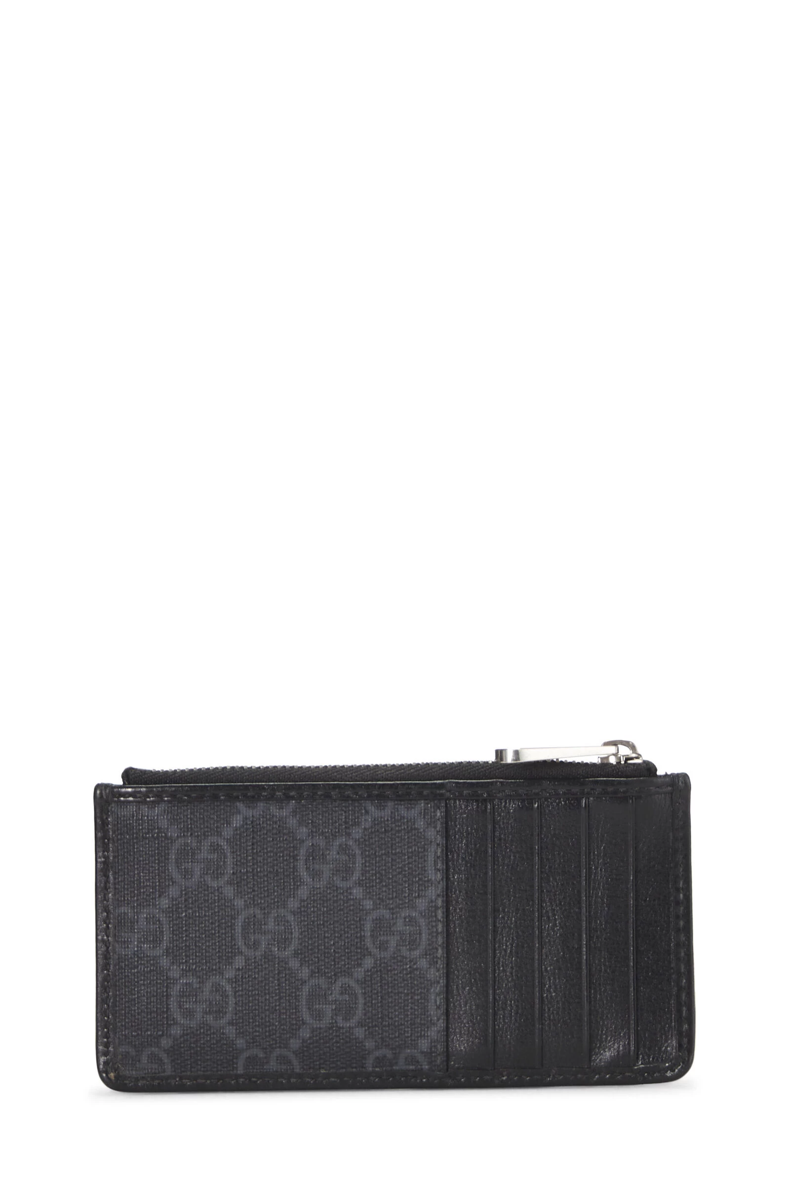 This sleek card case is crafted in black GG Supreme coated canvas with black grained leather trim and finished with silver-tone hardware.