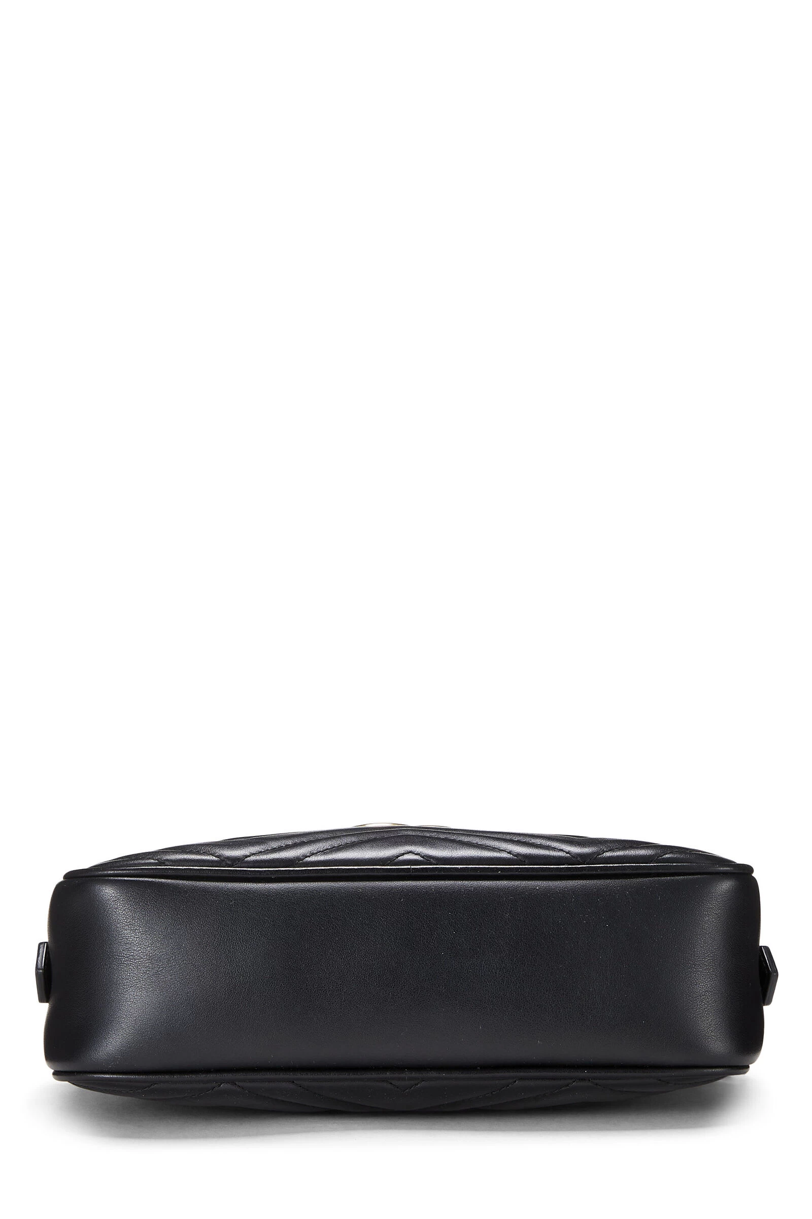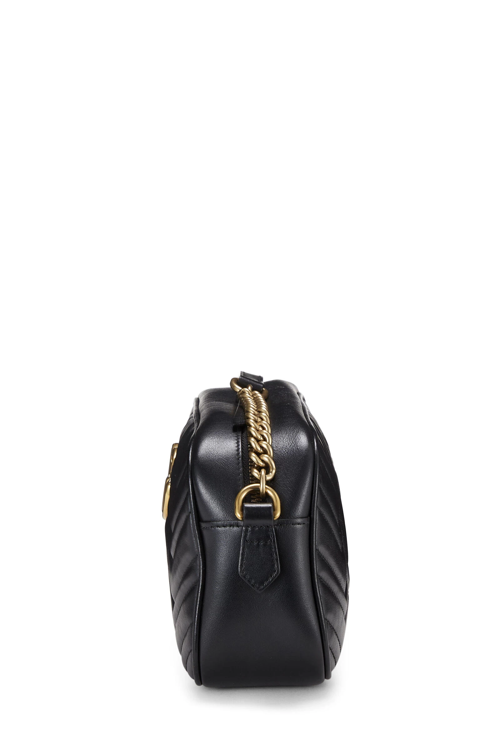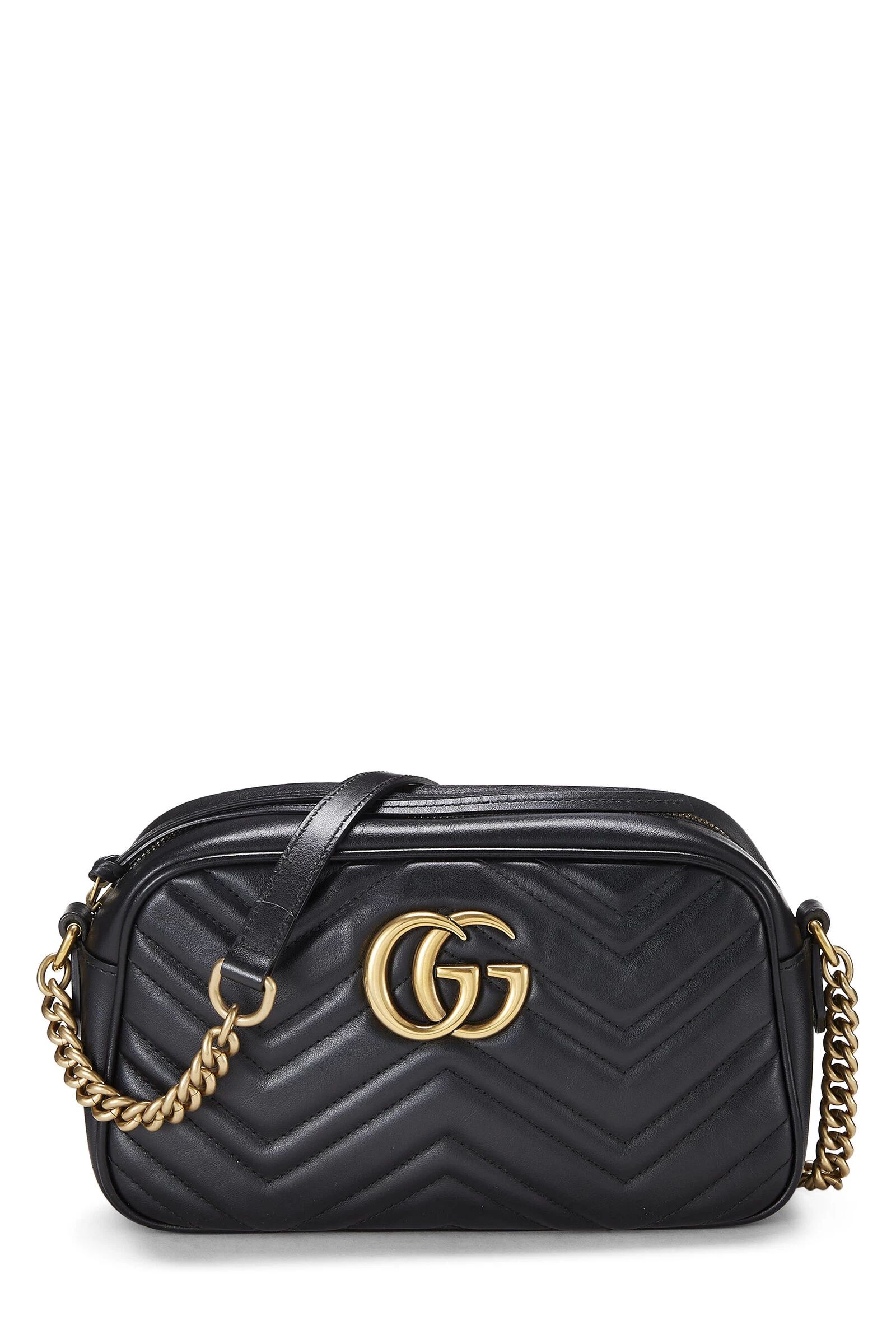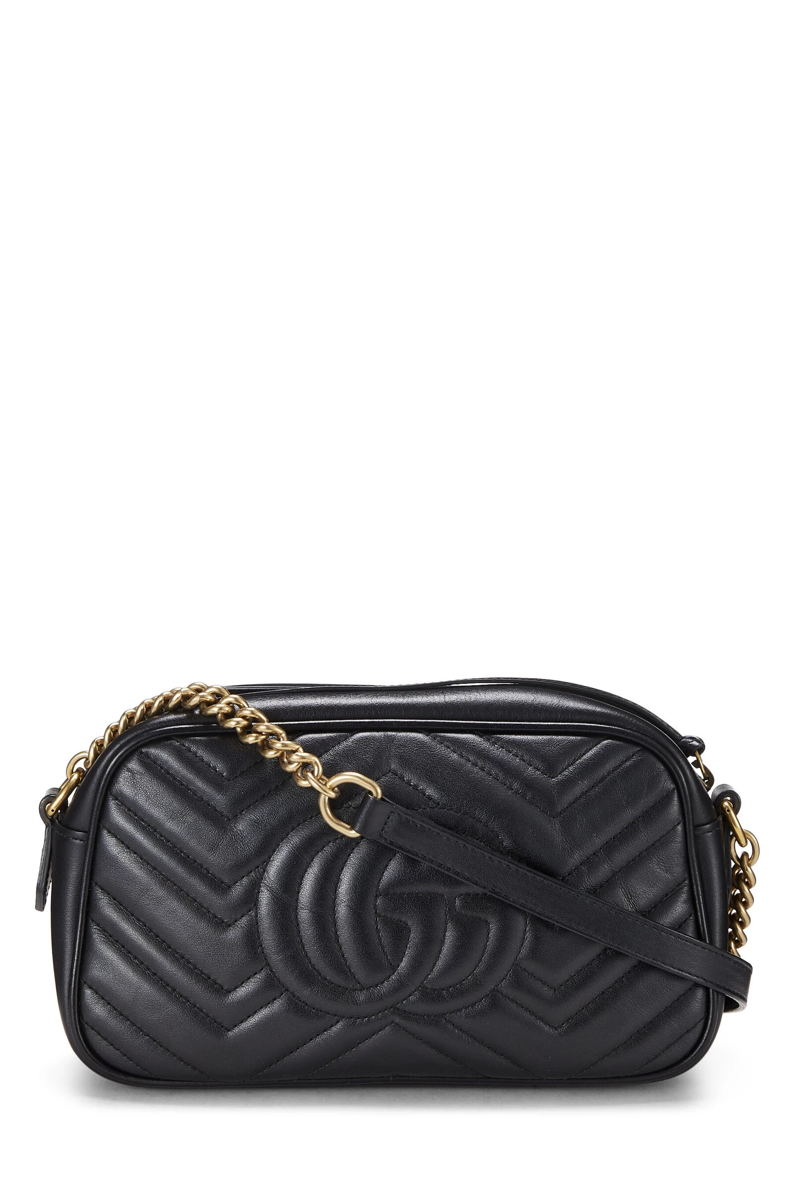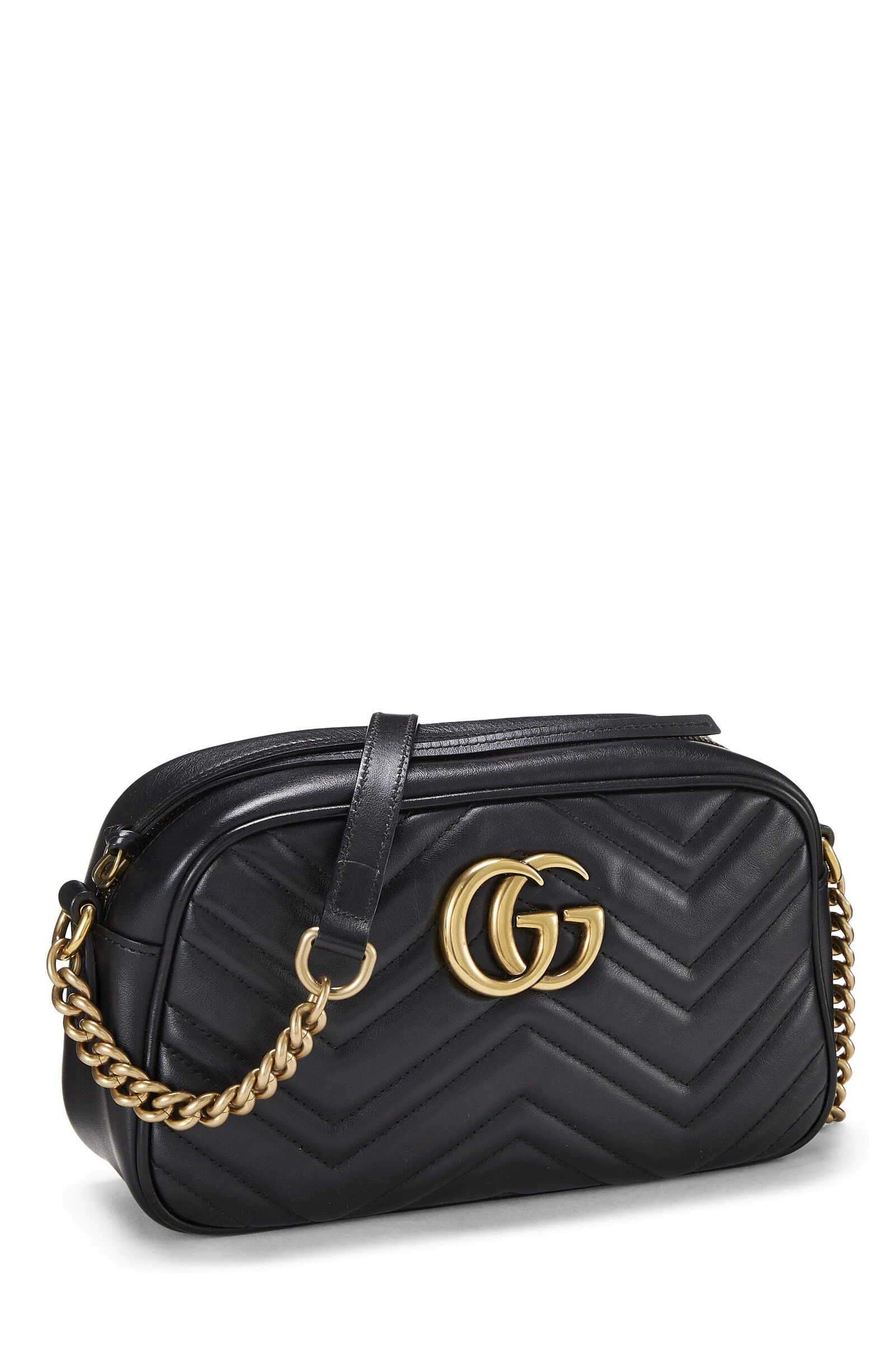 Compact Gucci Marmont small crossbody bag rendered in classic black chevron-quilted leather and featuring a gold-tone running GG logo- both signatures of the Marmont collection.