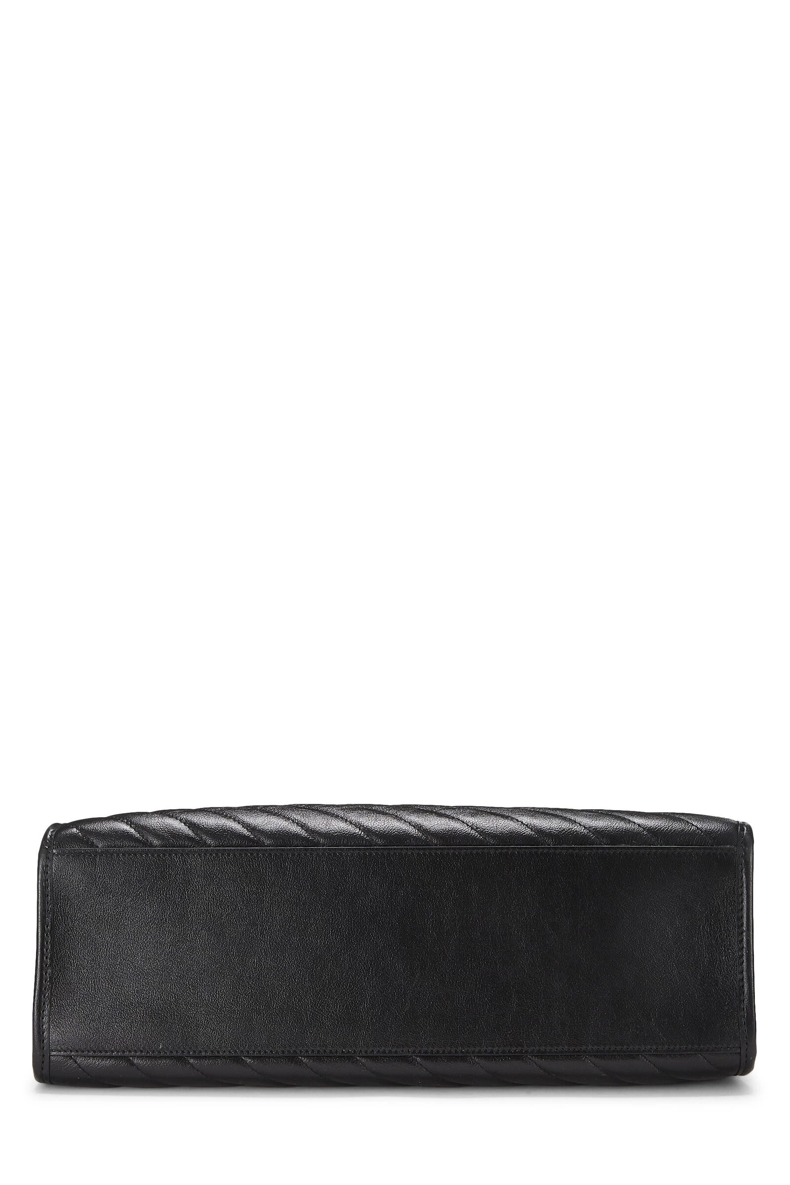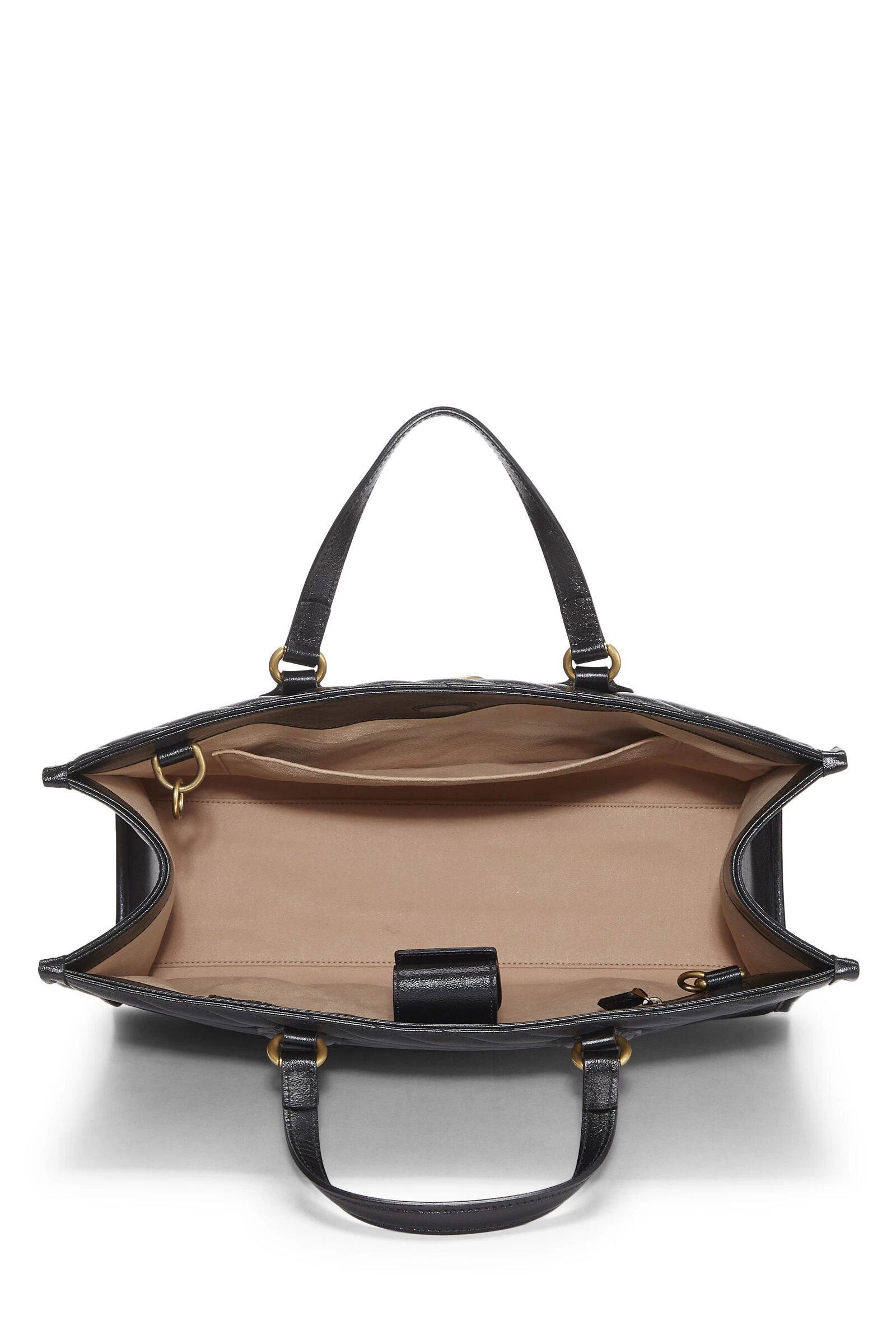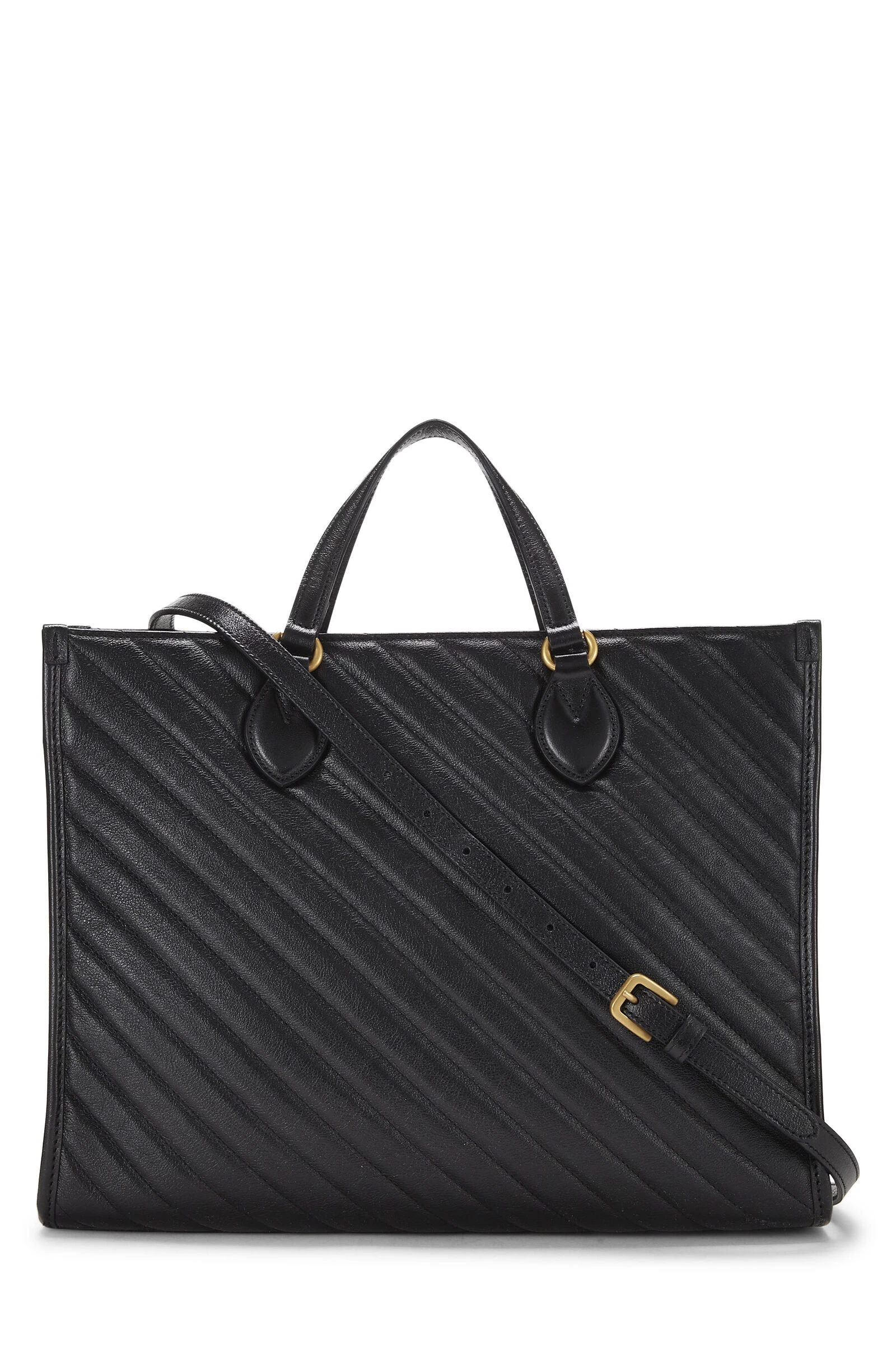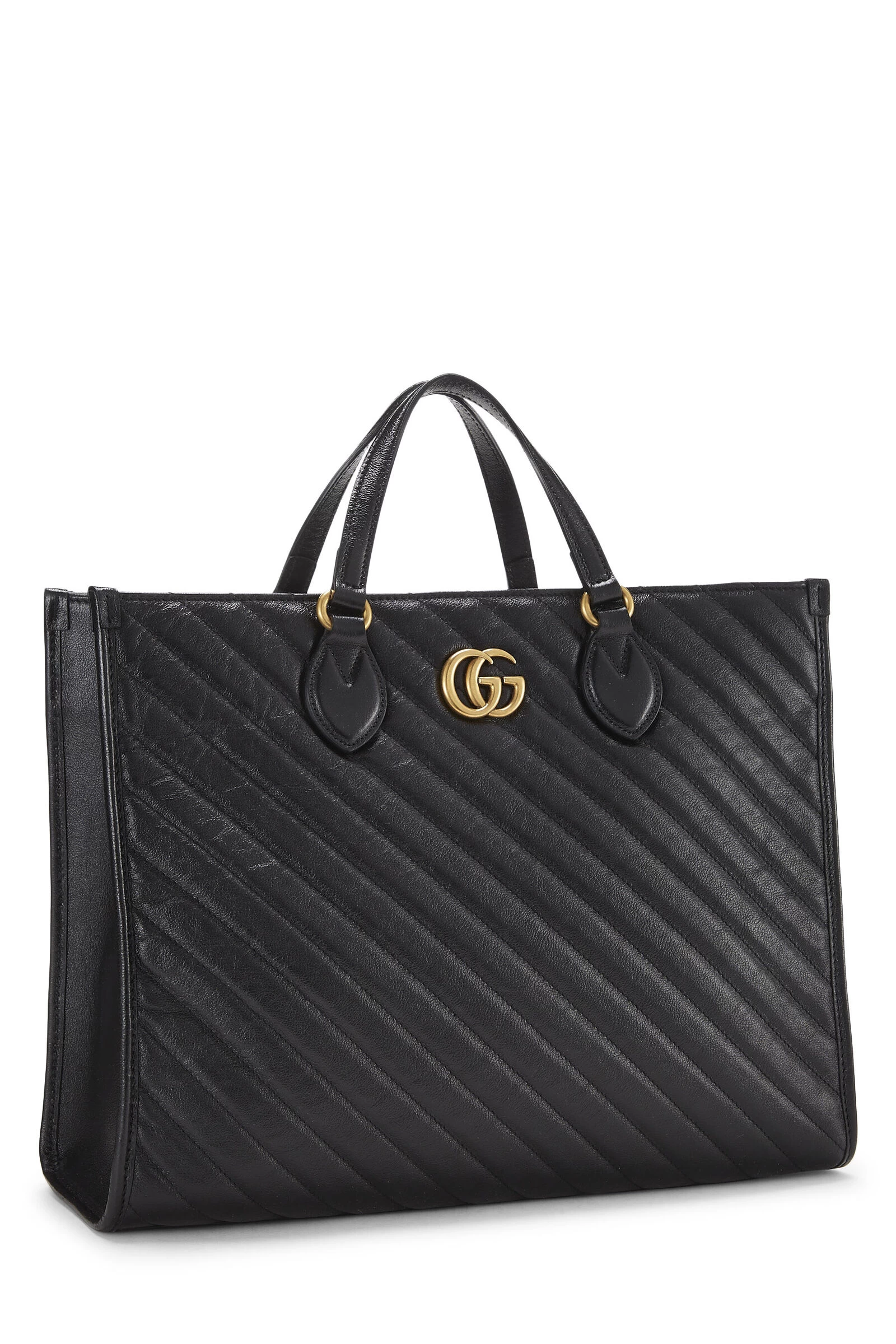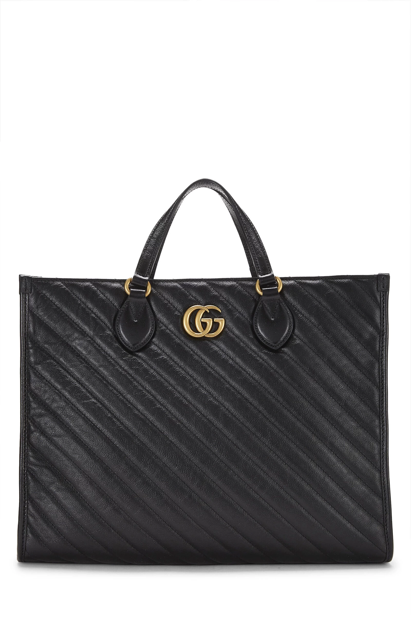 Classic top handle bag from Gucci’s Marmont collection, rendered in chevron-quilted black leather and featuring Running ‘GG’ logo hardware on the front flap. In addition to the top handle, this bag includes an optional shoulder strap for versatile carry.