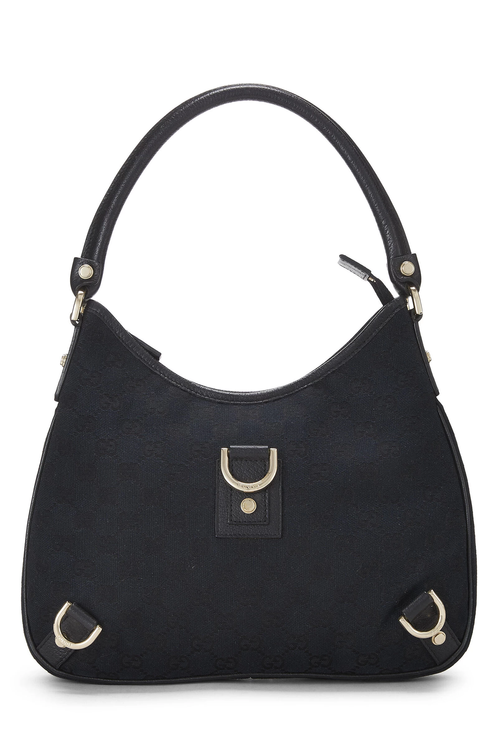 Classic Gucci Abbey hobo bag rendered in black GG canvas, featuring tonal grained leather trim and gold-tone D-ring hardware.
