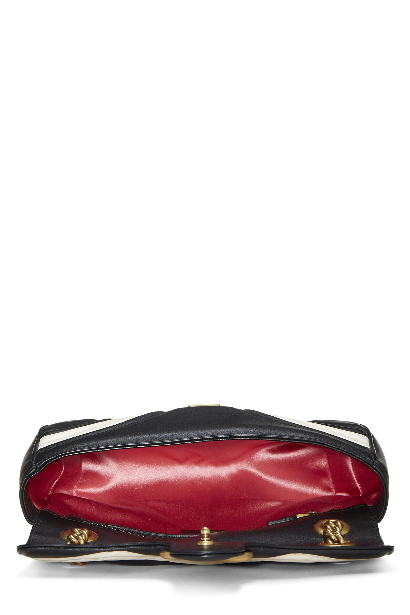 Compact and durable Gucci Marmont shoulder bag rendered white & black chevron matelassé leather featuring a gold-tone running GG accent – both signatures of the Marmont collection.