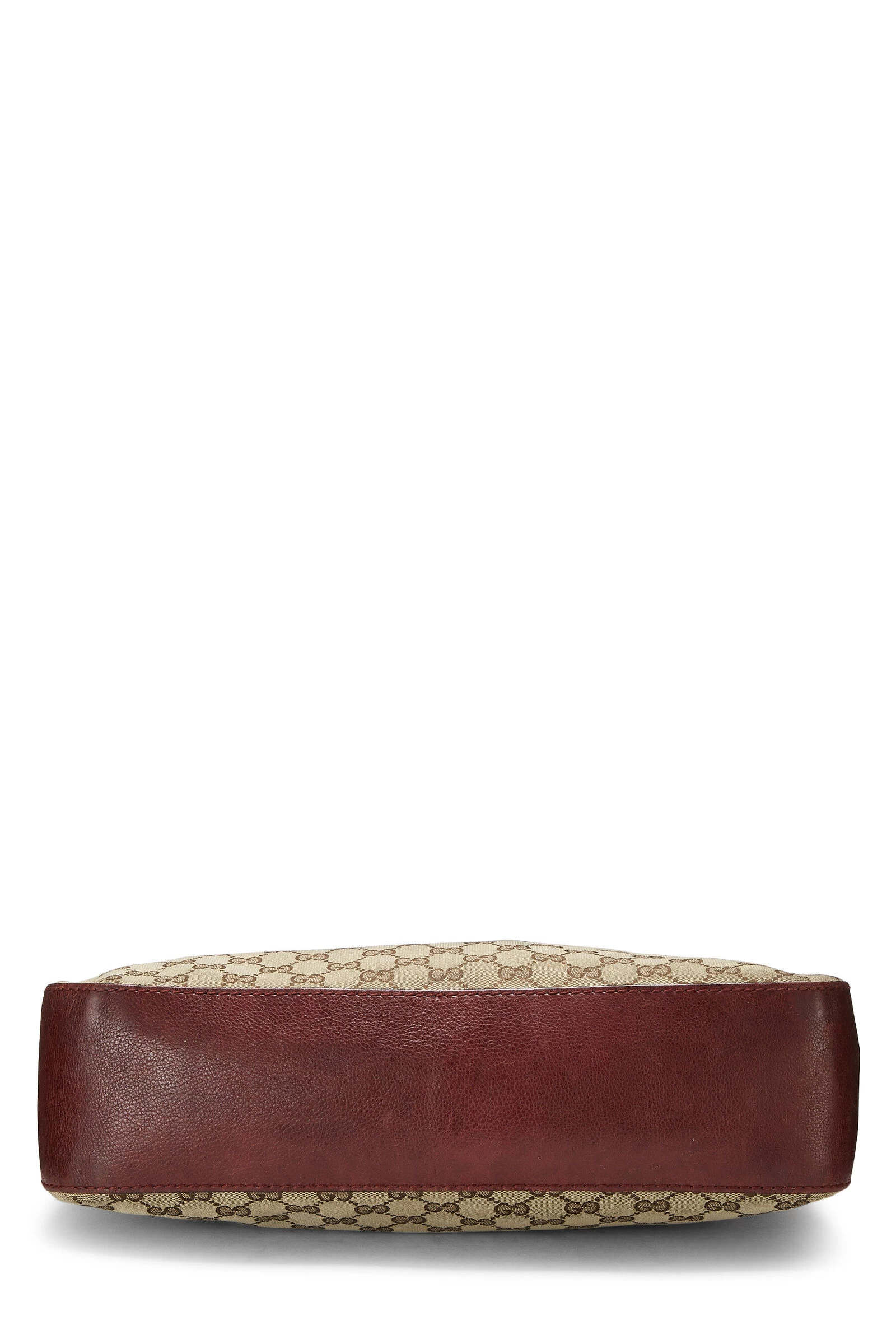 Sleek and spacious Gucci Marrakech Hobo crafted in GG canvas, featuring braided burgundy leather trim and adjustable shoulder strap.