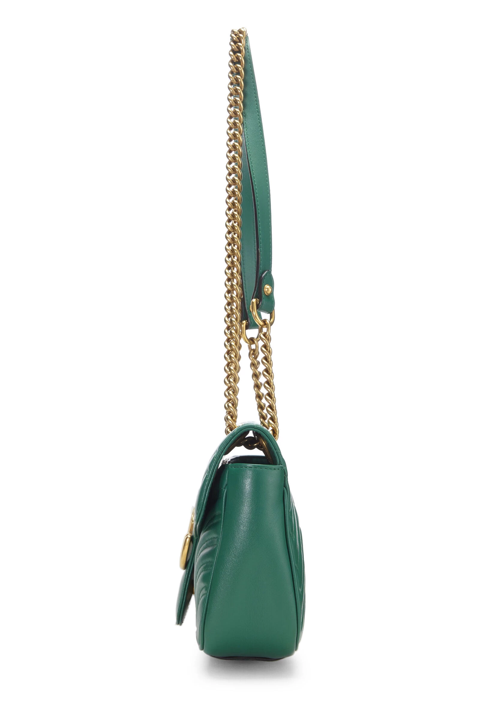 Small Gucci Marmont shoulder bag rendered in green Matelasse chevron-quilted leather and accented with gold-tone running GG logo – both signatures of the Marmont collection.