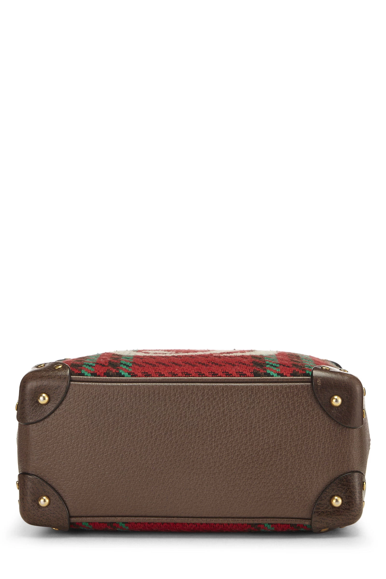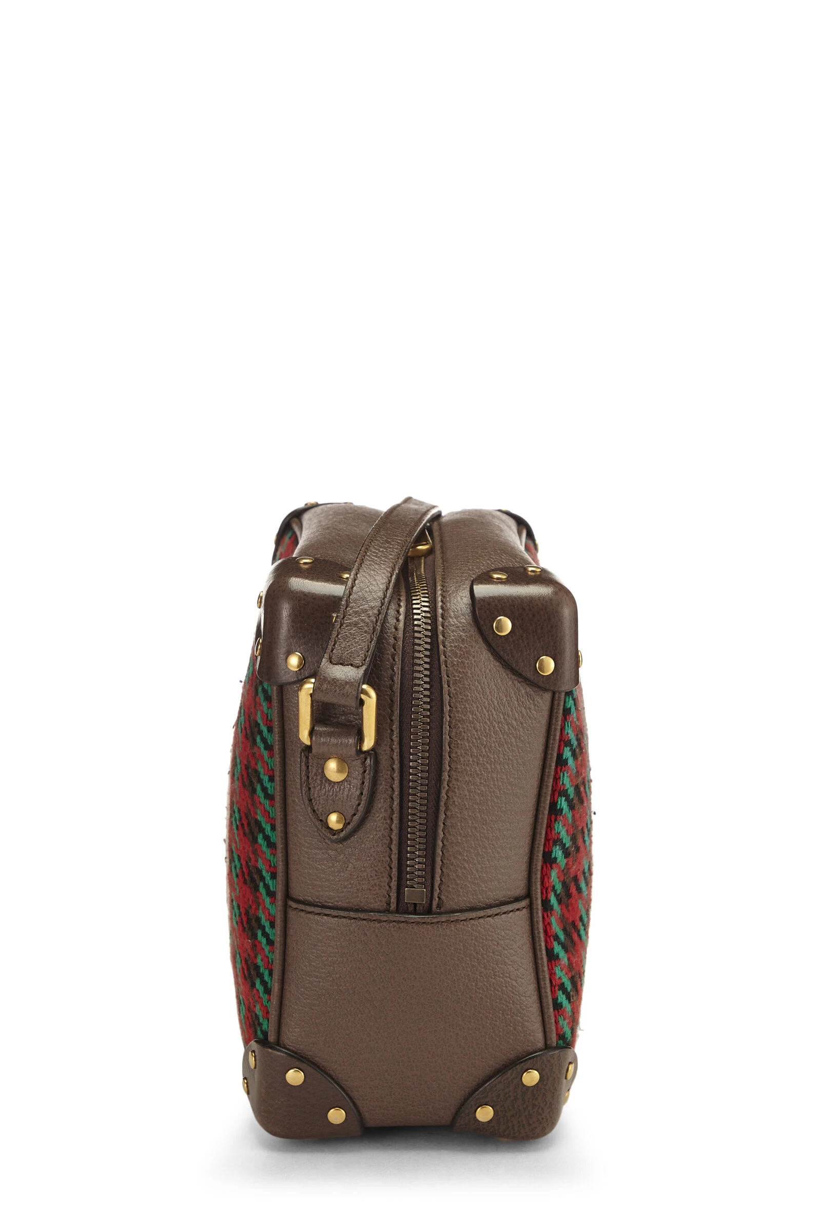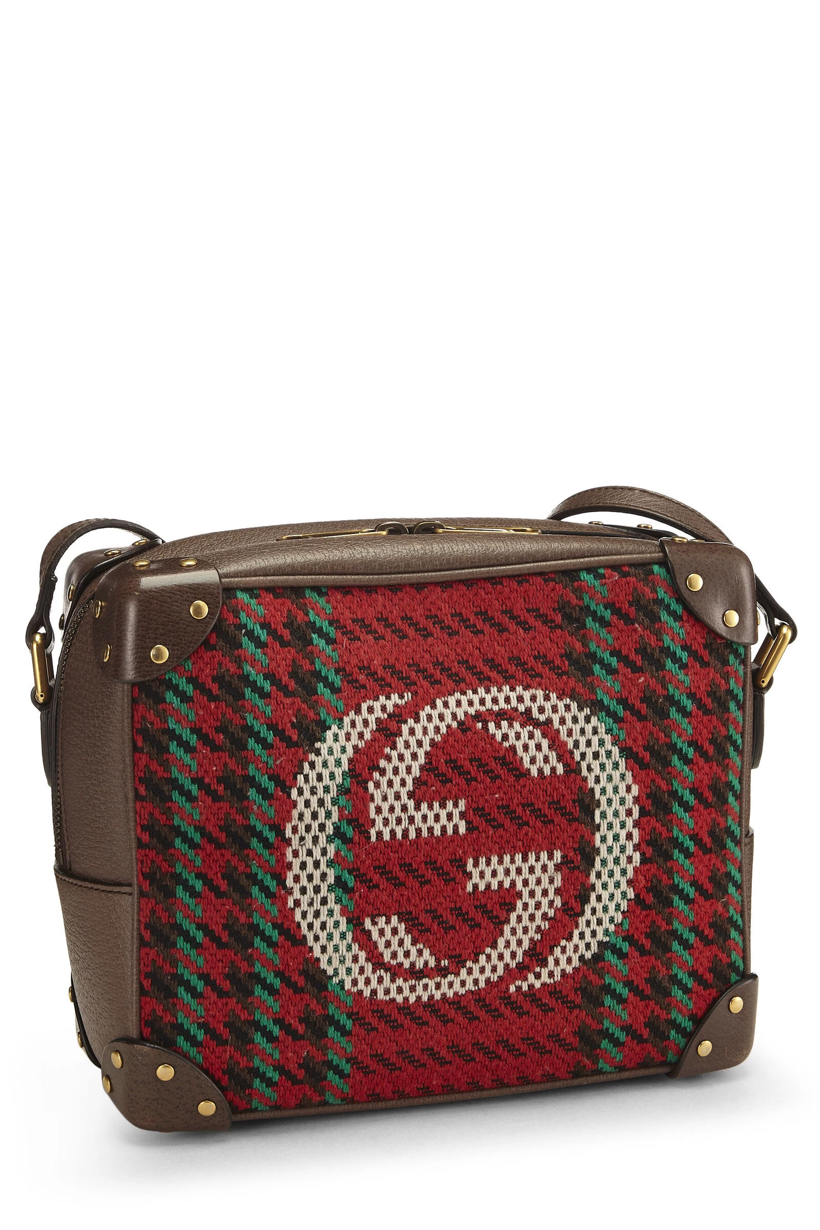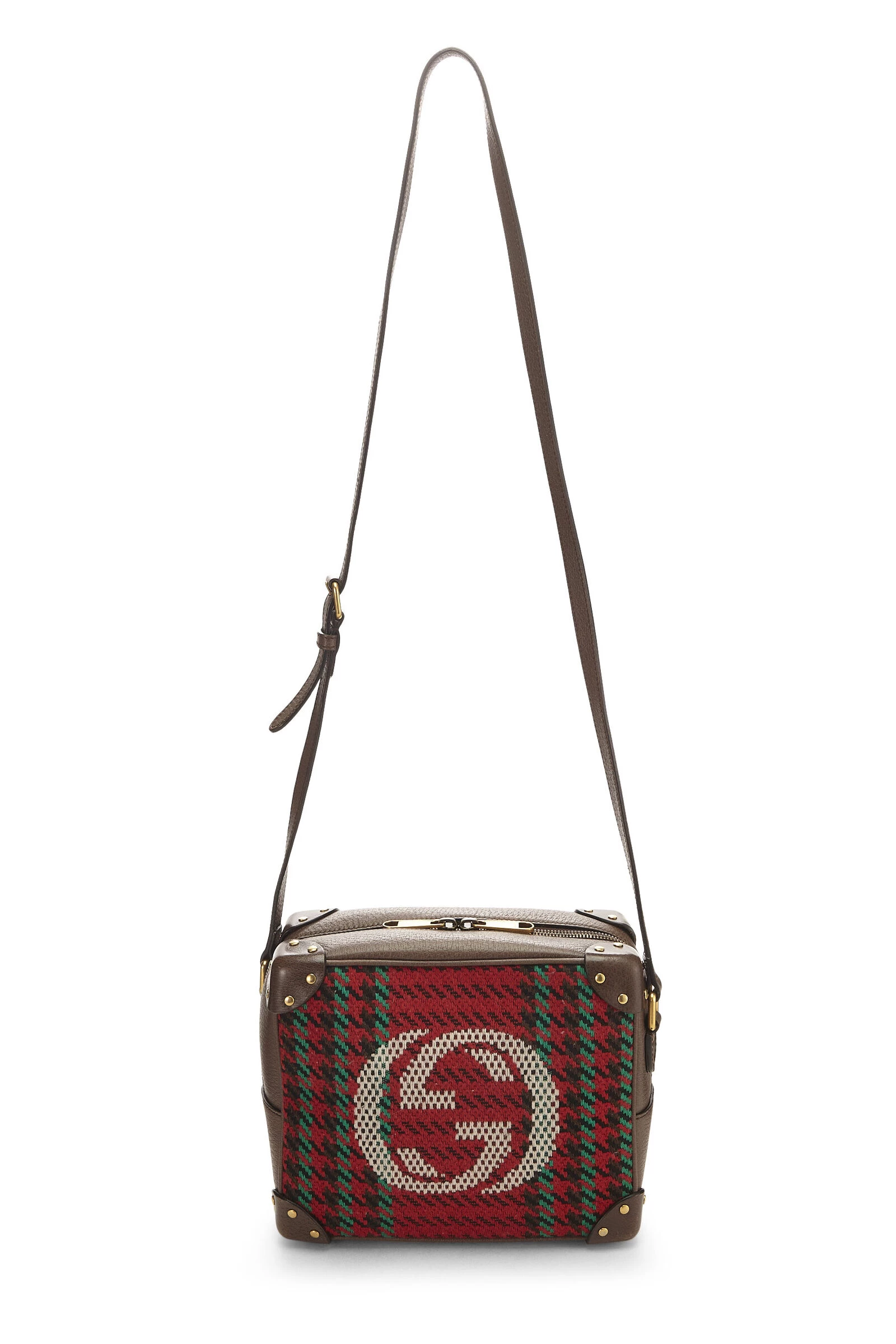 Vintage-inspired and finely crafted, this chic Gucci bag is ready to accompany you on your next outing. Rendered in a mix of wool and leather, this bag features the fabrication of wool houndstooth paneling in a mix of green, red and brown. The wool paneling features an intarsia pattern of Gucci’s iconic interlocking ‘GG’ in contrasting white stitching. The bag is trimmed with deep brown leather and is finished with gold-tone hardware. Unzip the bag to reveal a contrasting red canvas lining with an interior zipper to ensure safe carry for your personal belongings.