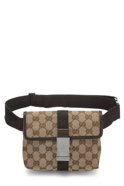 Sleek belt bag rendered in Gucci’s signature GG Canvas, accented with brown leather trim and silver-tone hardware.