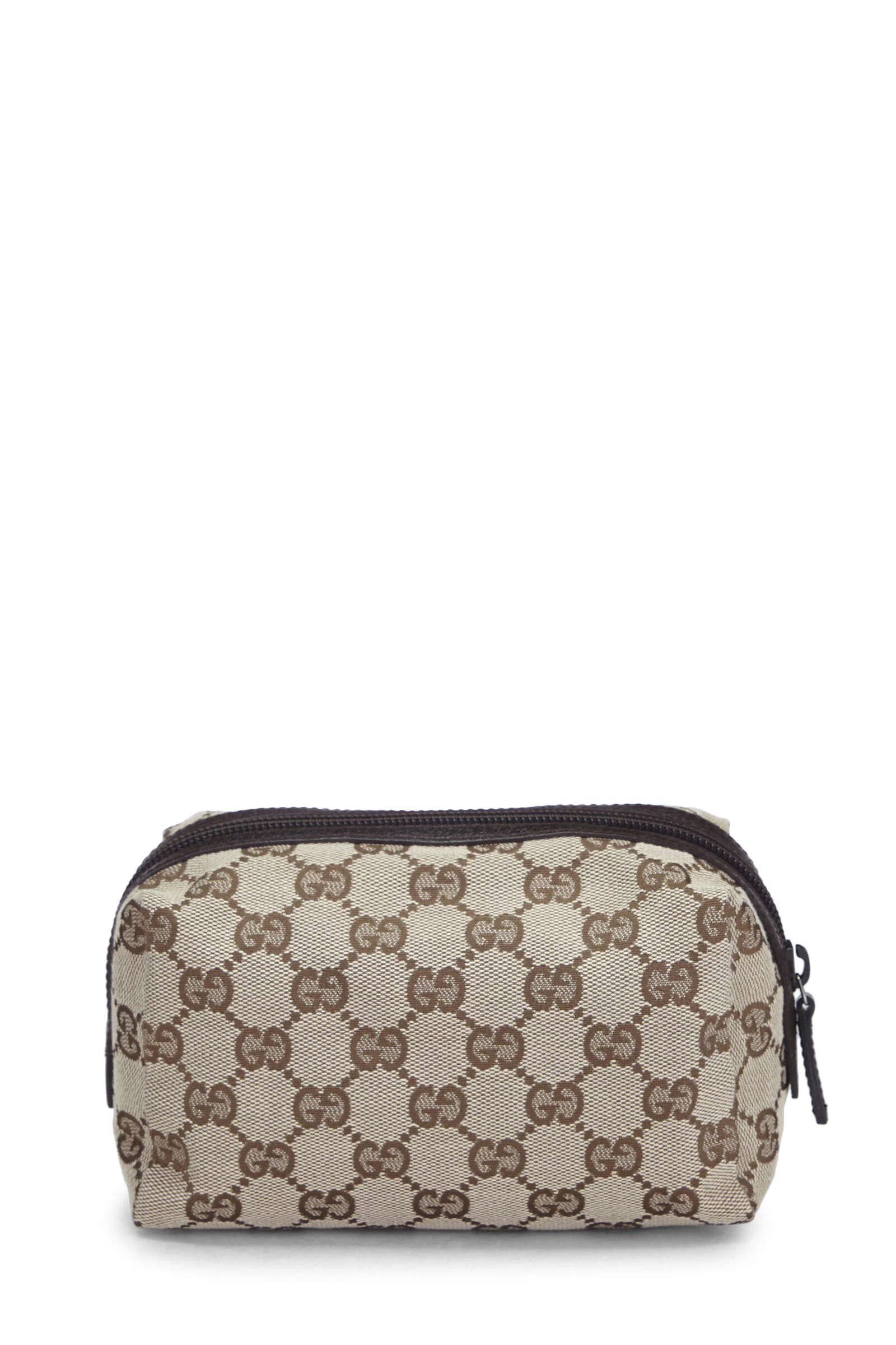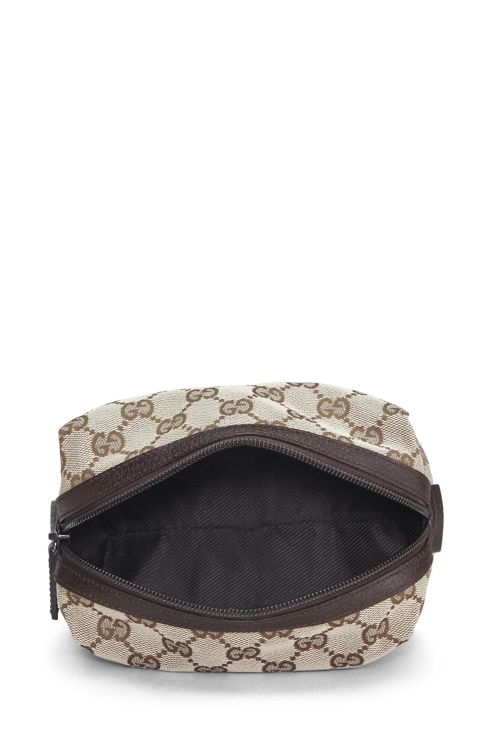 Classic Gucci cosmetic pouch crafted in Original GG Canvas and finished with brown grained leather trim and silver-tone hardware.