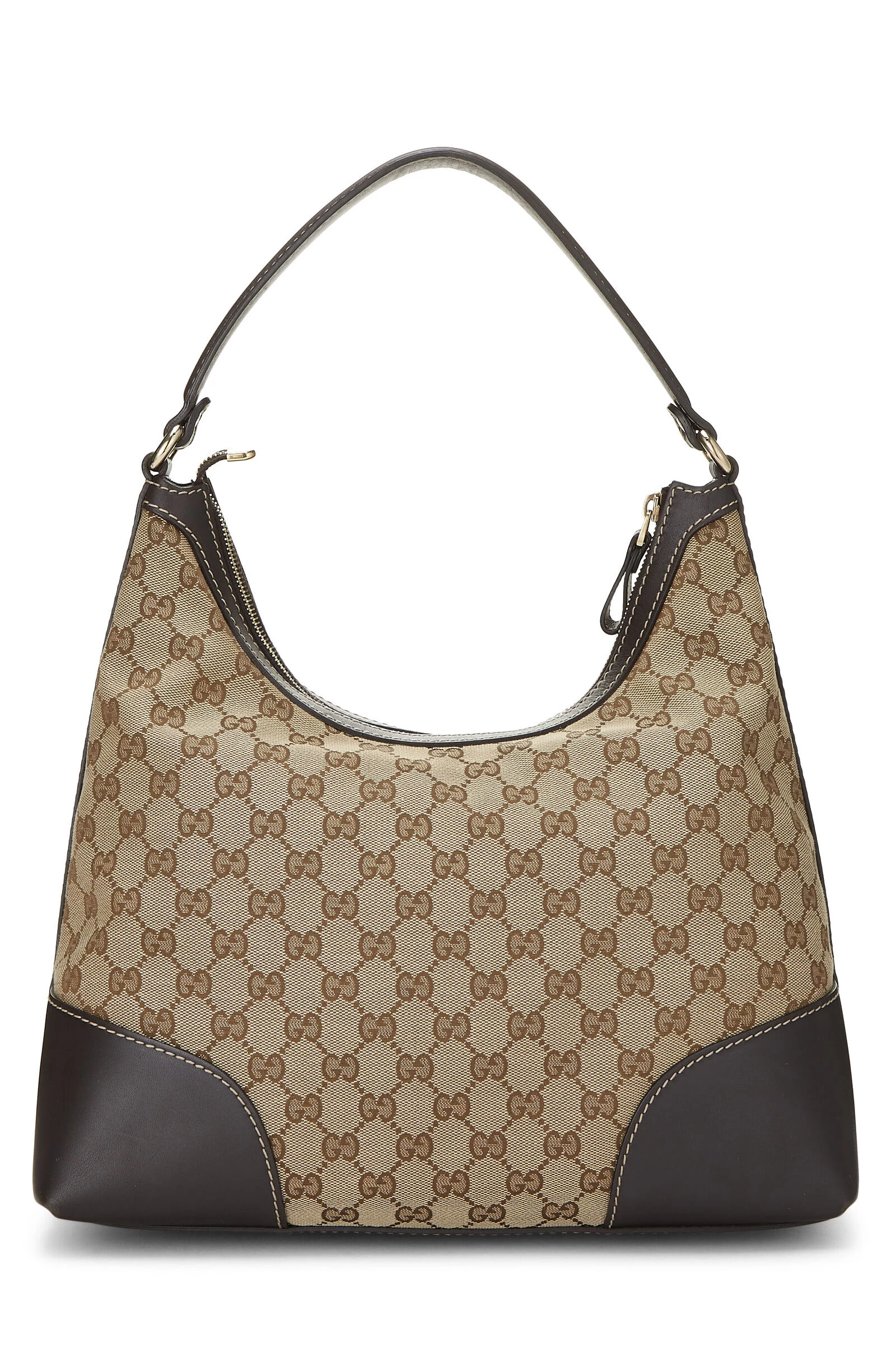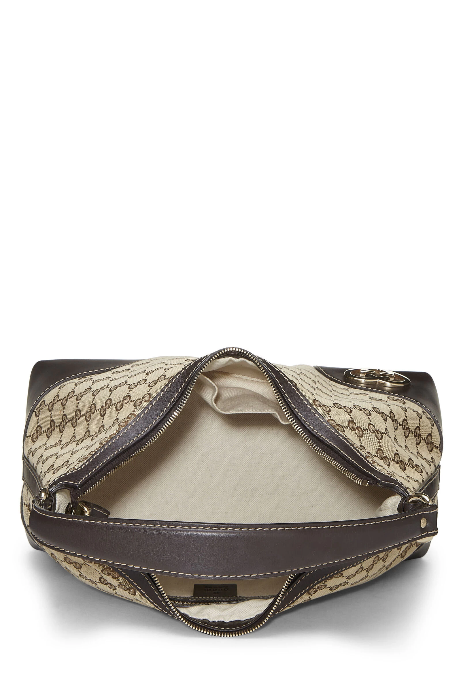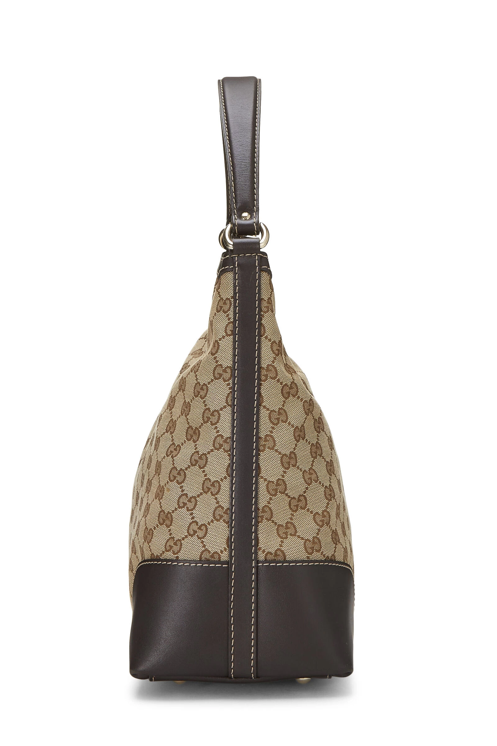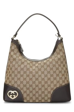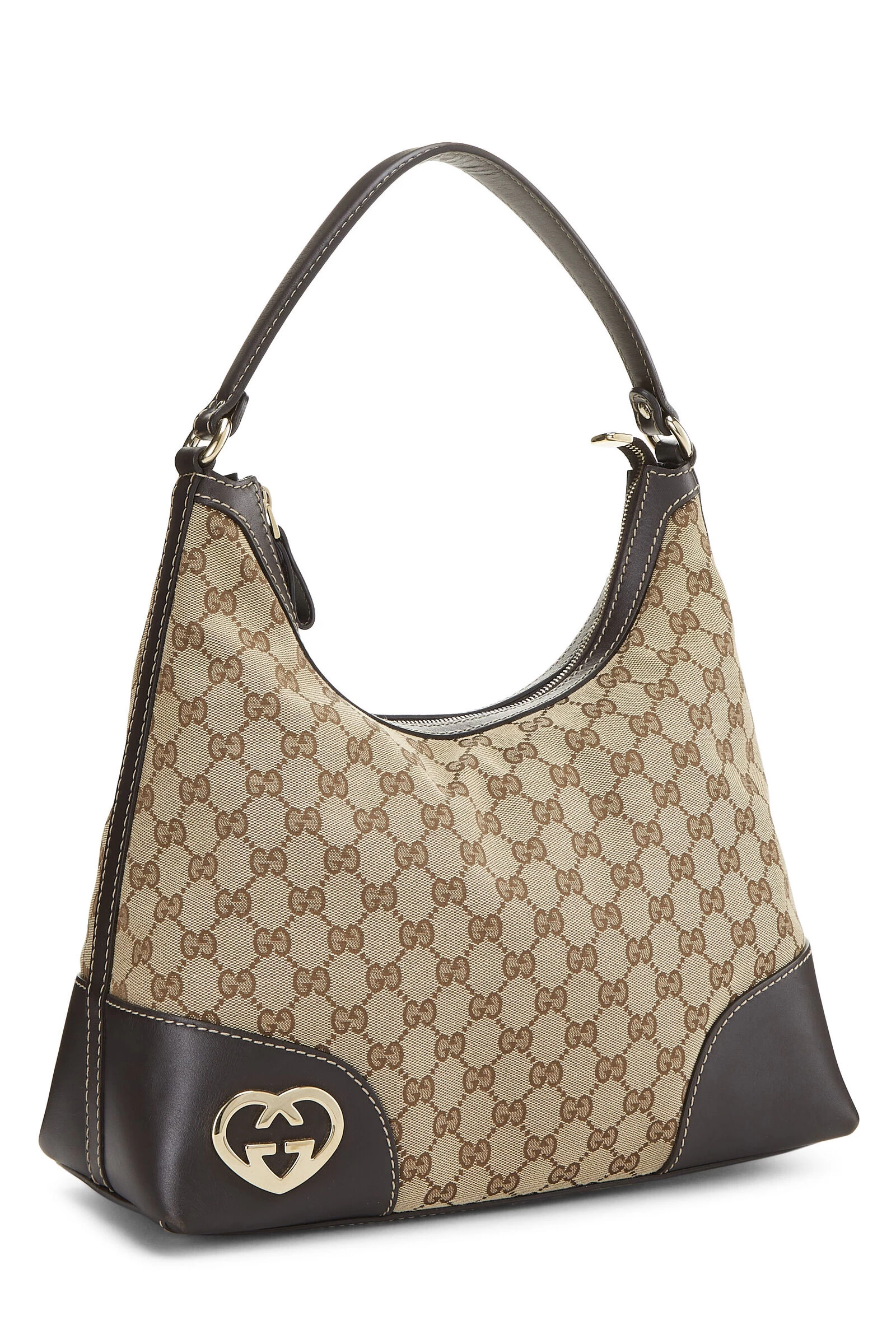 Classic Gucci Lovely Heart hobo in beige Original GG canvas trimmed with brown leather trimming, and adorned with gold-tone hardware.
