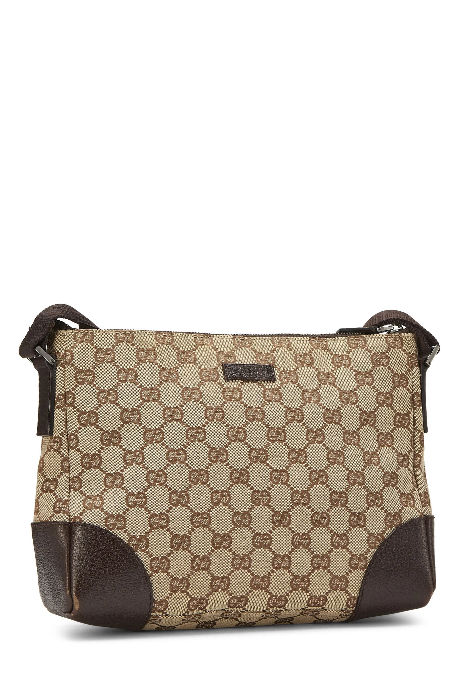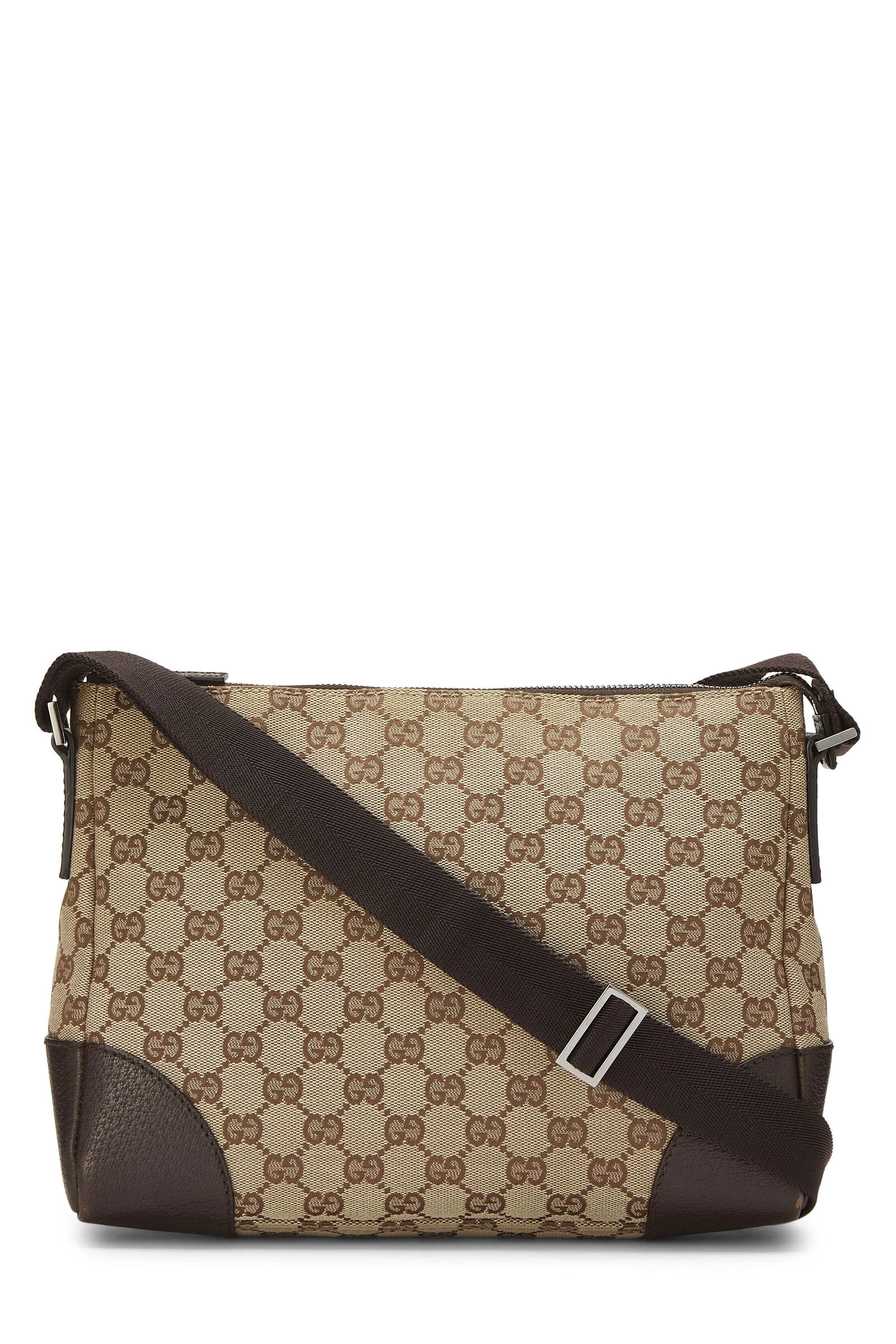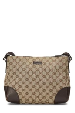 Sleek messenger bag rendered in Gucci’s iconic GG Canvas, trimmed with brown leather and accented with silver-tone hardware.