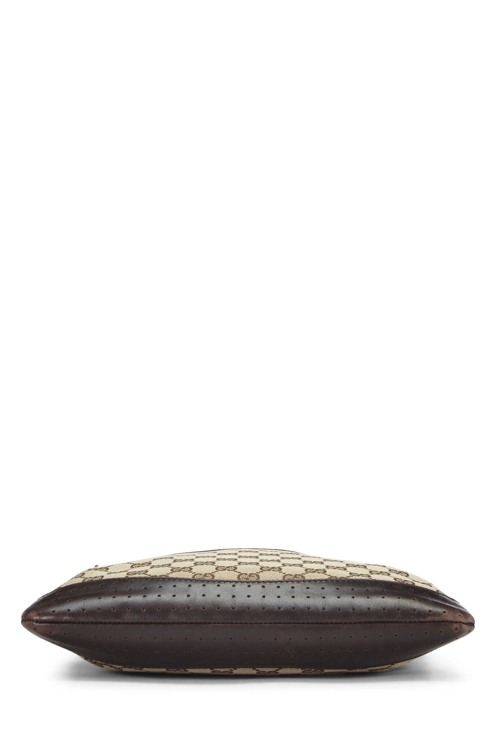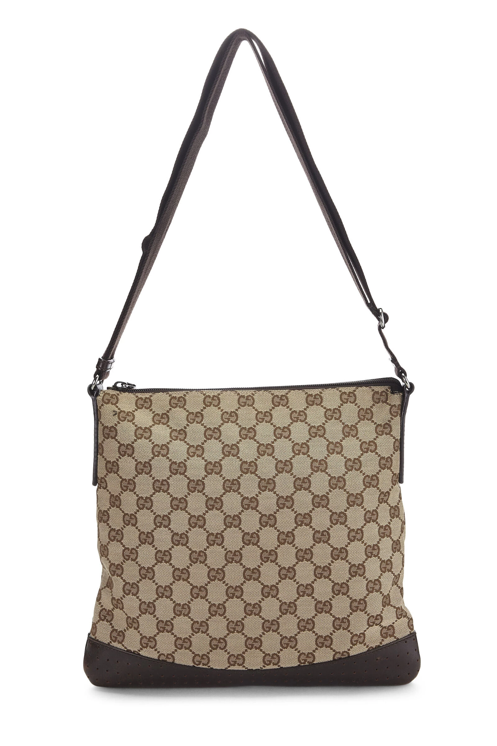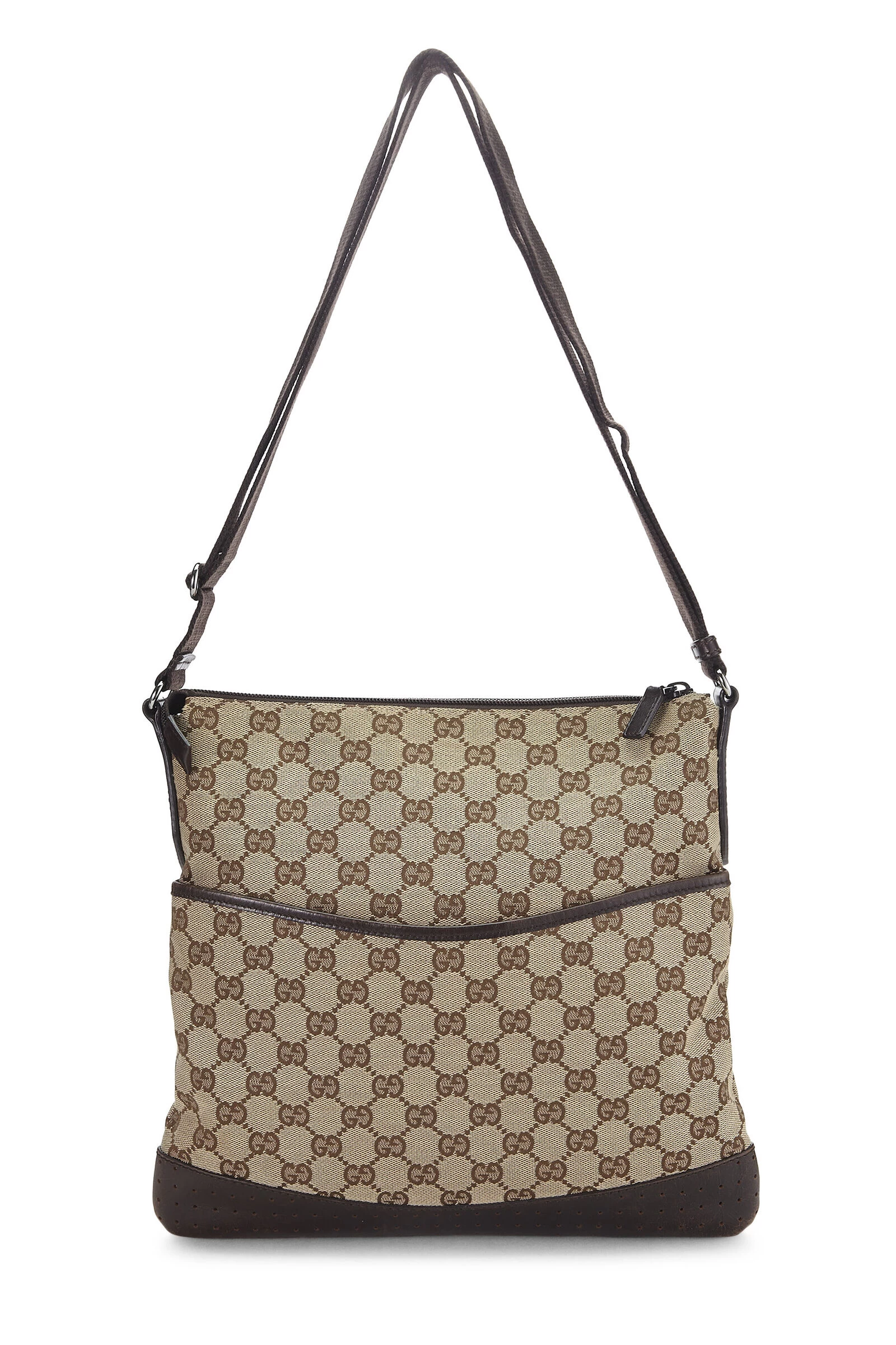 Classic Gucci messenger rendered in the house’s Original GG logo-printed canvas. Features perforated brown leather at base and a tonal brown canvas shoulder strap.