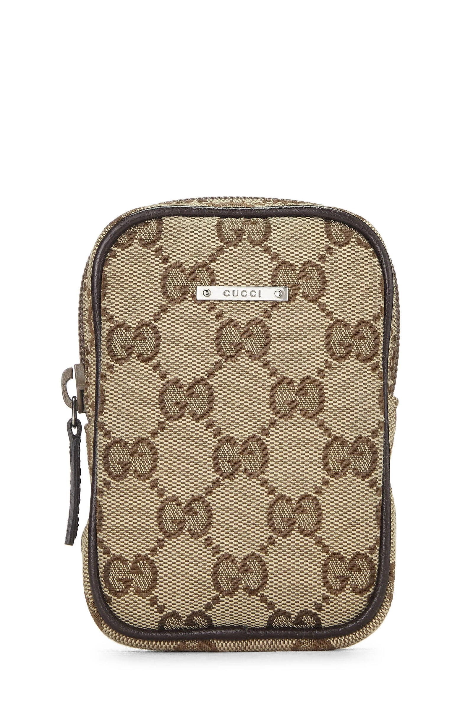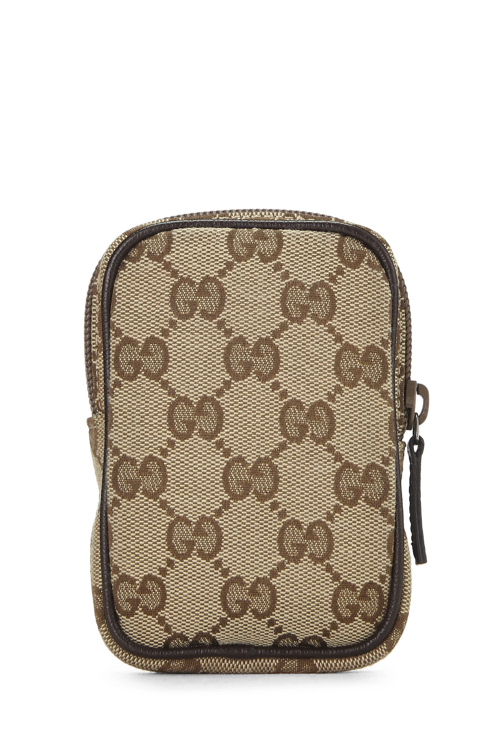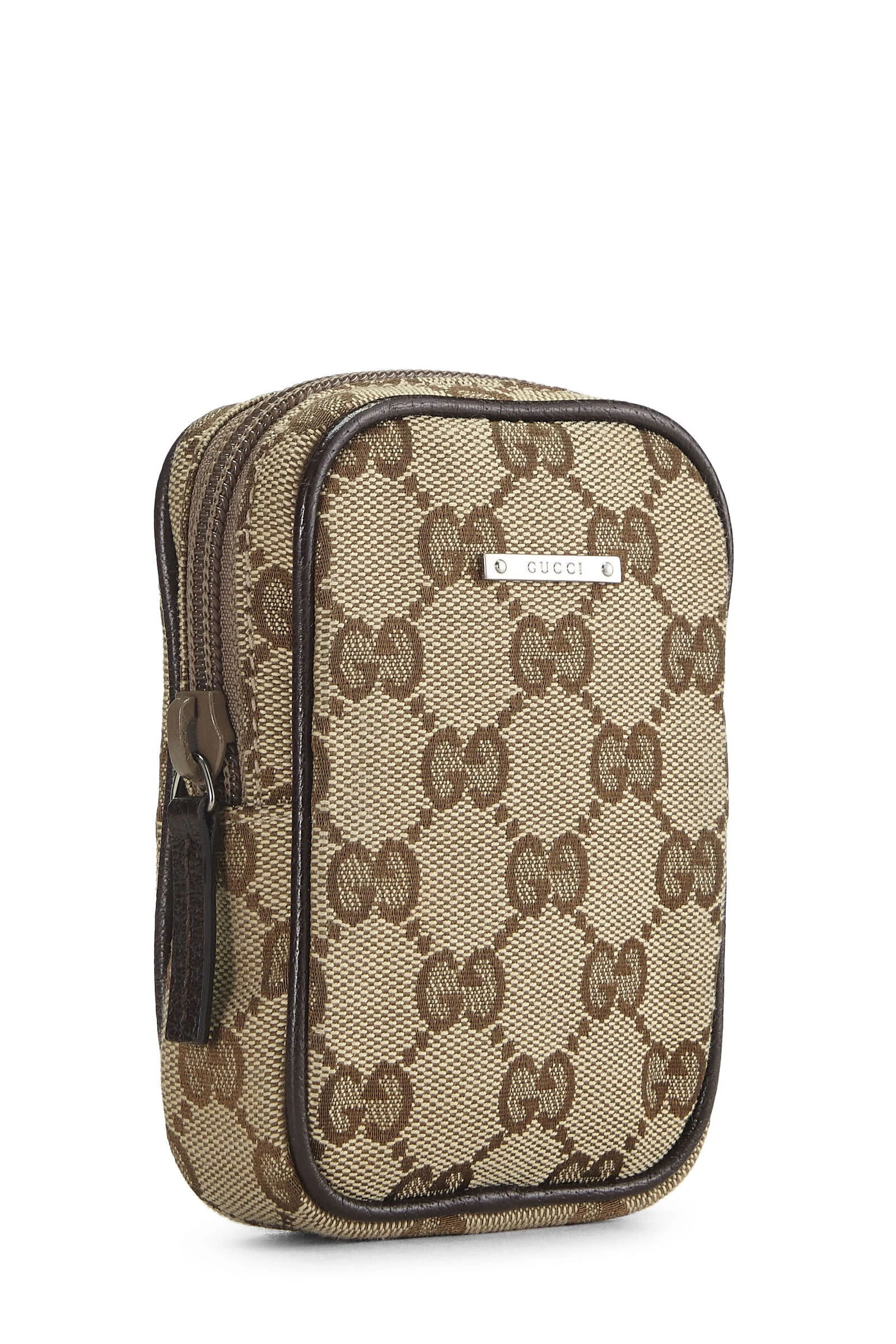 Classic Gucci Original GG Canvas pouch featuring a brown leather trimming with tonal and silver-tone hardware.