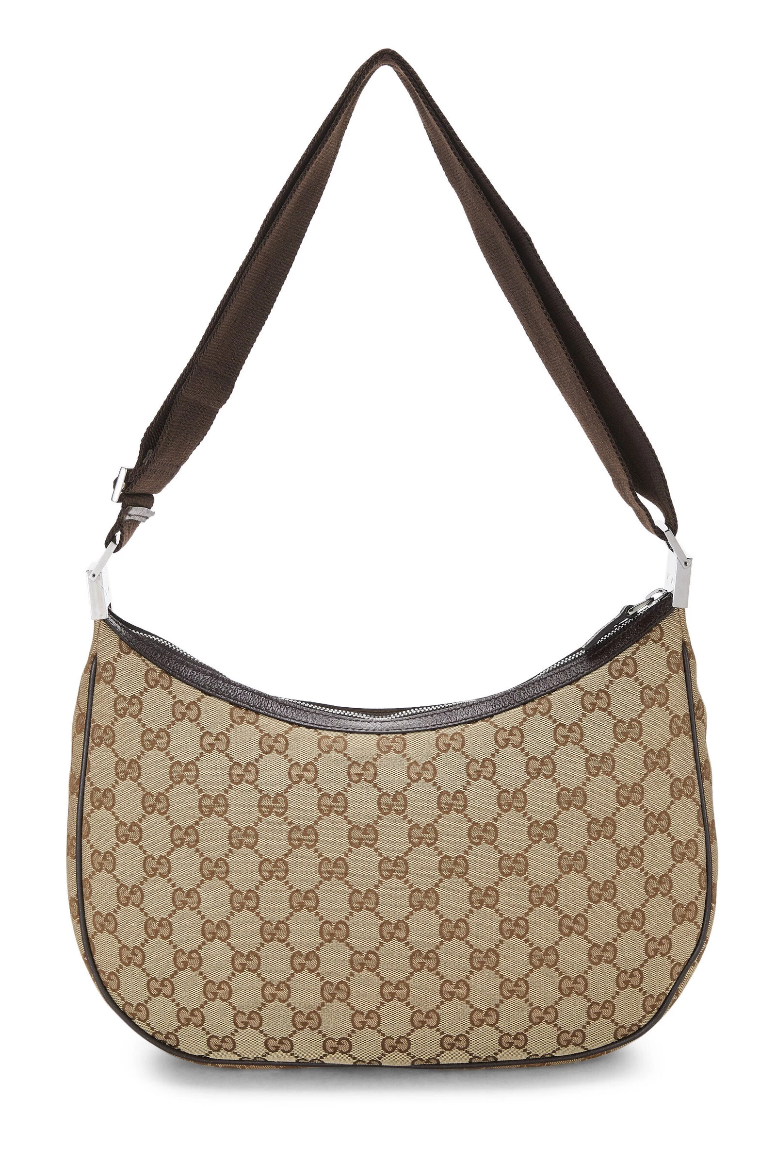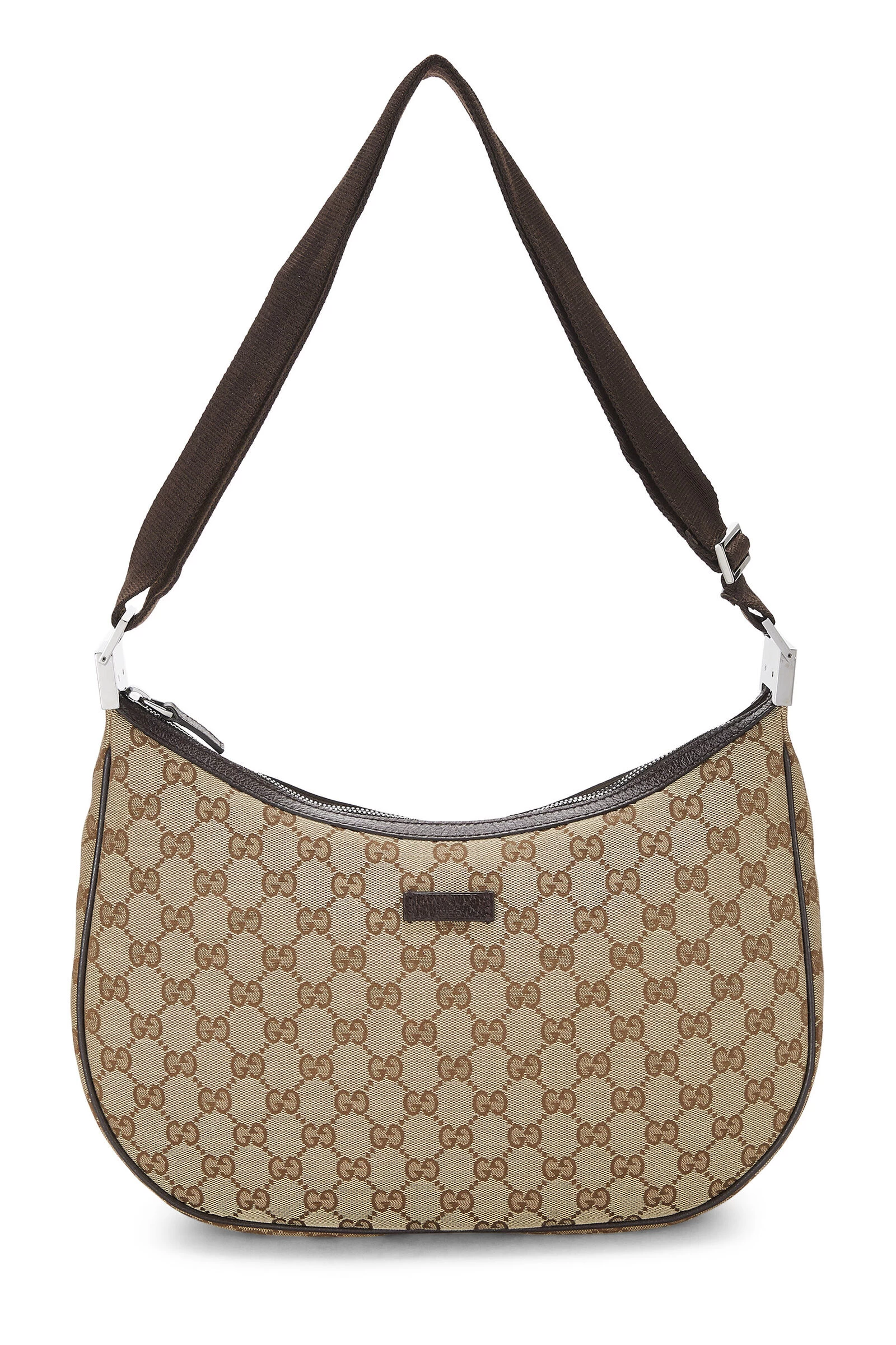 Classic Gucci round messenger rendered in the classic Original GG canvas, featuring grained dark brown leather trim and finished with silver-tone hardware.