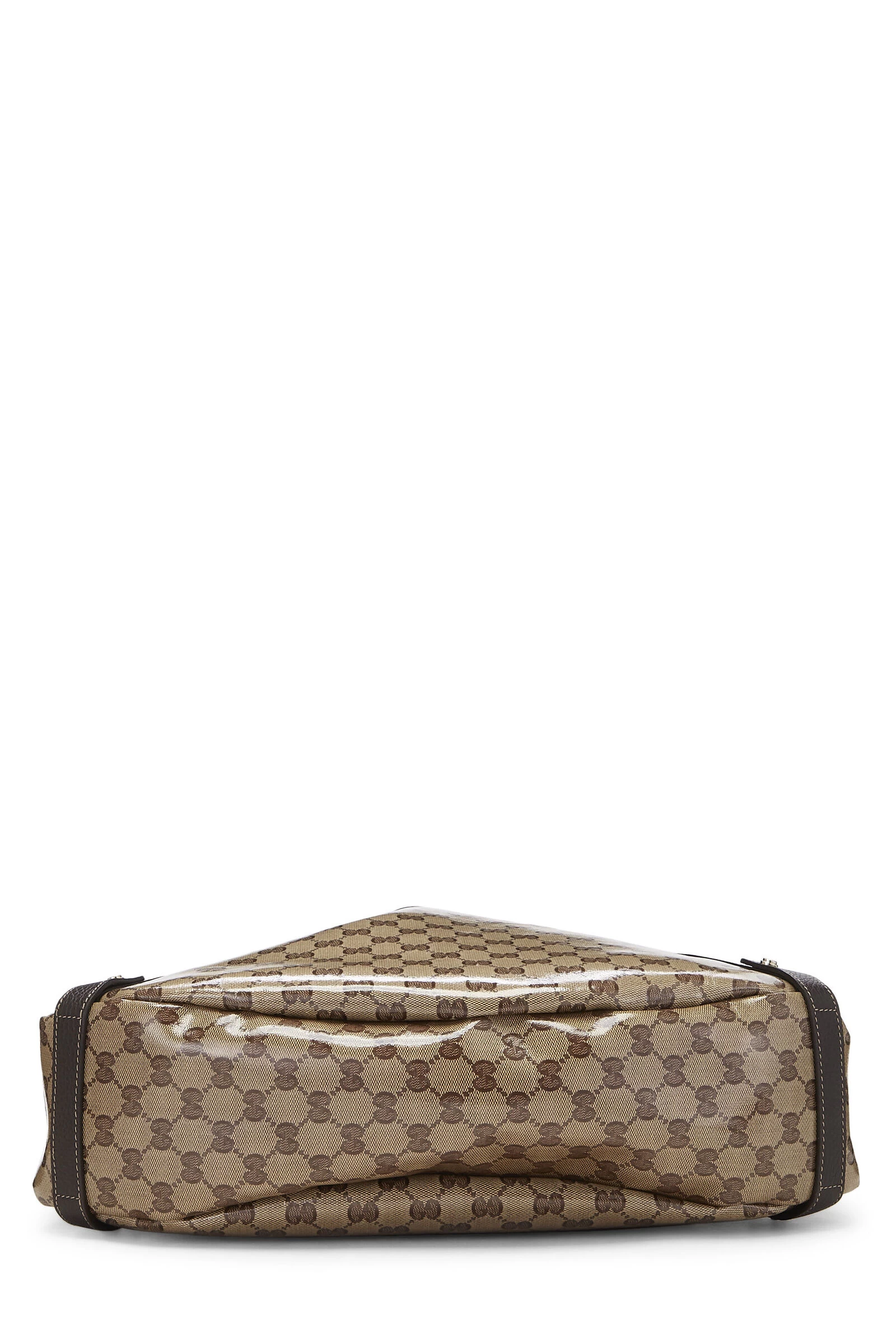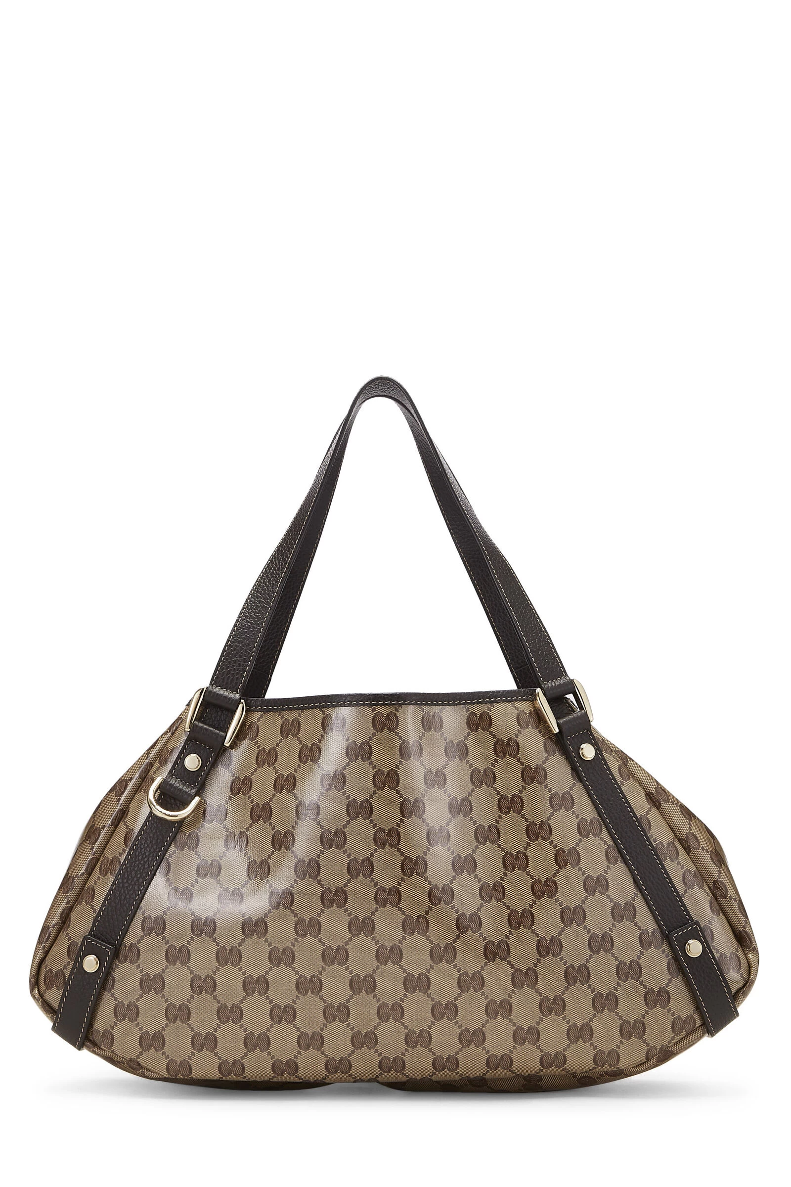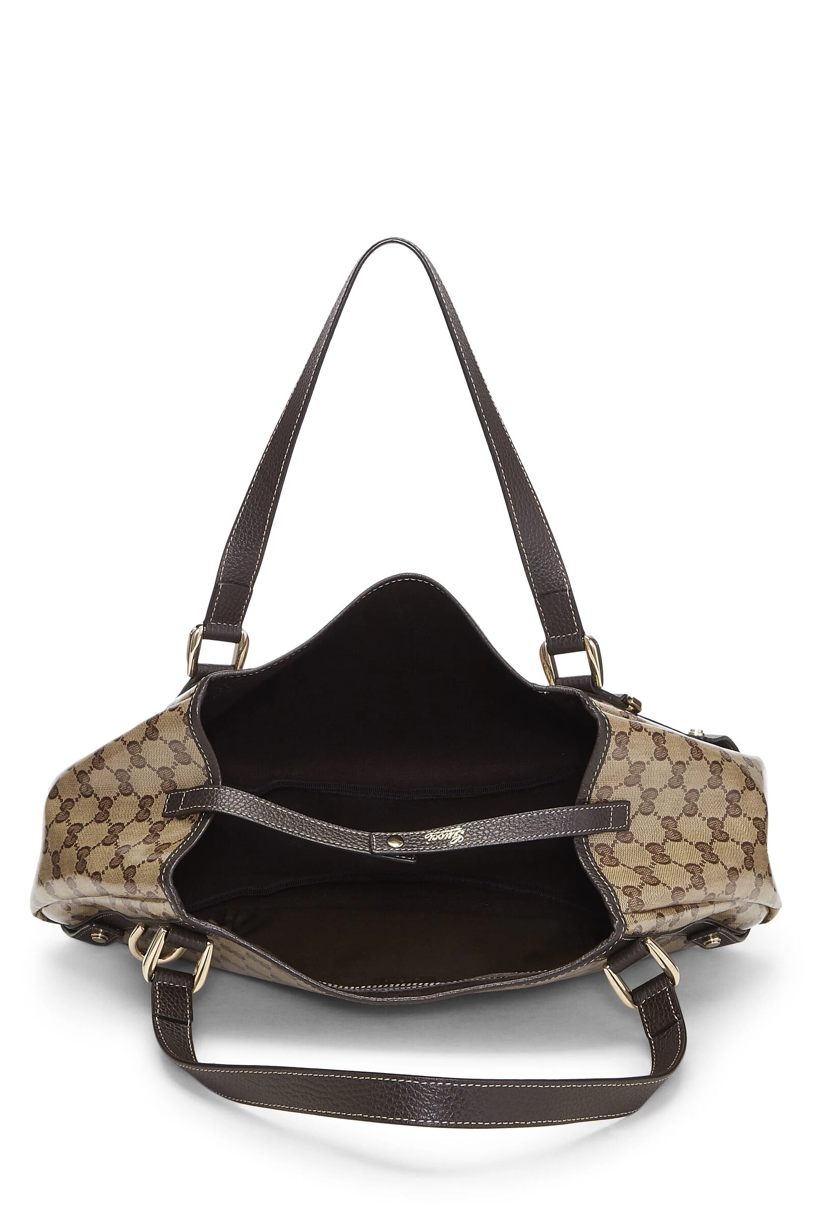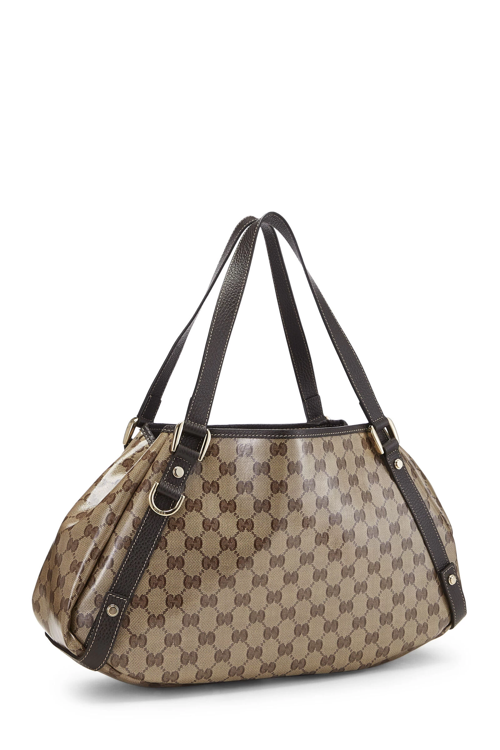 Classic Abbey tote rendered in Gucci’s Original GG Crystal coated canvas and trimmed with brown grained leather. The bag features two leather shoulder straps and gold-tone hardware.