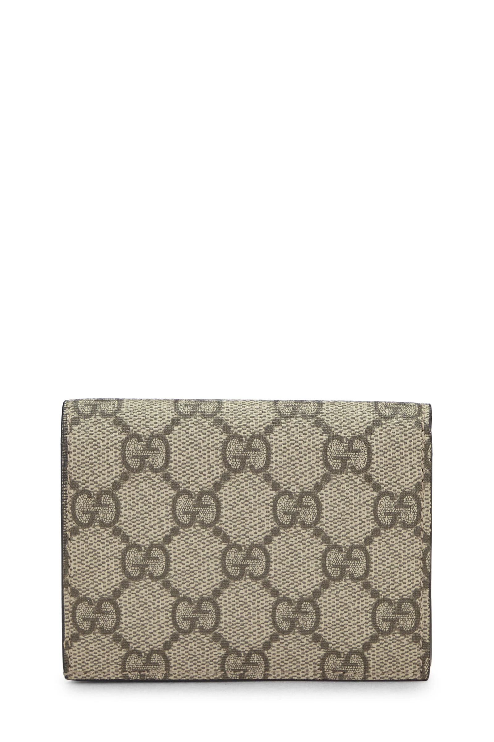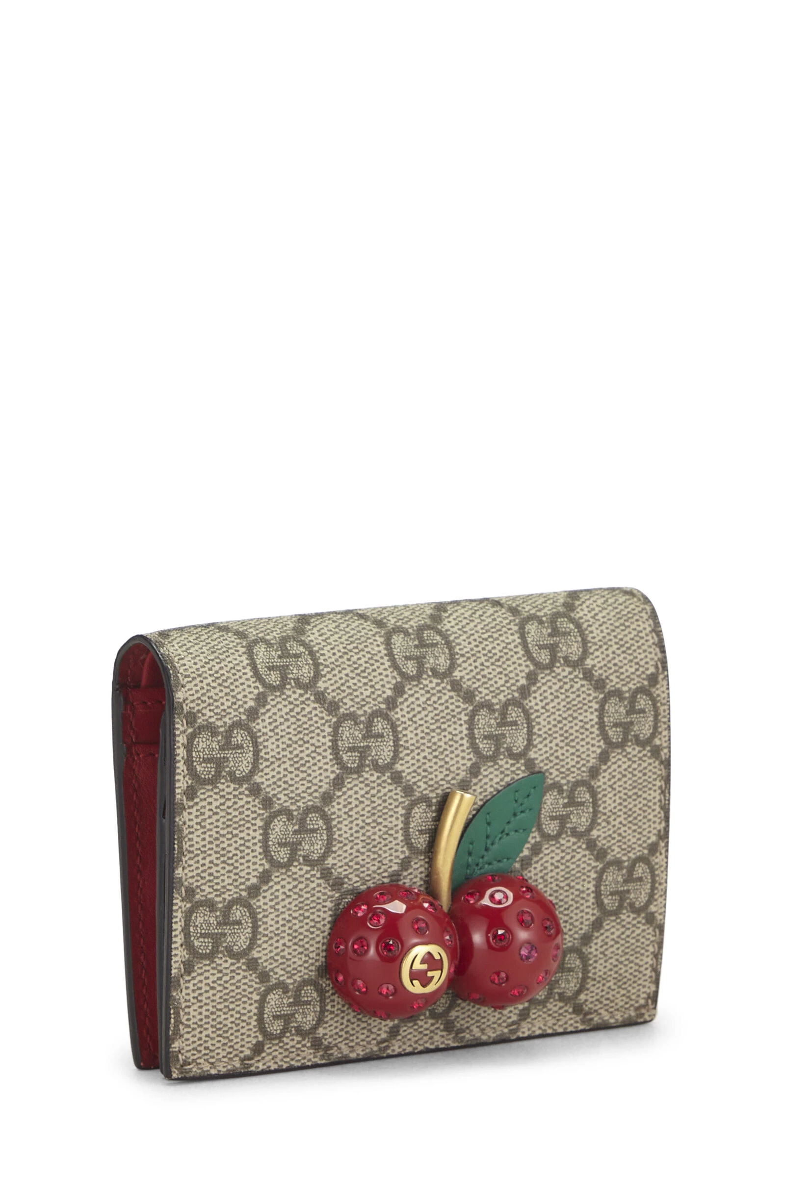 From the house’s Supreme line, this card case is crafted in classic Original GG Supreme coated canvas, with bright red eye-catching leather trimmings at interior and side panels, featuring crystal embellished cherry with gold-tone metal stem and green leather leaf on flap closure. GG Supreme is a durable, easy to clean and water resistant canvas perfect for everyday wear.