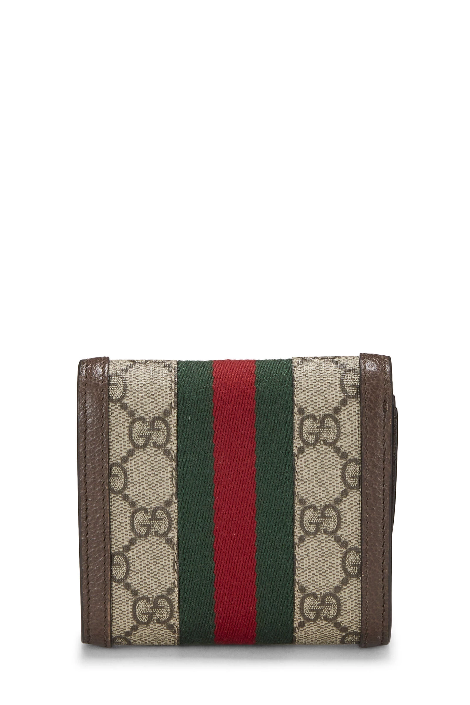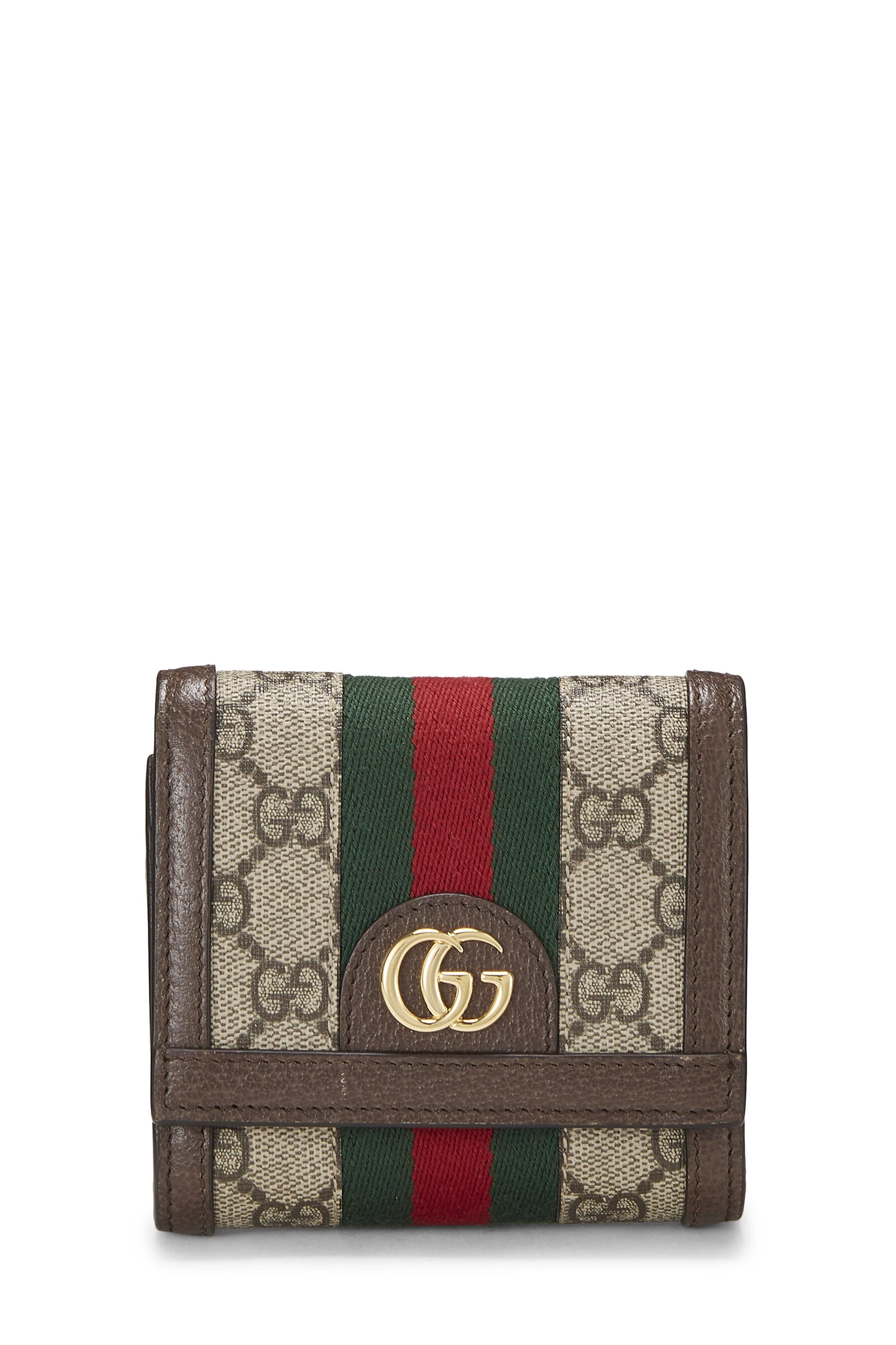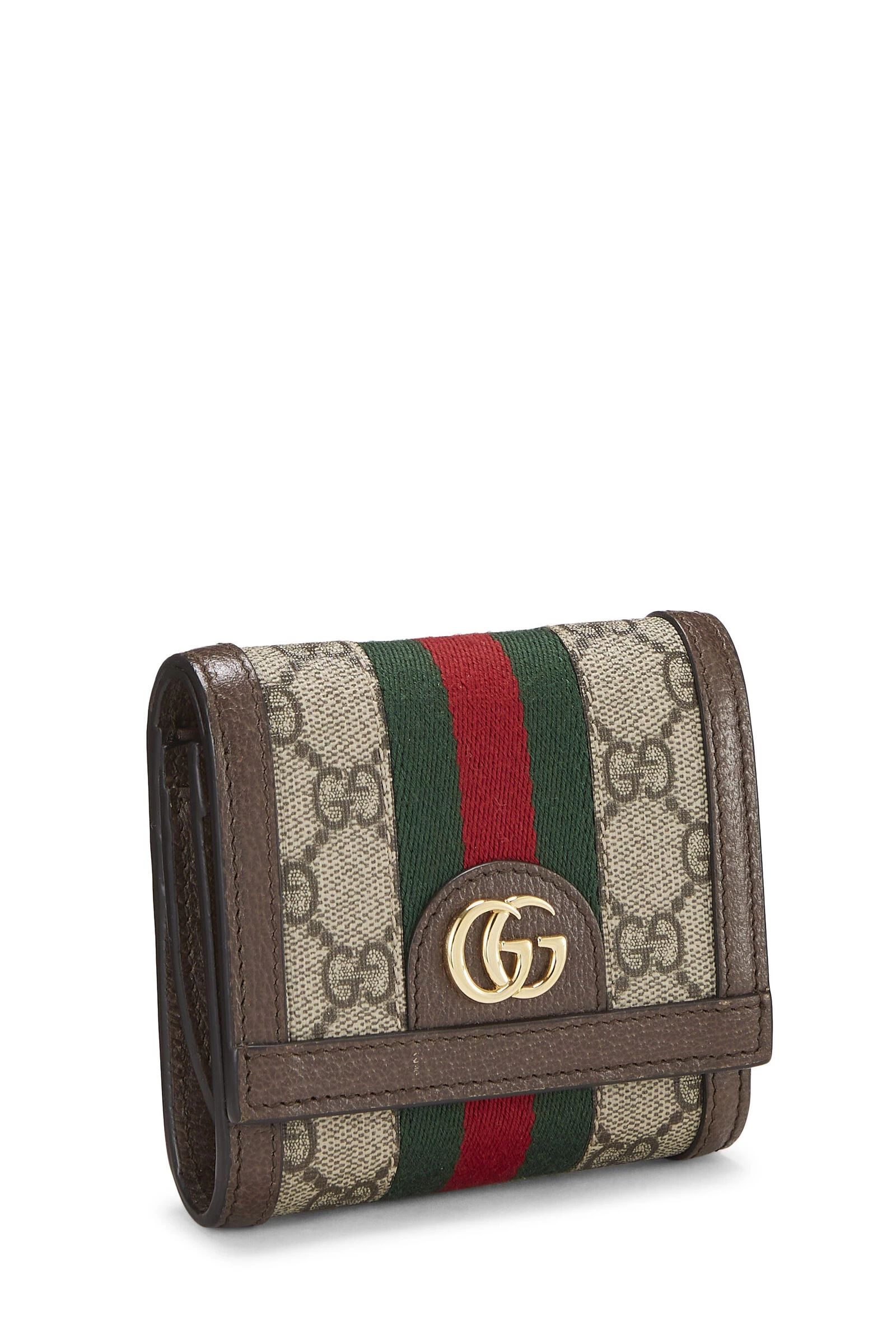 Compact Gucci wallet crafted in the house’s iconic GG Supreme coated canvas, featuring brown leather trim, the signature red and green striped Web panel at the center and finished with running ‘GG’ Ophidia logo hardware.