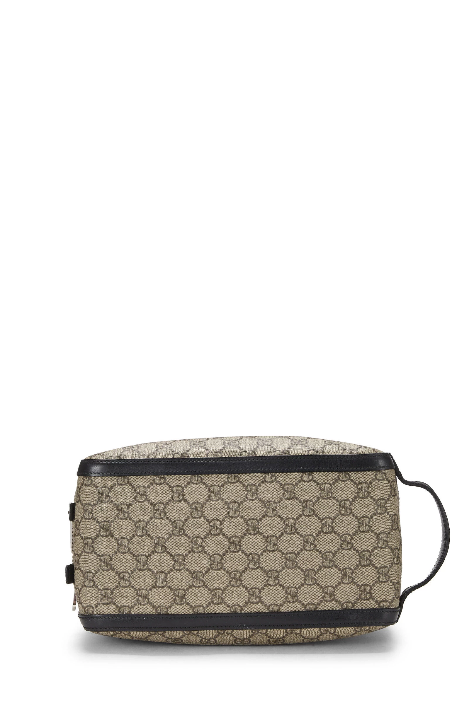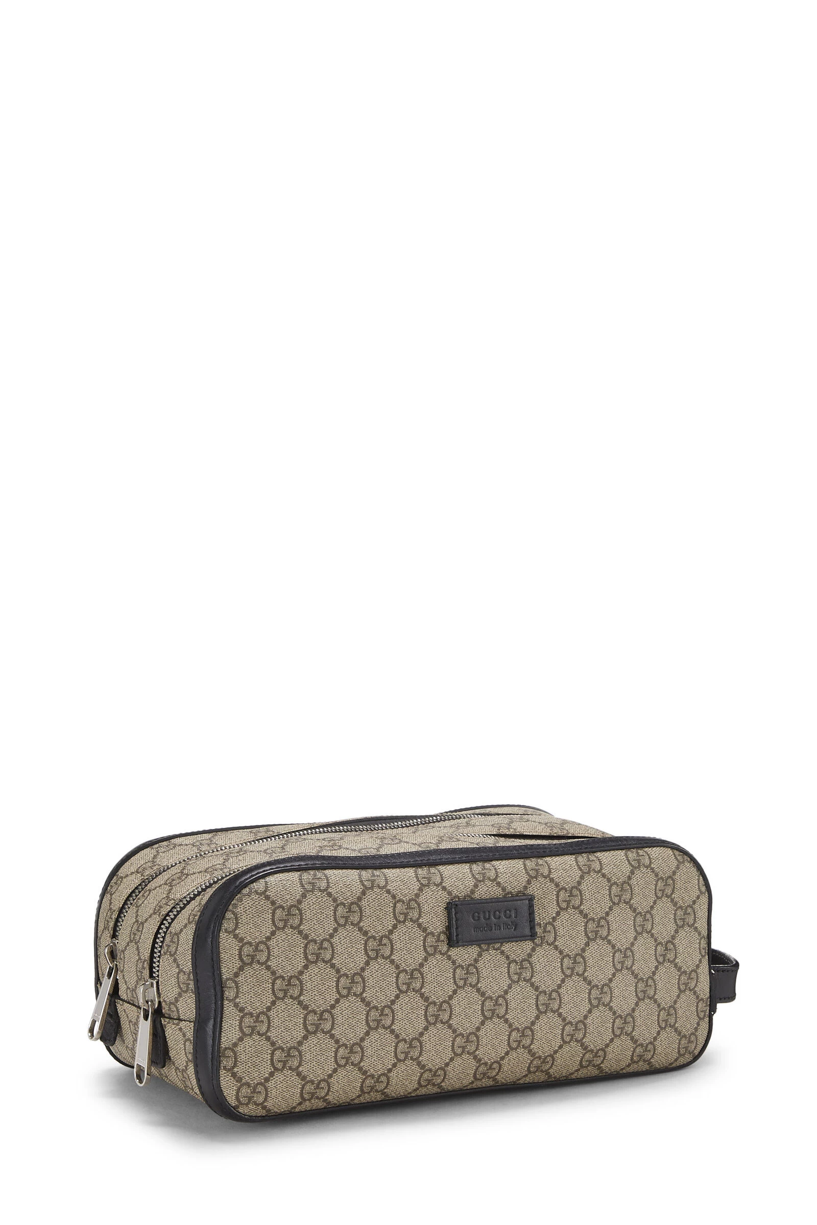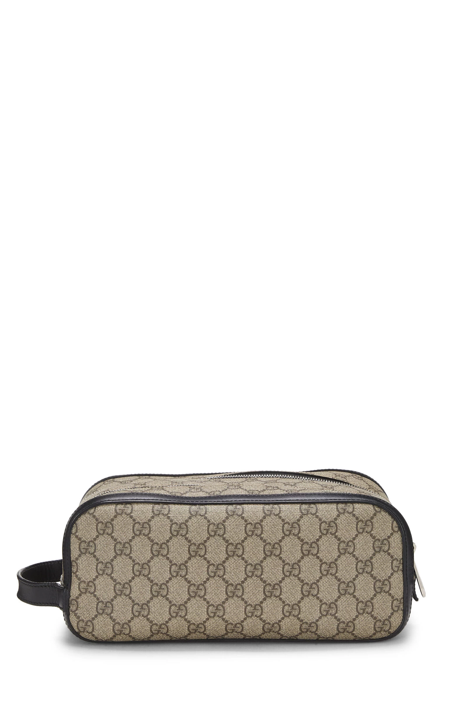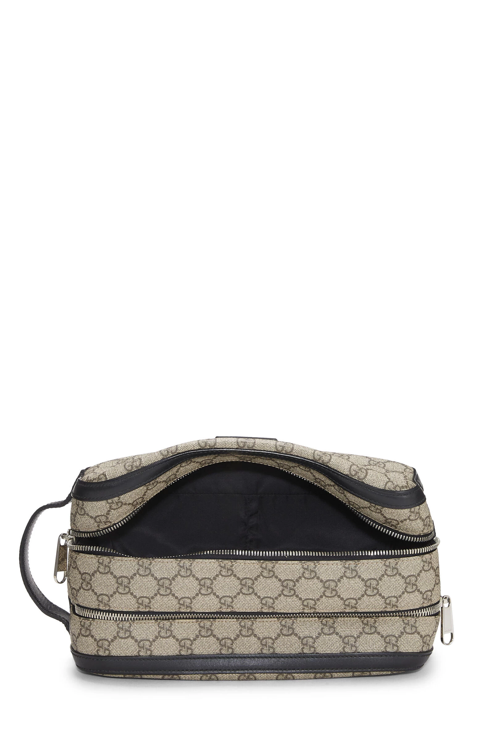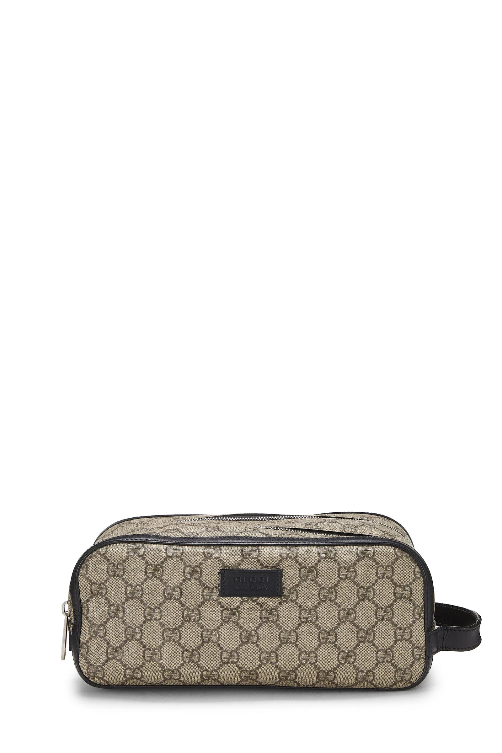 The perfect travel accessory, Gucci’s chic and durable Toiletry Case is crafted in classic GG Supreme coated canvas, with contrasting black leather trim and finished with silver-tone metal hardware. Utilize the leather handle for quick and easy transport.