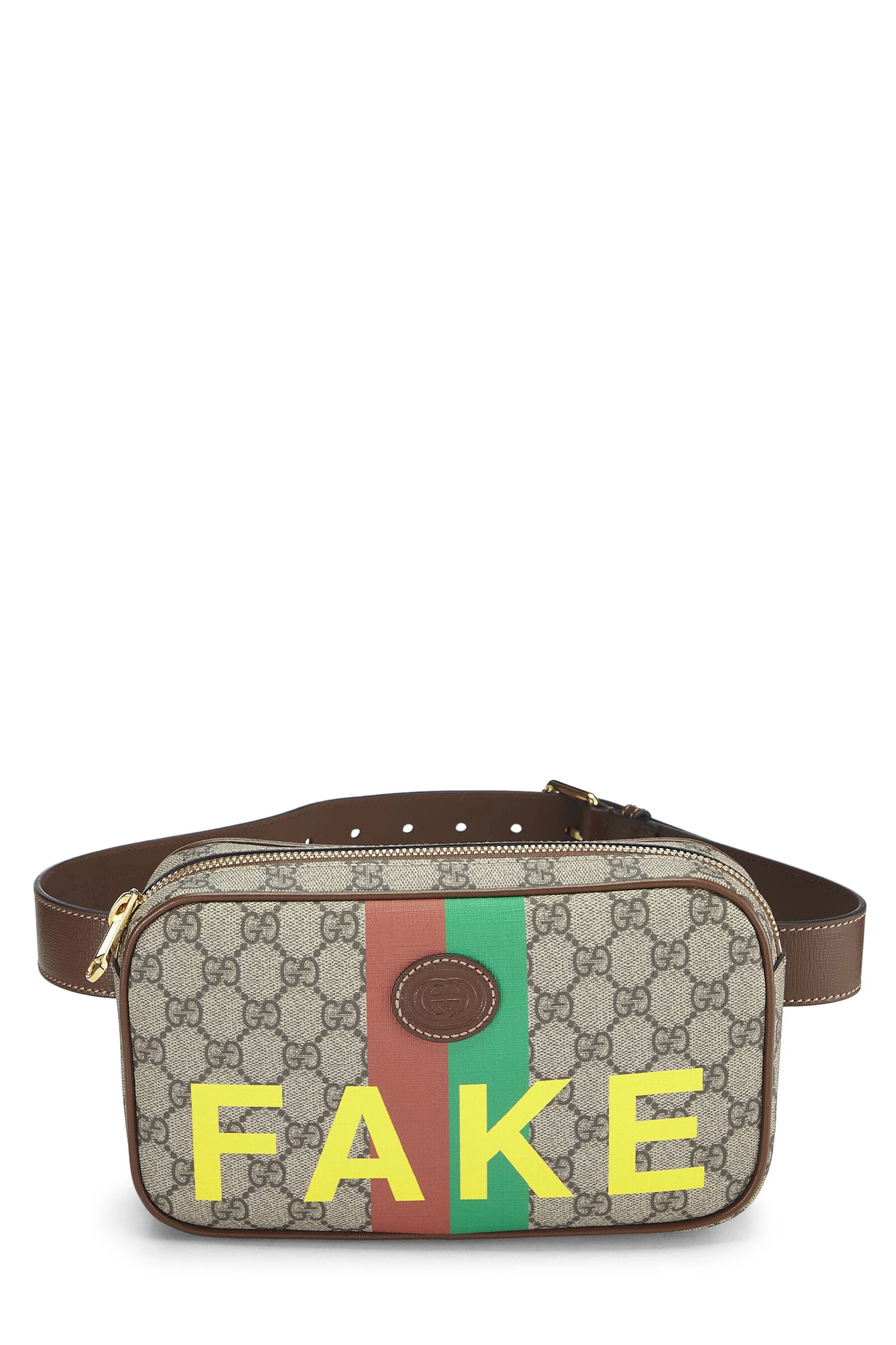 Gucci Fake/Not belt bag crafted in beige Original GG Supreme coated canvas with brown smooth leather trim, finished with gold-tone hardware. Whether you wear it slung across the body or strapped around your waist, this hands-free accessory adds the perfect dose of luxury to any look. featuring interlocking ‘GG’ leather logo embellished with a red and green Gucci web running throughout.
