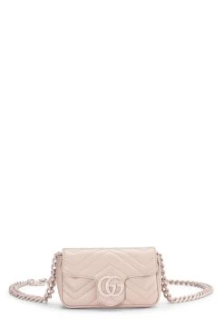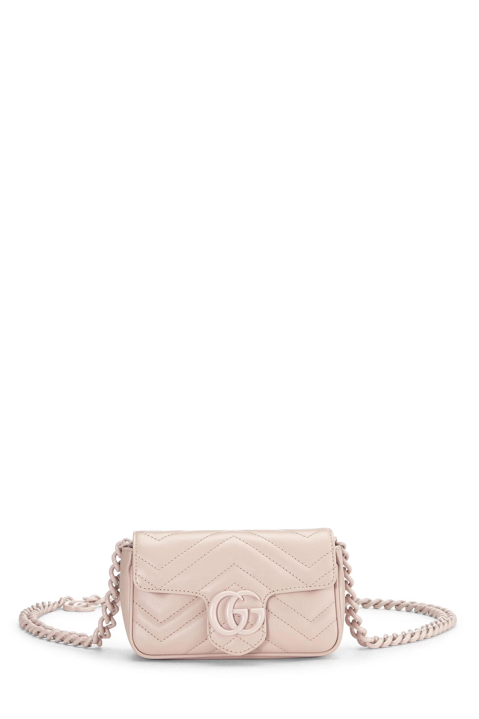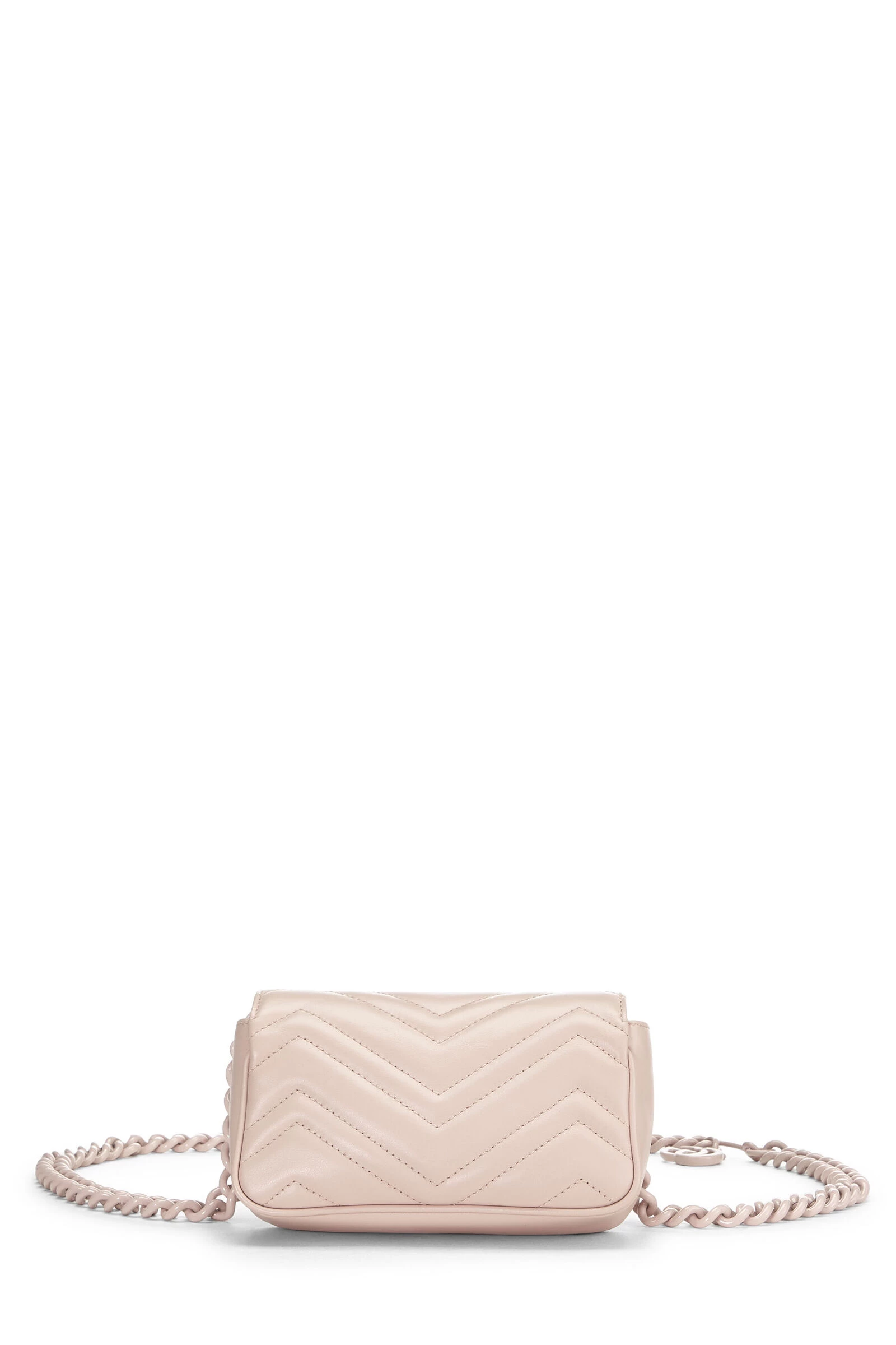 Gucci Marmont belt bag featuring chevron quilted pink leather, iconic to the Marmont collection, accented with tonal Running GG logo hardware at the front.