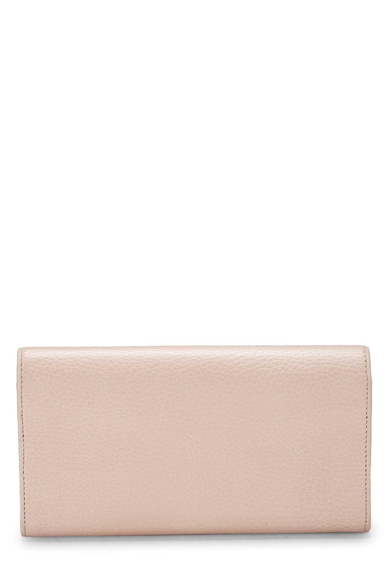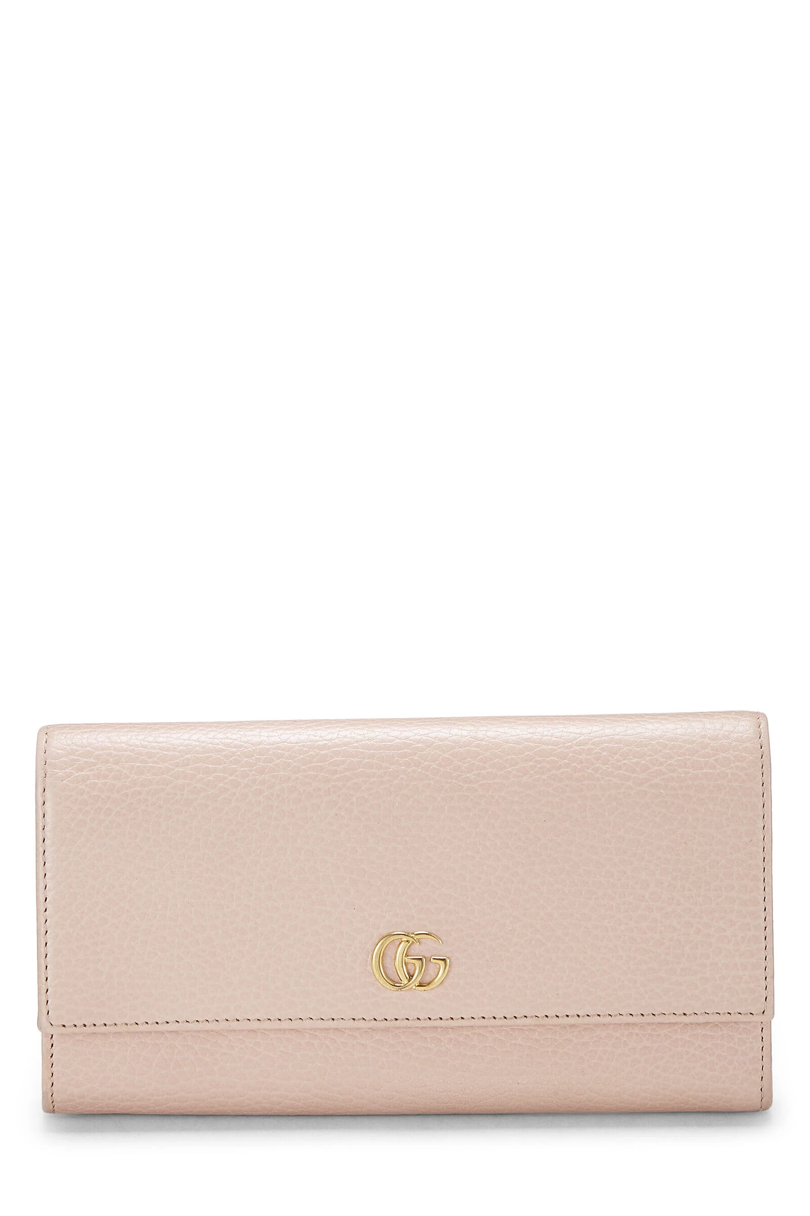 Classic Gucci Continental wallet rendered in a pink textured leather, featuring a front flap accented with gold-tone ‘GG’ logo hardware.