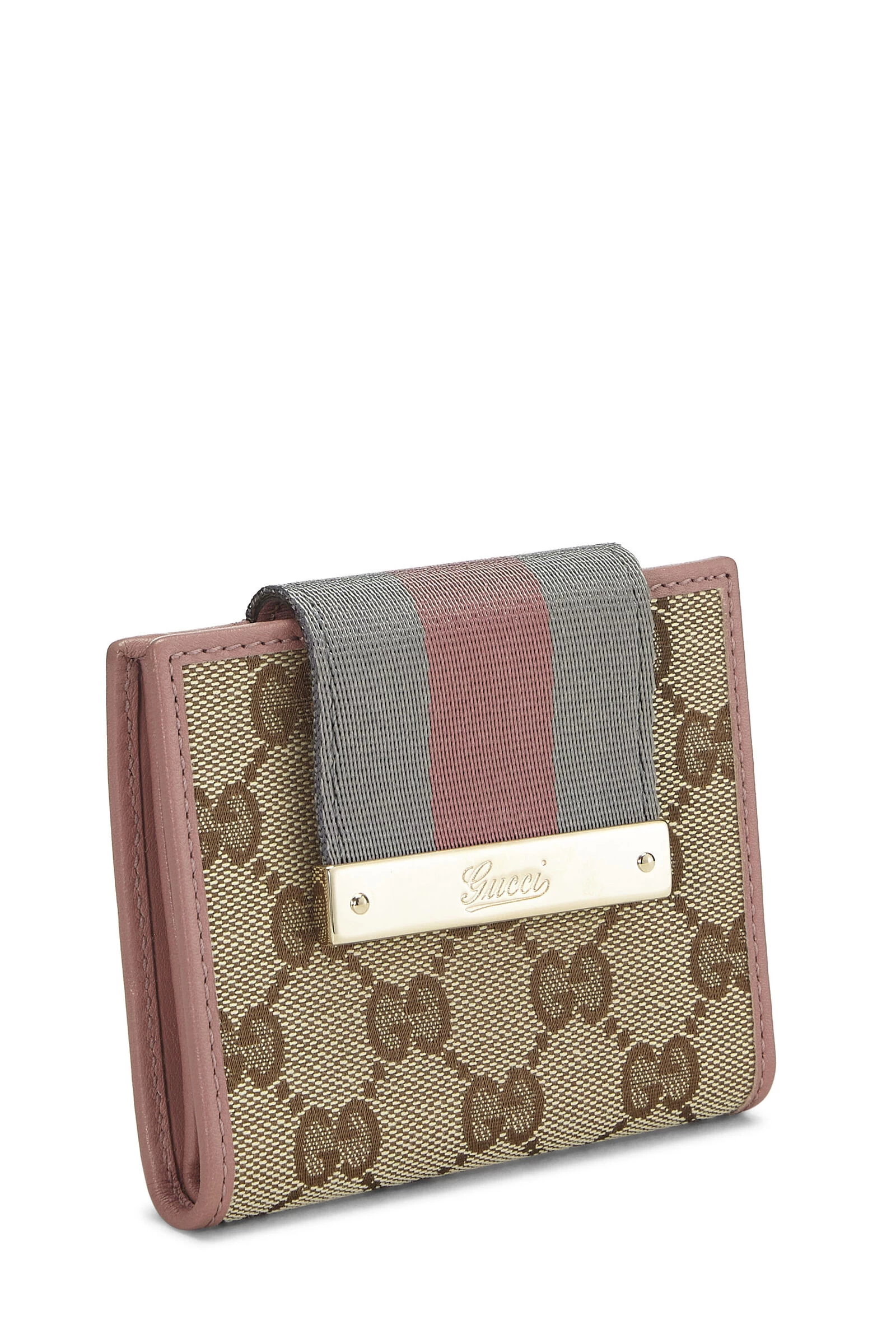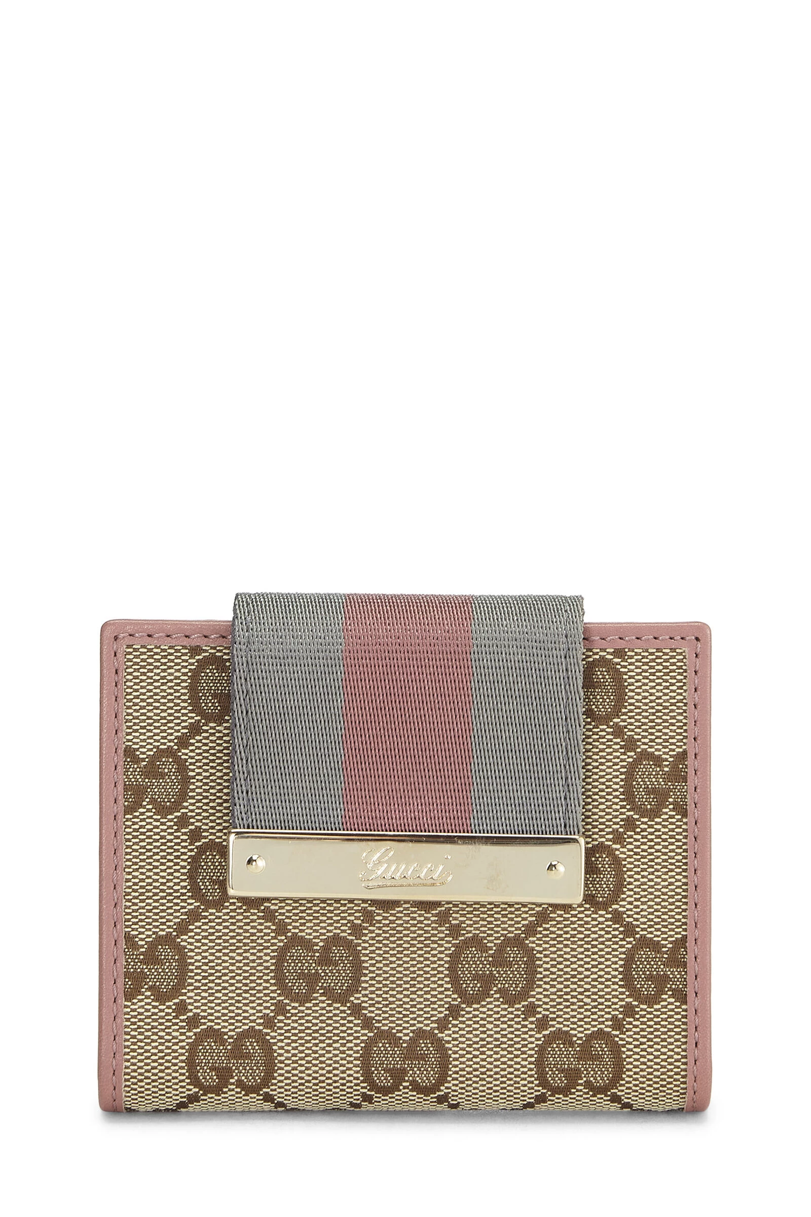 Chic and durable compact wallet from Gucci, crafted in the house’s iconic Original GG Canvas featuring contrasting pink leather accents, the iconic Web pattern – featured here in a unique pink & grey color – and finished with gold-tone hardware.