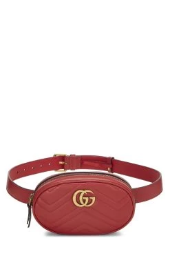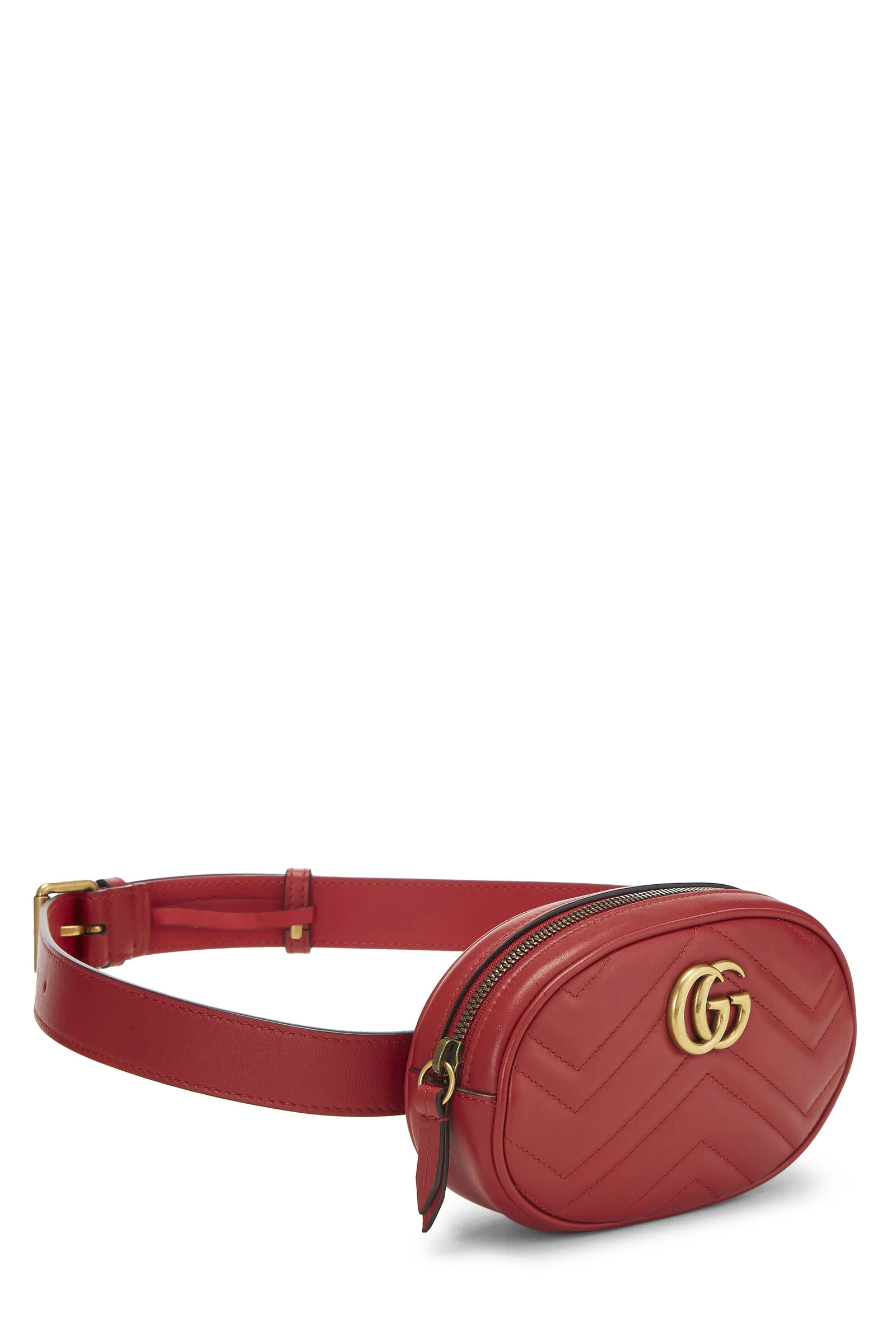 Gucci Marmont belt bag featuring chevron quilted red leather, iconic to the Marmont collection, accented with heart embroidery on back and finished with antiqued gold-tone Running GG logo at front. Belt size: 85/34. Belt measures 29″-37″