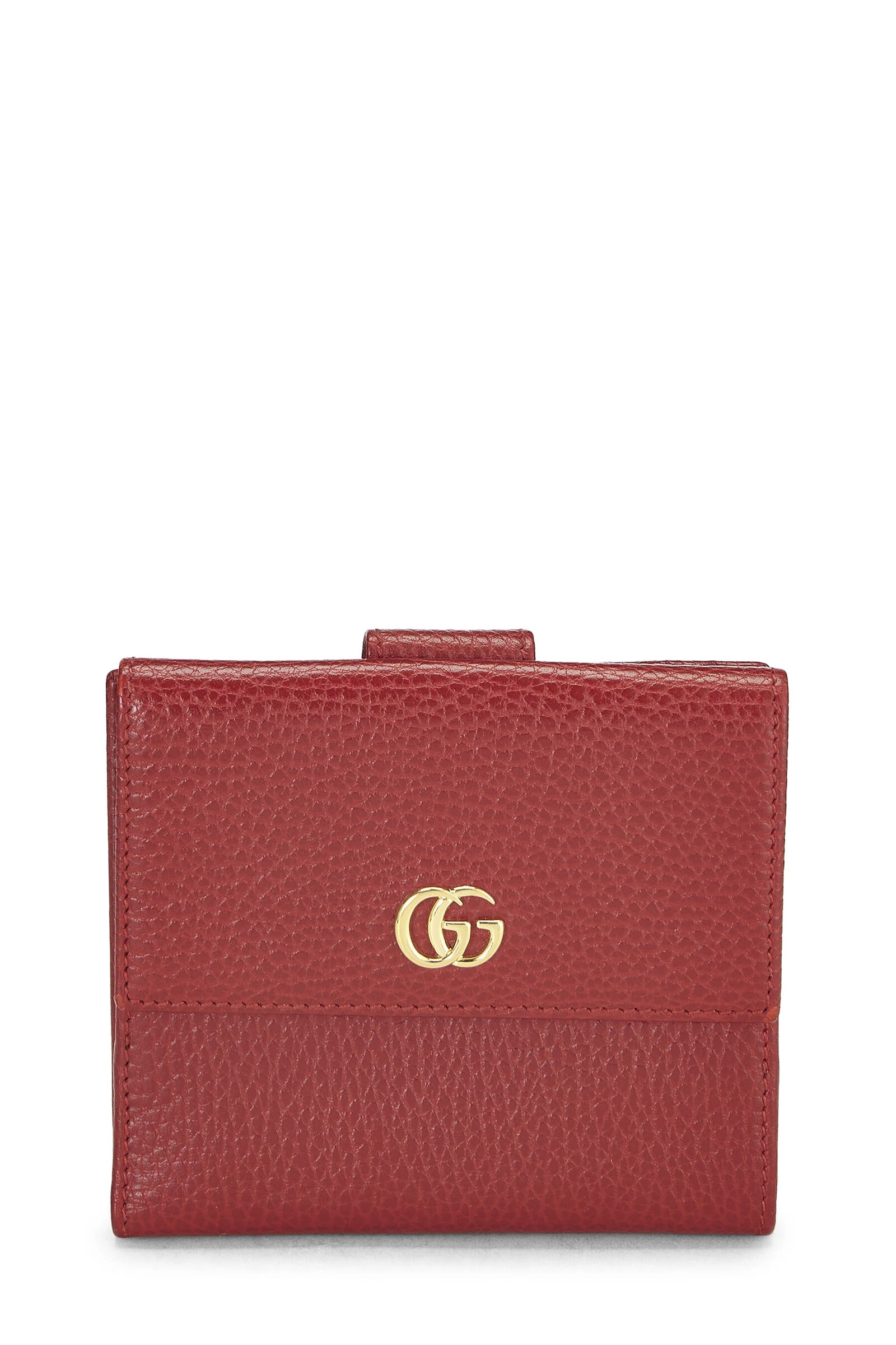Compact Gucci French Flap wallet crafted in red grained leather, featuring signature Running ‘GG’ logo hardware on front flap.