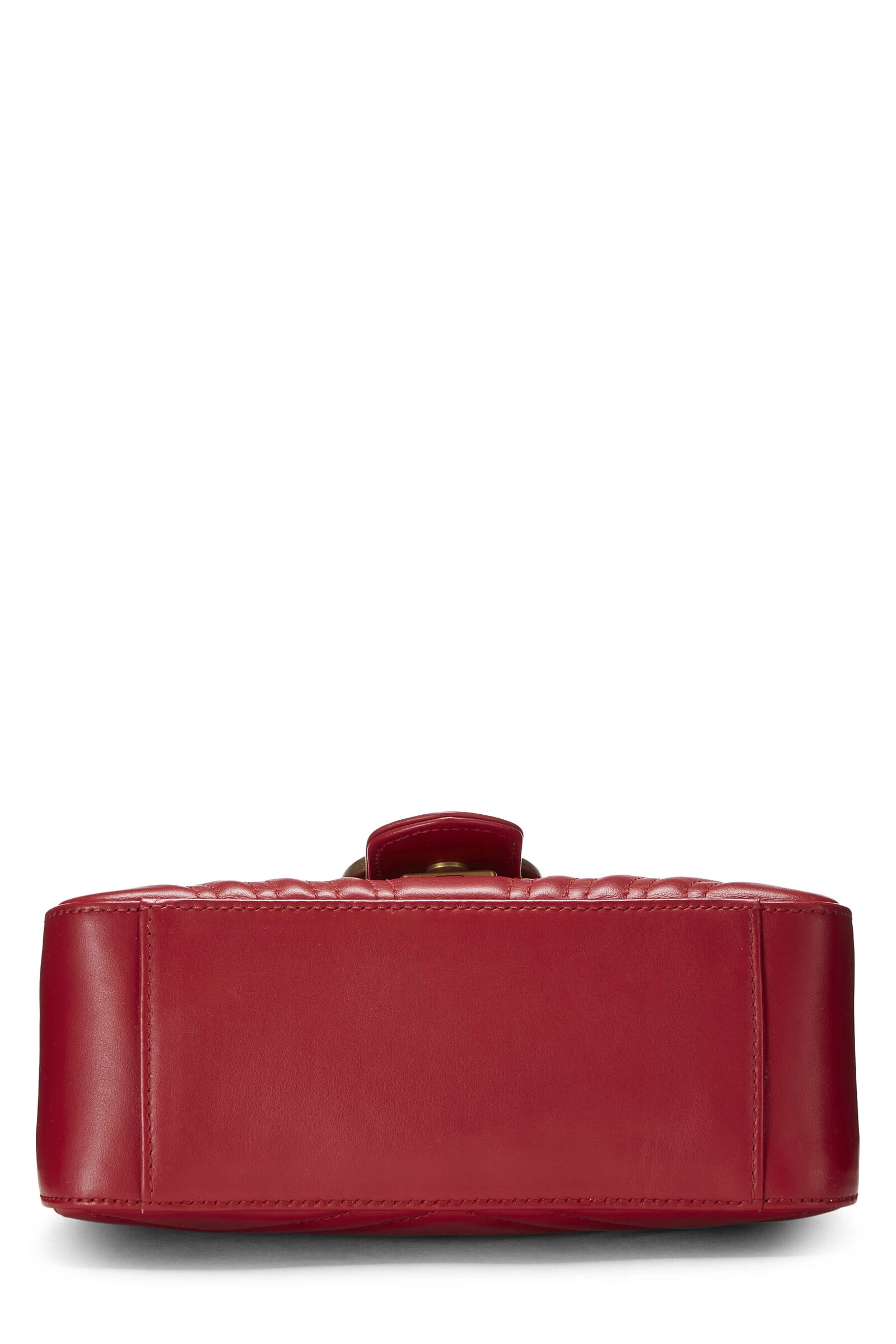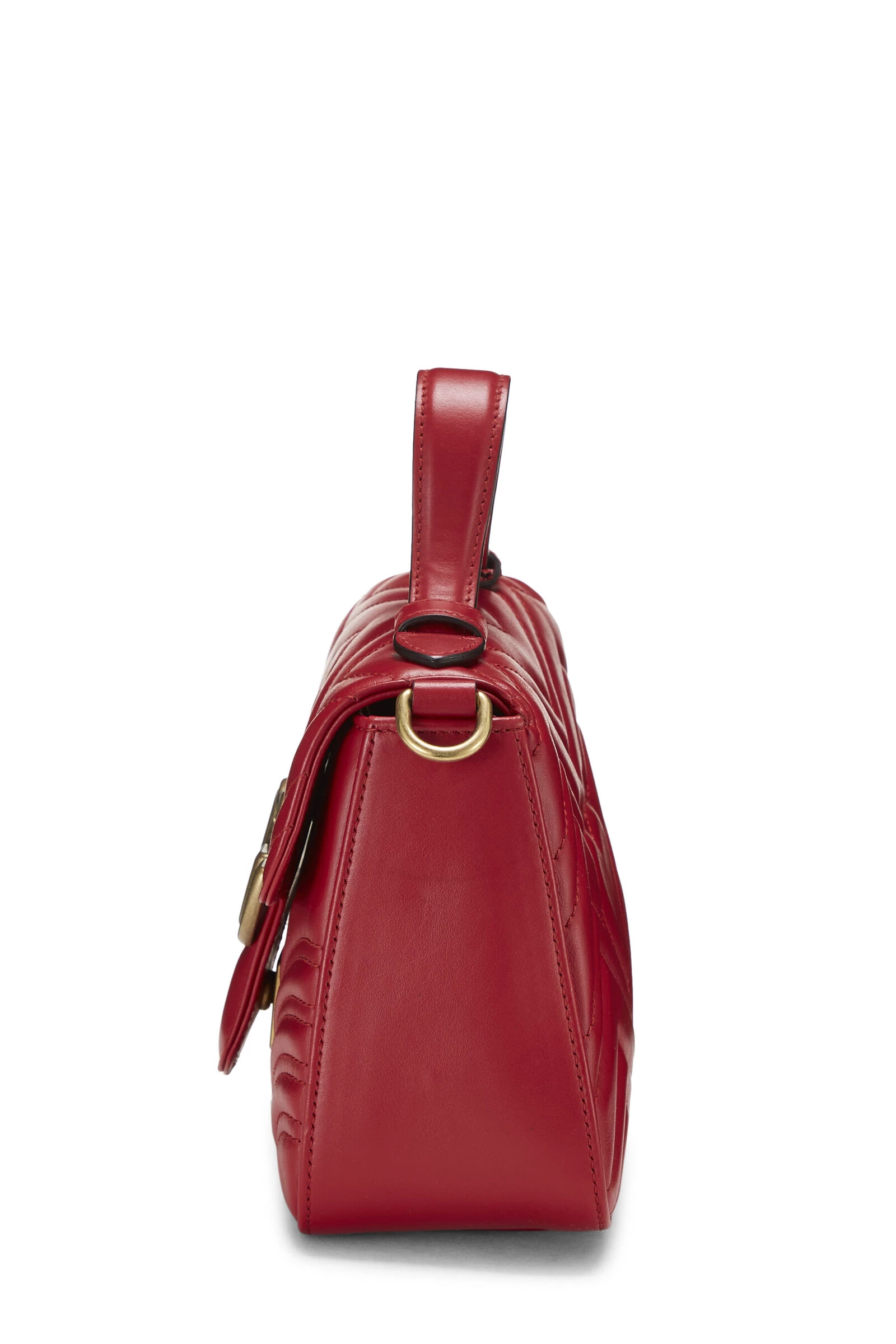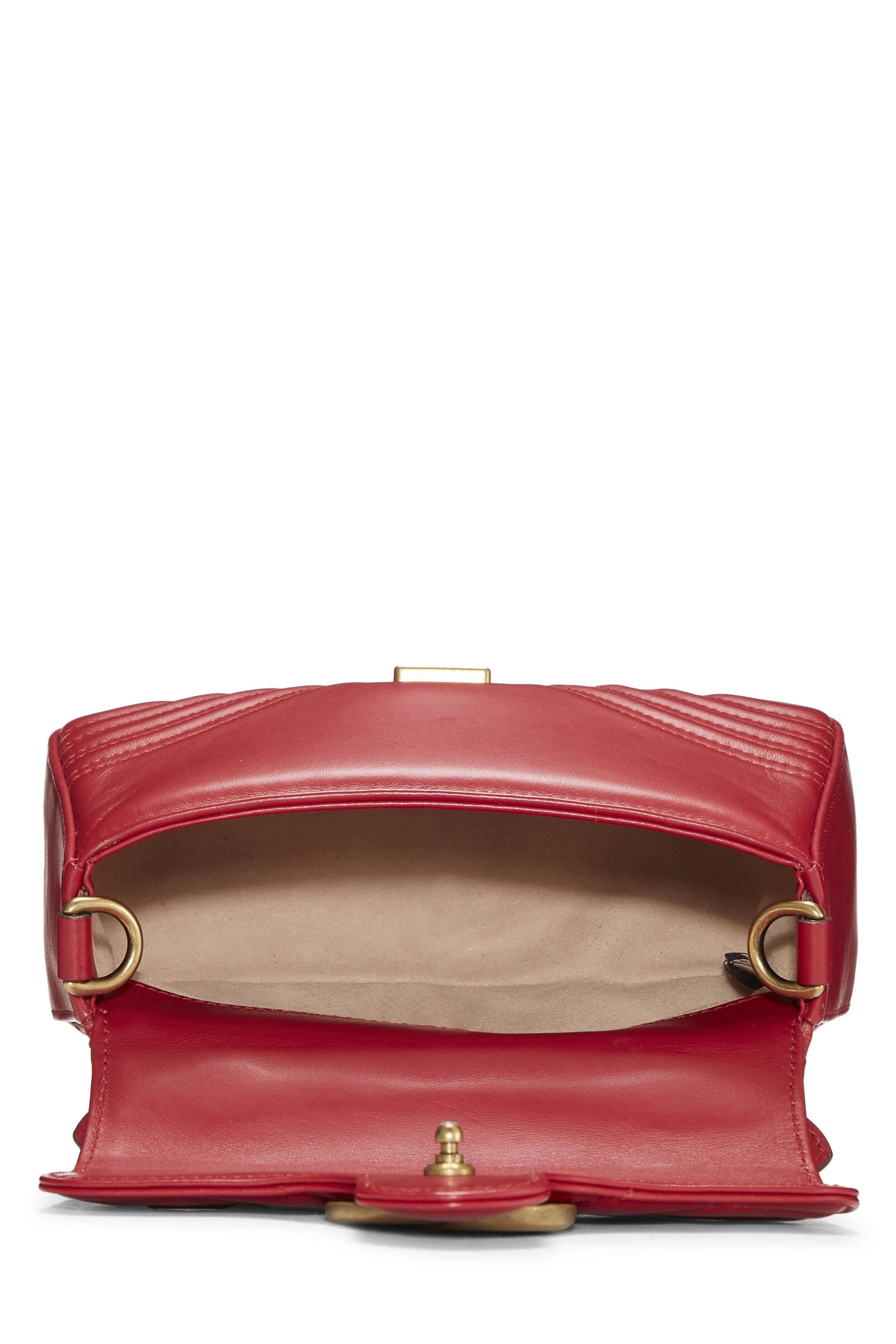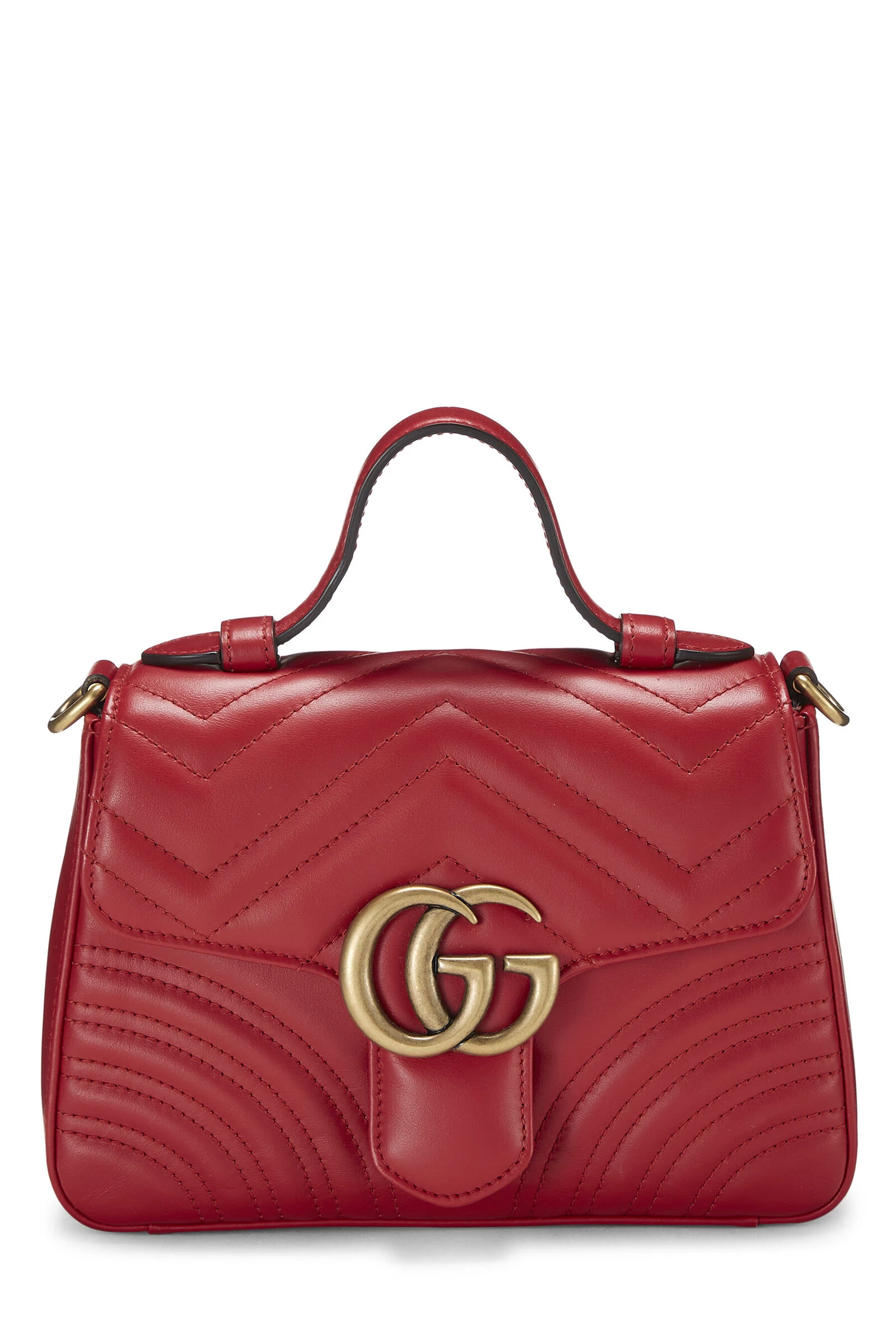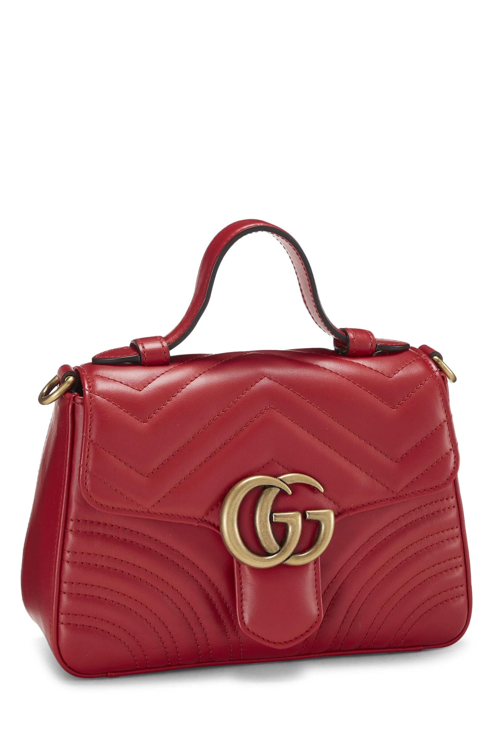 From Gucci’s Marmont collection, this mini top handle bag is crafted in vertically-quilted red matelassé chevron leather with contrast black leather details and finished with engraved Running ‘GG’ logo hardware. In addition to a leather top handle, the bag also features an optional chain-link shoulder strap for versatile carrying options.