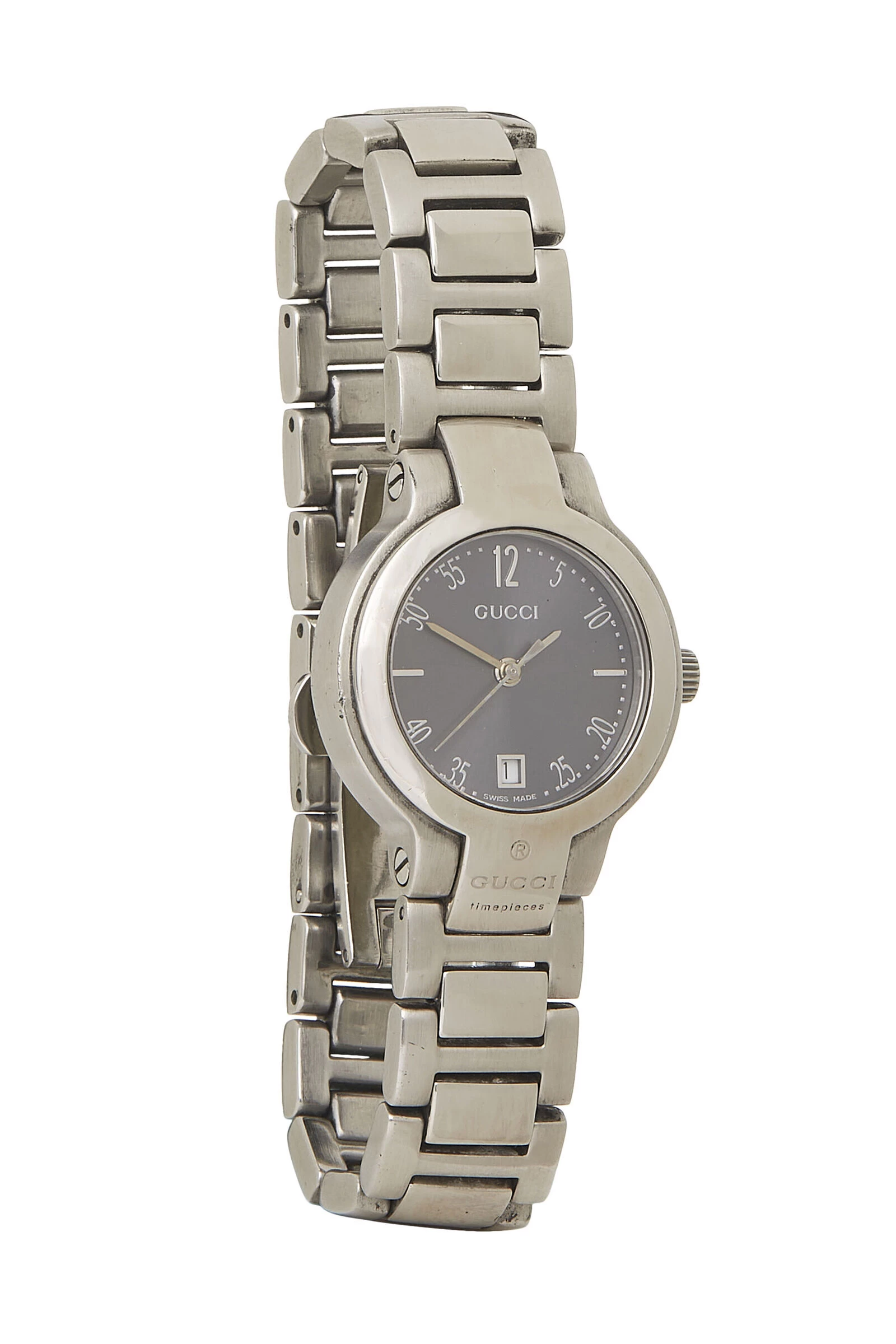 Sleek and simple Gucci watch crafted in stainless steel, featuring a round face, a grey dial with Arabic numeral hour markers and a cyclops date window. Please note, battery needs to be replaced.