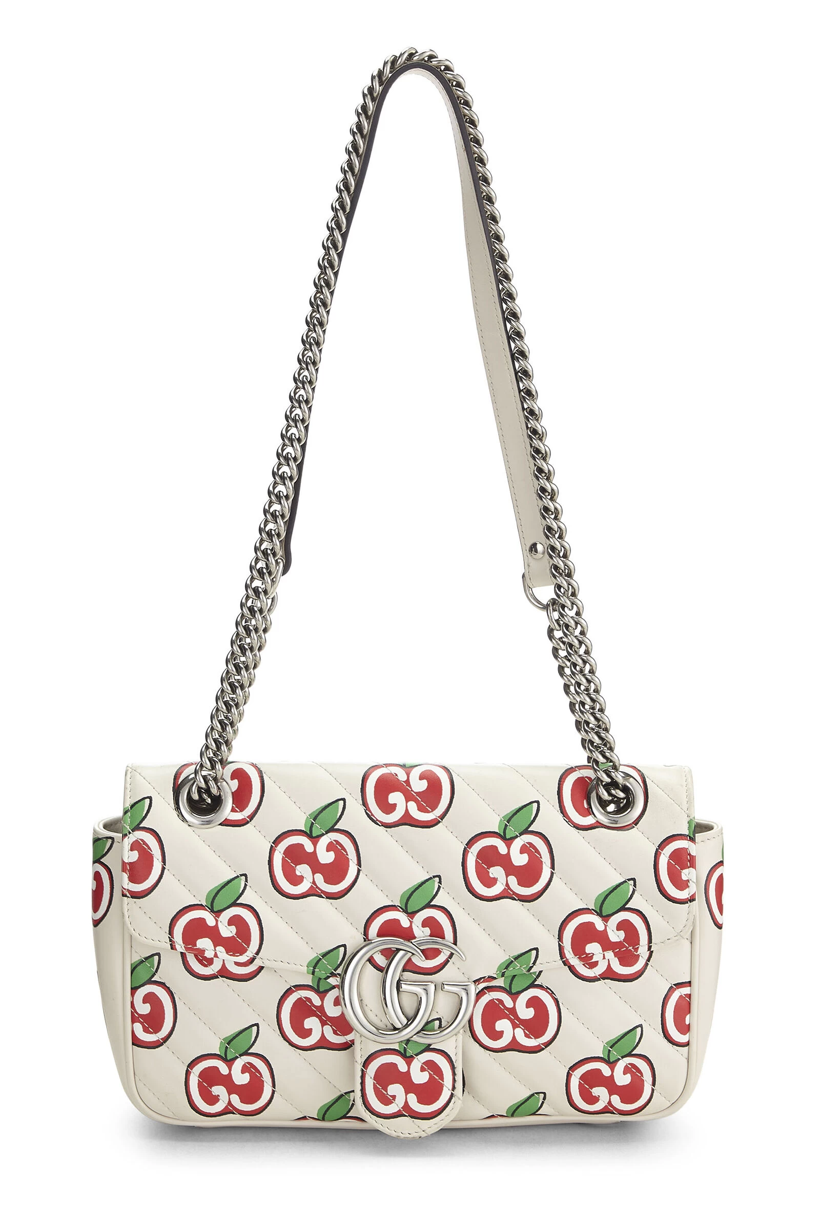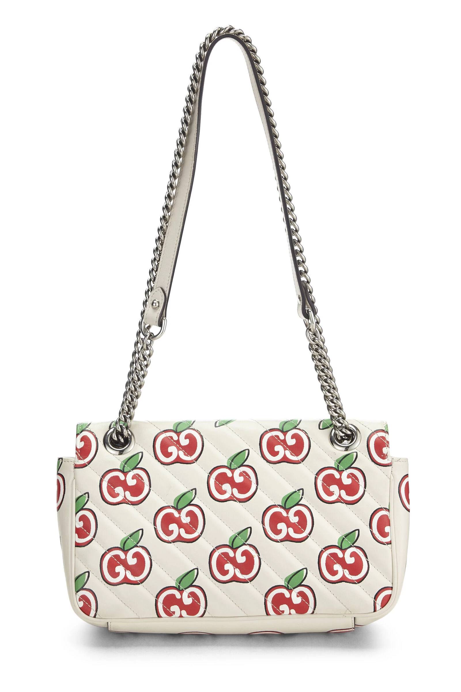 Part of a 2020 capsule collection released in honor of Chinese New Year, also known as the Qixi Festival, Gucci’s whimsical Apple pattern is a welcome addition to Gucci’s fun and iconic motifs that have entered the house’s collections. The bag is rendered in quilted white leather and finished with silver-tone hardware – which includes the running ‘GG’, a staple of the Marmont collection. The focal point of the bag is the Apple motif: throughout the bag are adorable apples with Gucci’s ‘GG’ pattern mashed into them. The bag is eye-catching and is sure to be a fun addition to any collection.