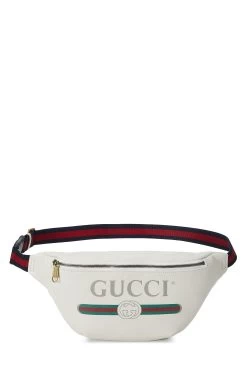 Eye-catching and perfect for on-the-go wear, this Gucci belt bag is rendered in white grained leather, featuring multicolor logo prints on the front, accented with antiqued gold-tone hardware, and finished with an adjustable red and navy striped Web canvas waist strap.