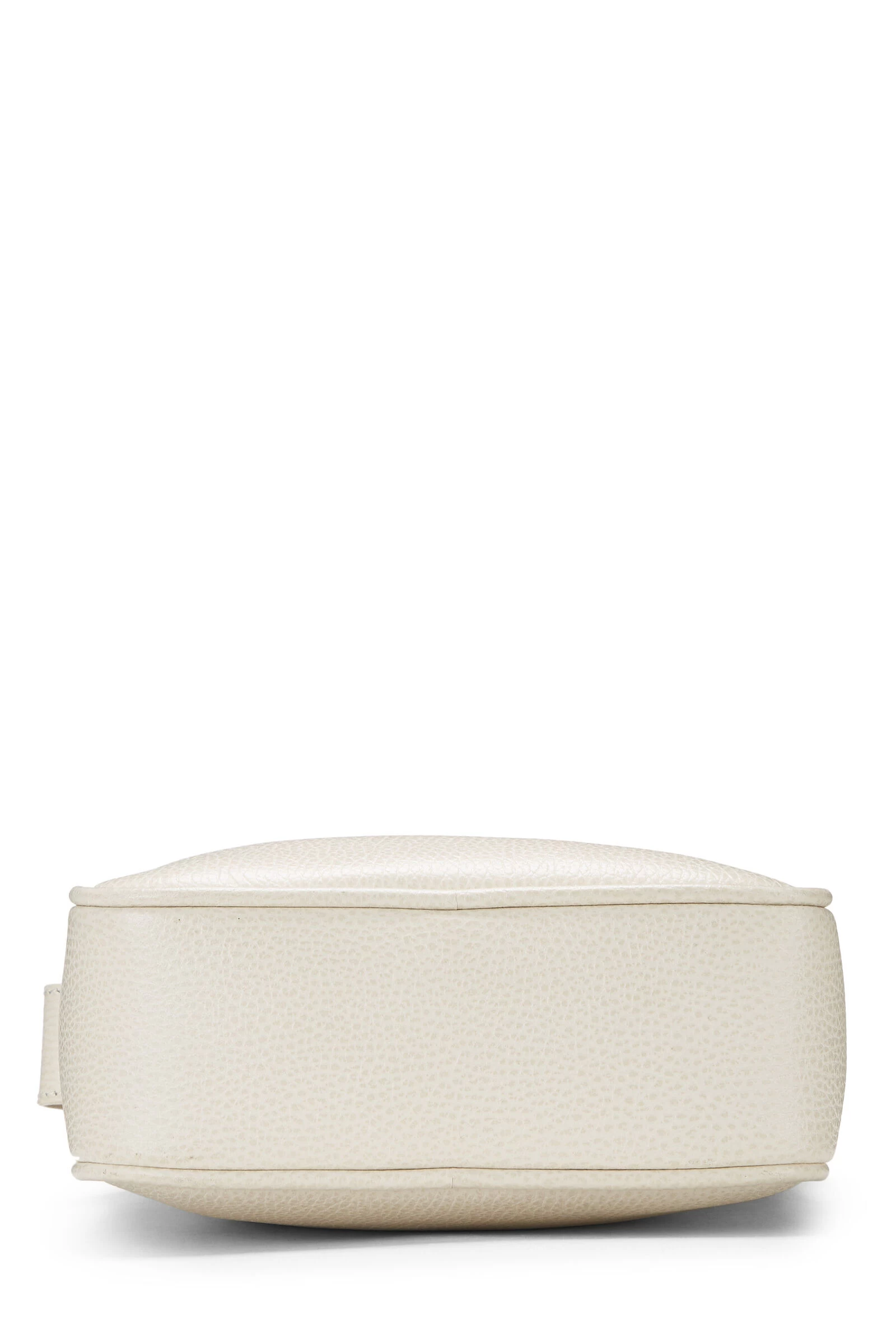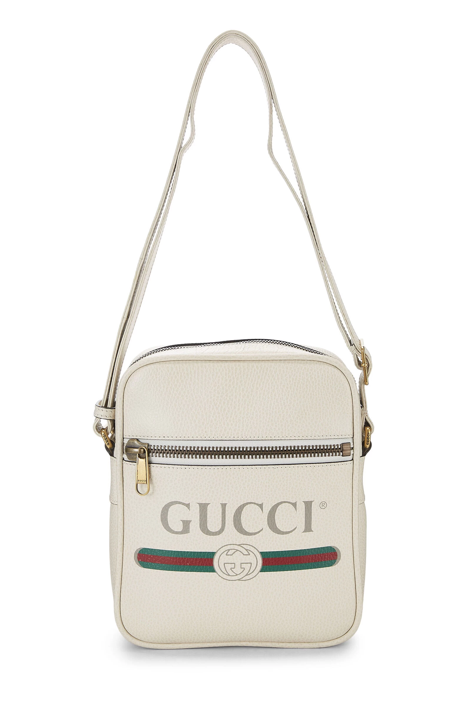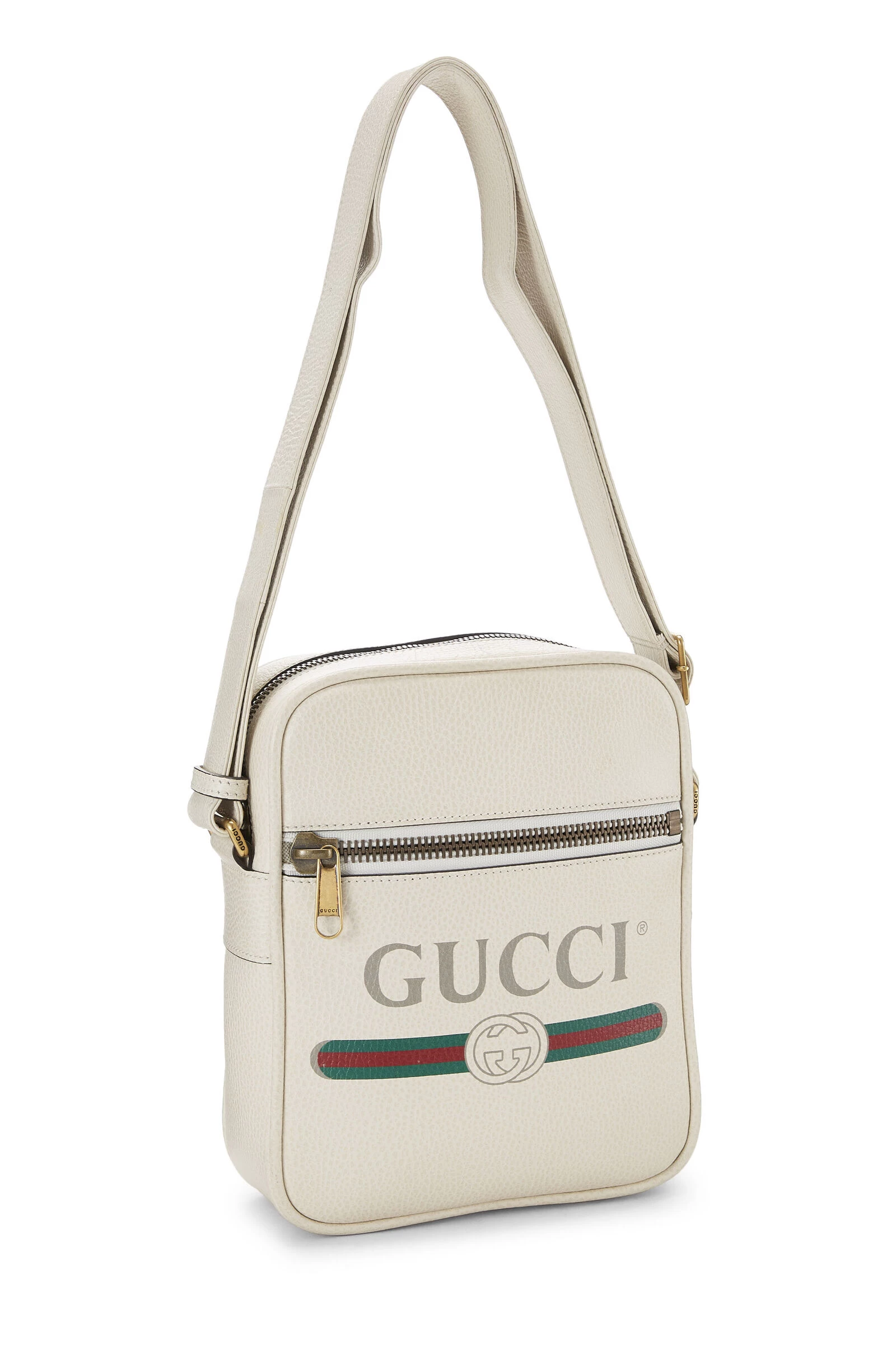 Eye-catching and perfect for on-the-go wear, this Gucci messenger bag is rendered in white grained leather, featuring multicolor logo prints on the front, and accented with antiqued gold-tone hardware.