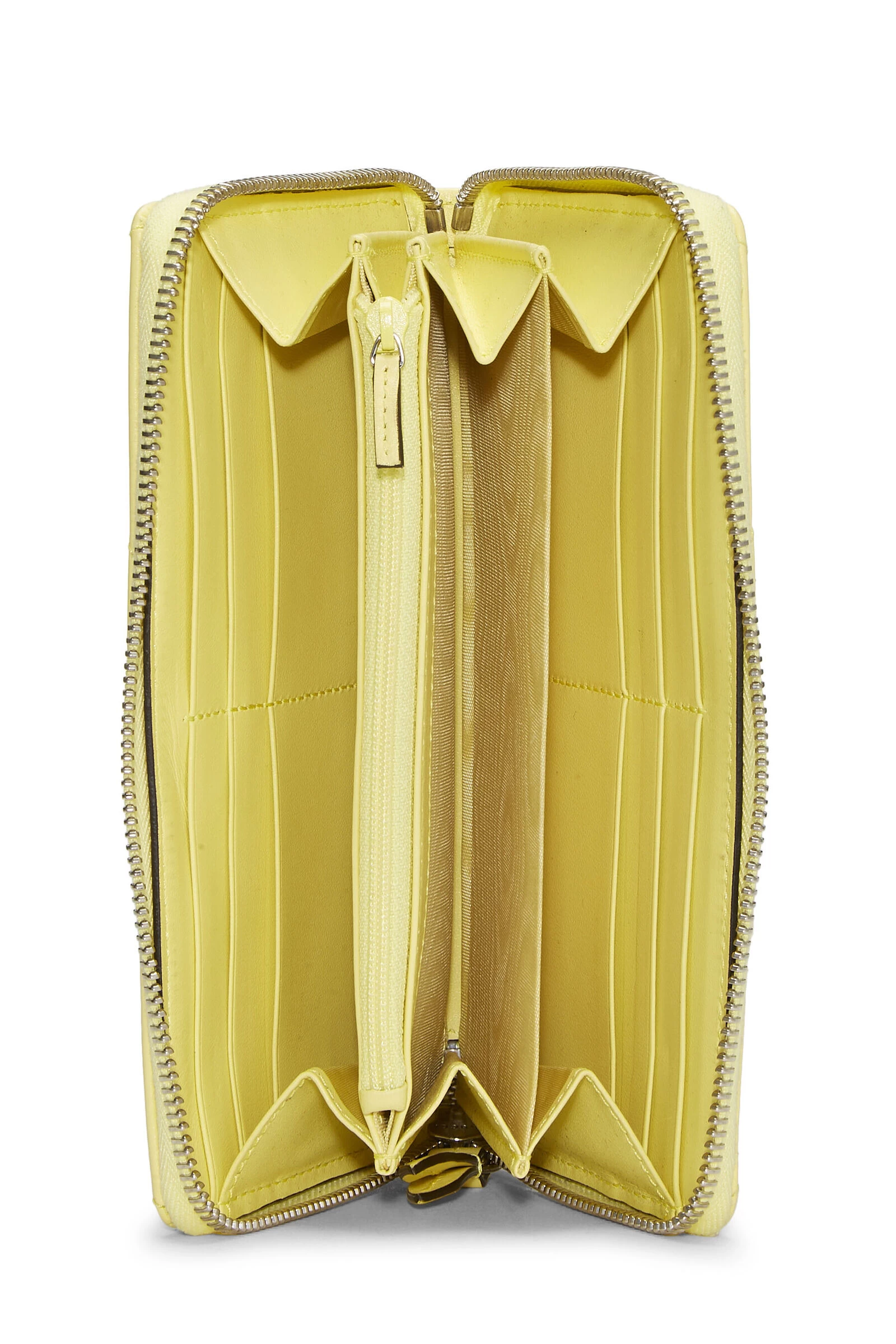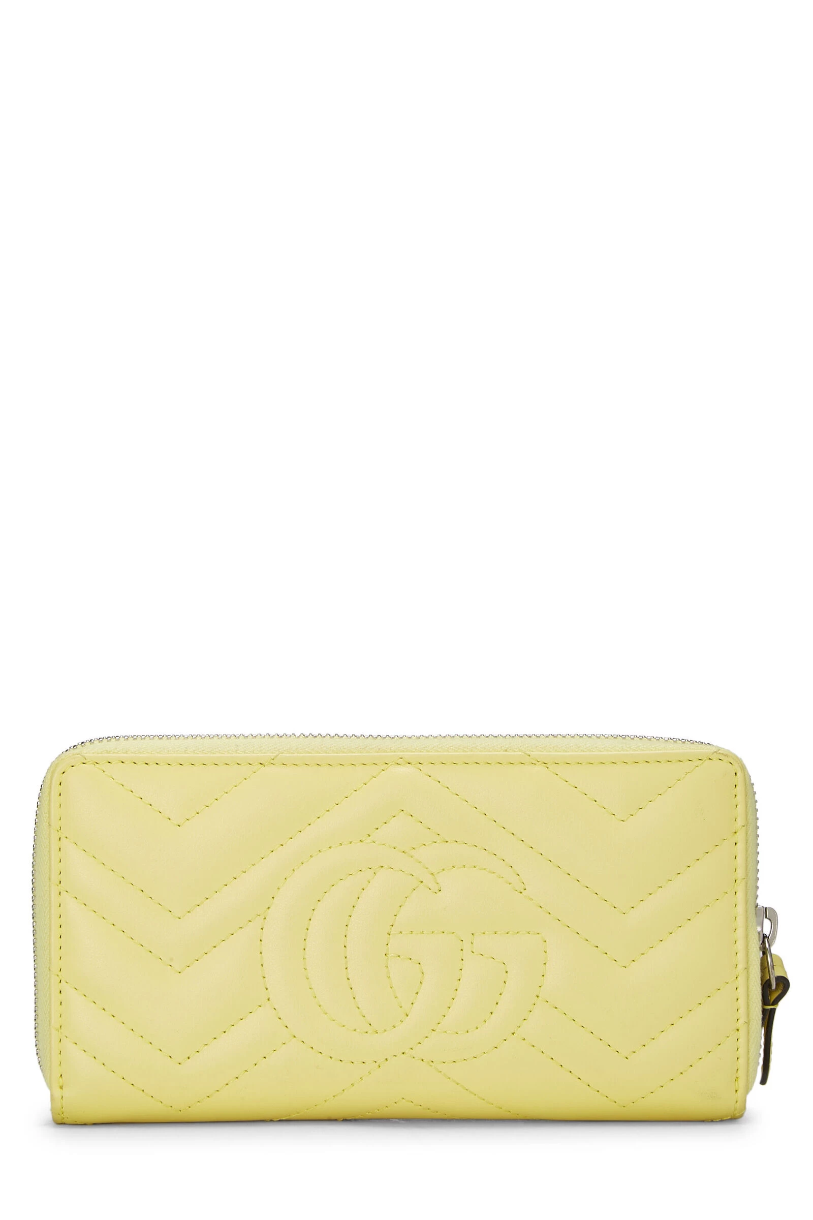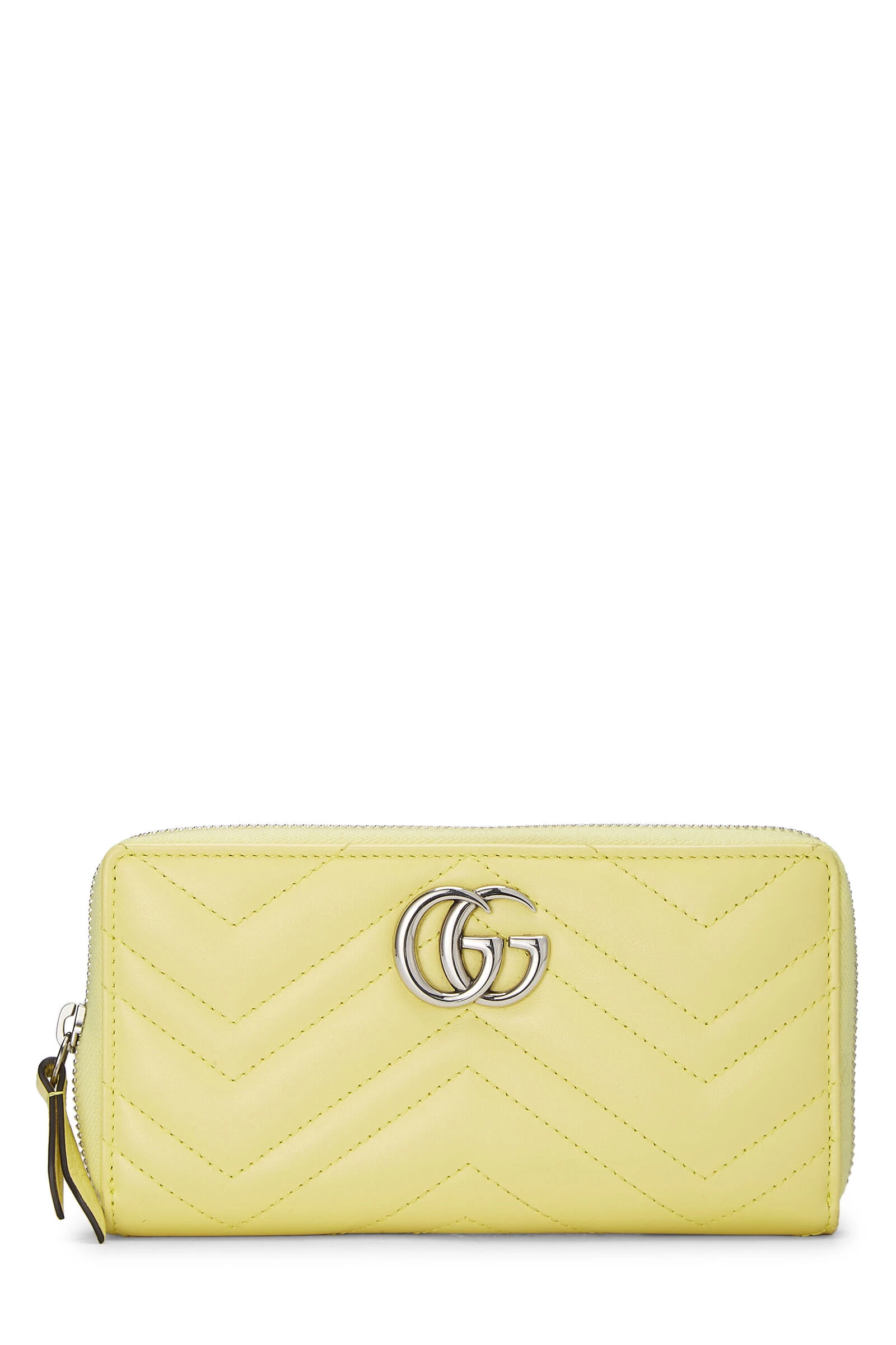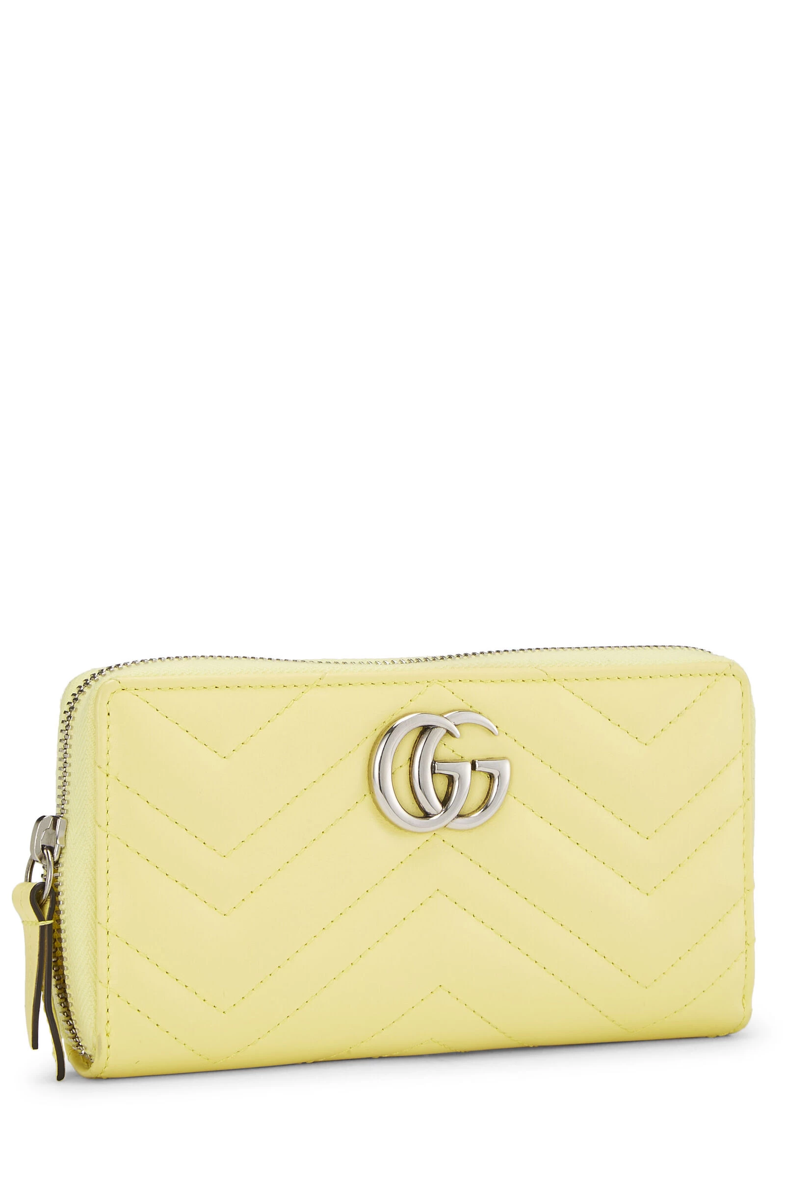 Classic Gucci Marmont wallet rendered in yellow chevron-quilted leather, featuring a Running ‘GG’ logo at the exterior and finished with silver-tone hardware.