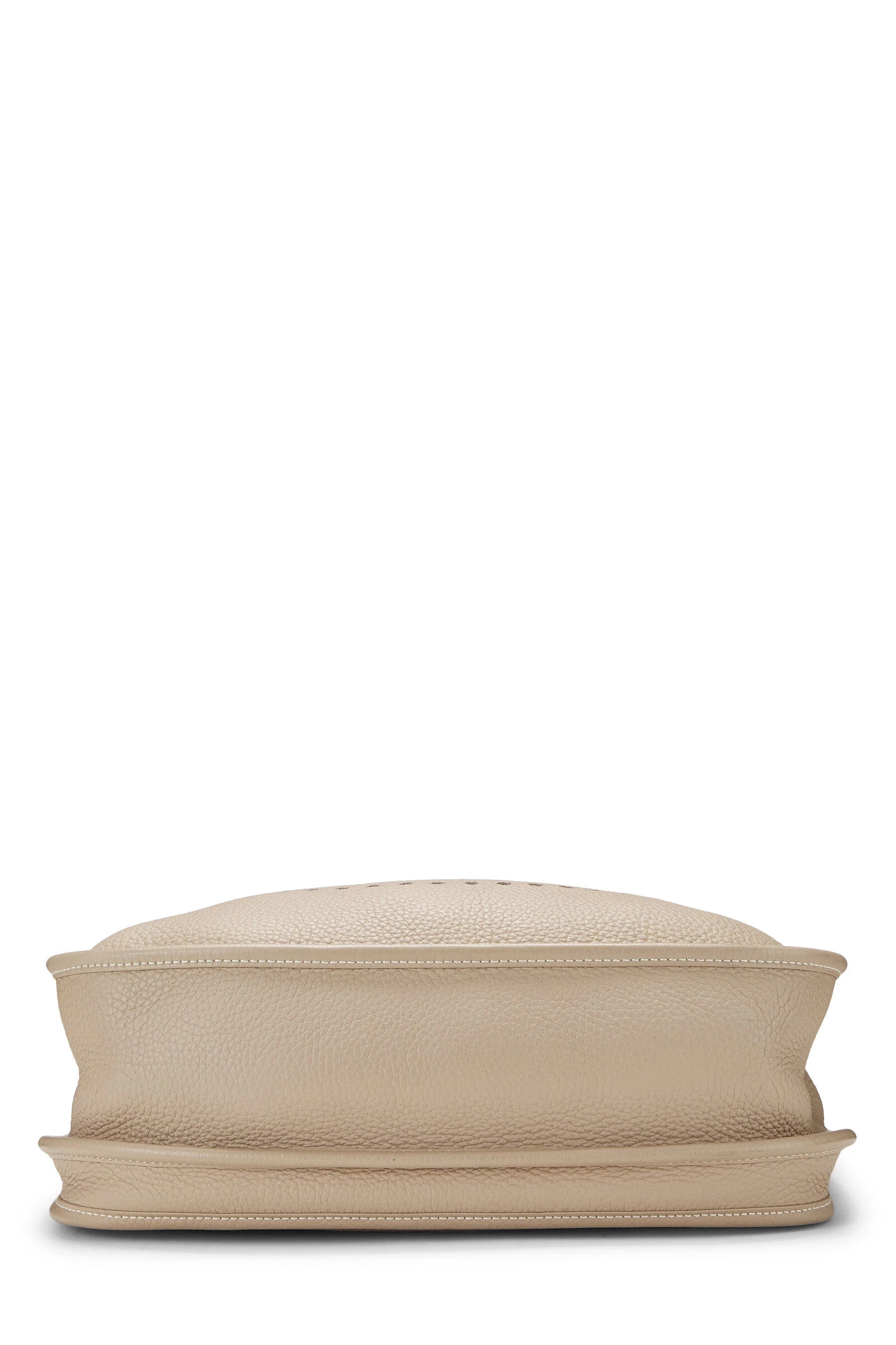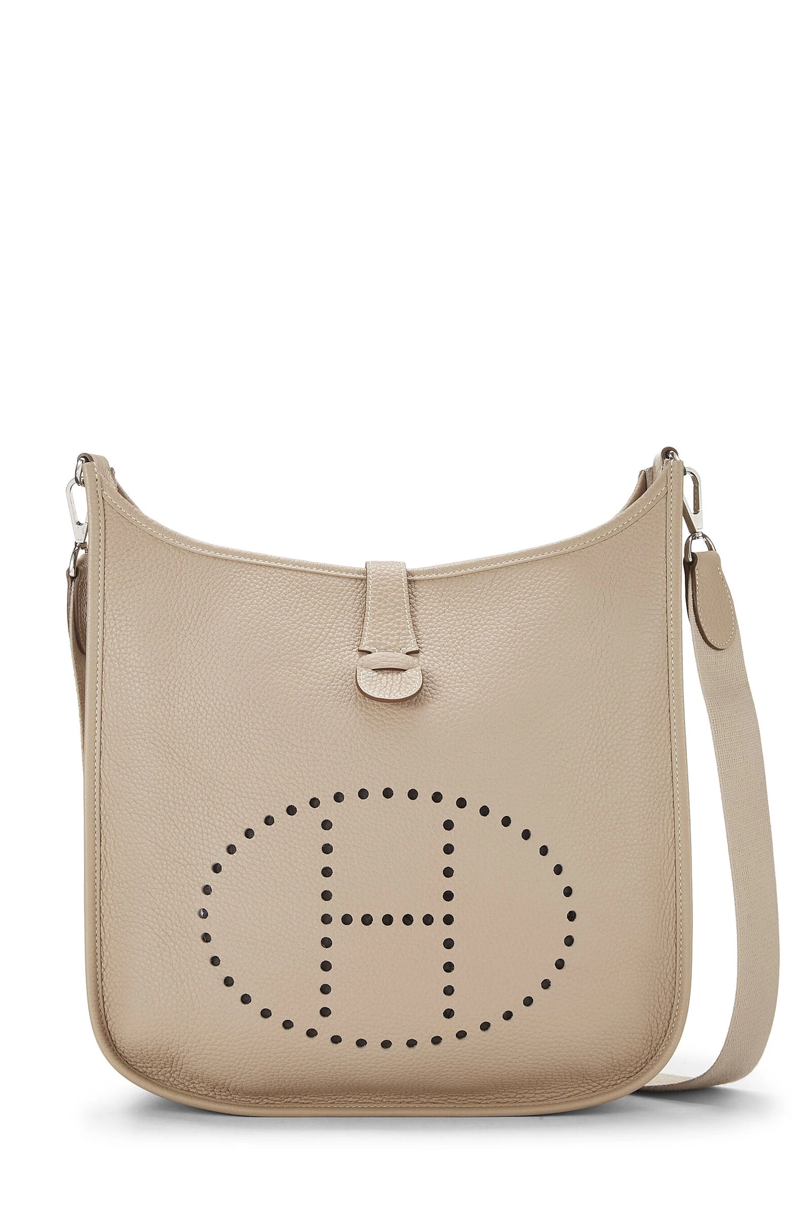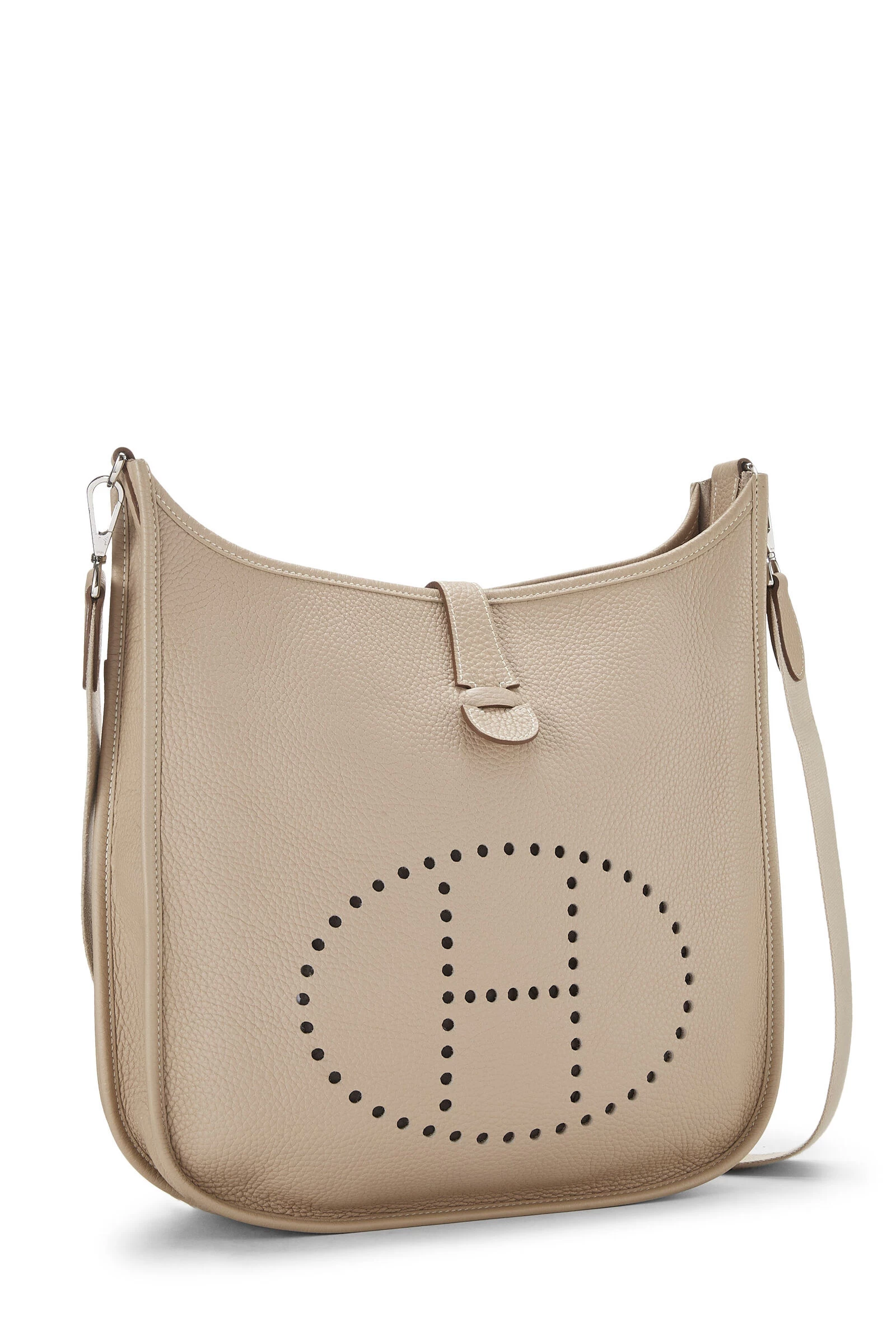 Beige Clemence leather Evelyne III GM accented with Palladium hardware. Clemence leather is a thick and durable calfskin with a medium textured grain known for resisting scratches, its ability to be refurbished and a soft relaxed feel with use.
