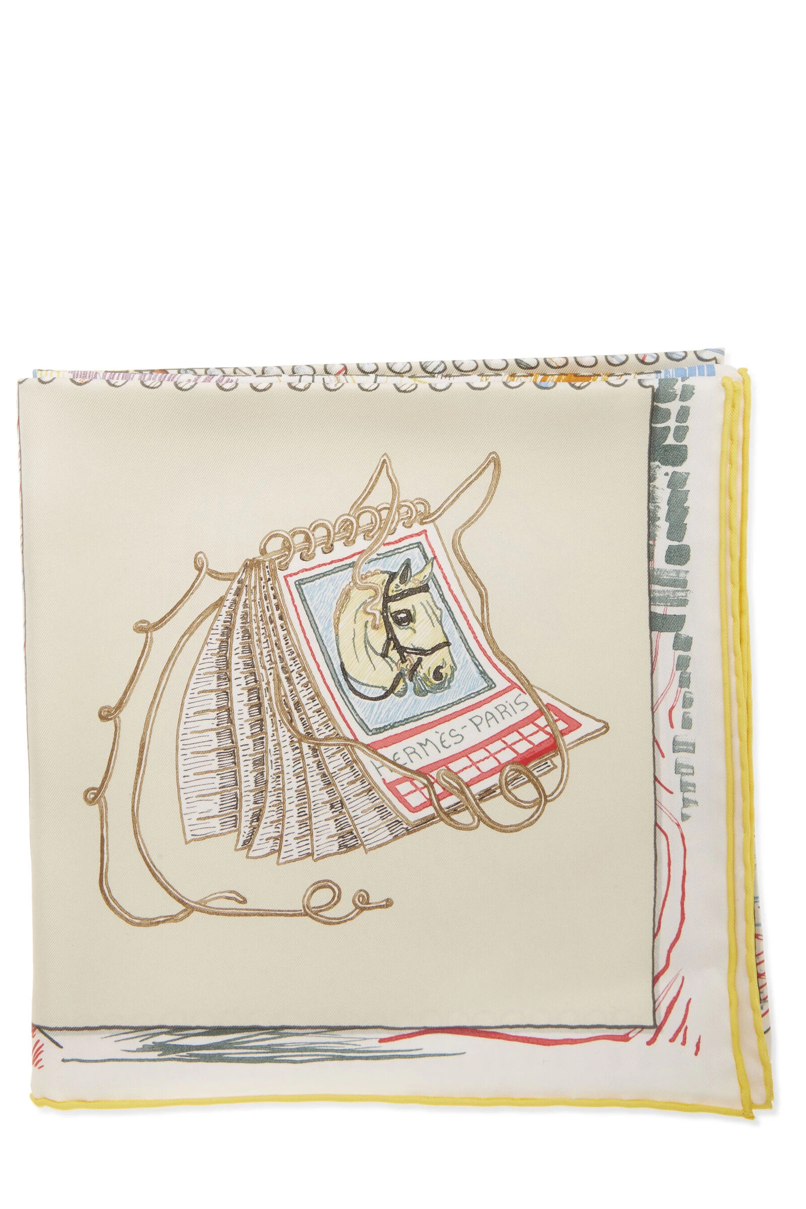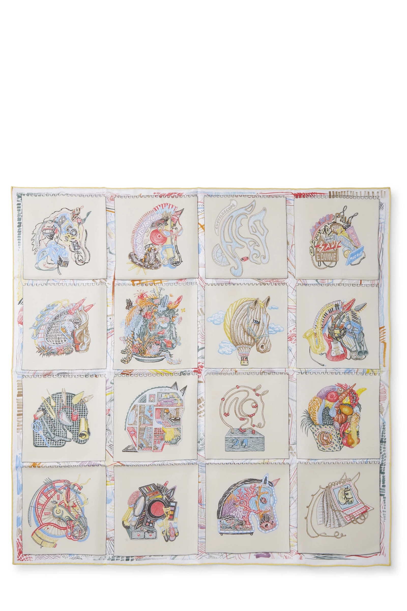 Classic Hermès silk scarf featuring beige and multicolor ‘Chevaloscope’ abstract horse motif, finished with hand-rolled edges. 100% Silk. Artist Elias Kafouros.