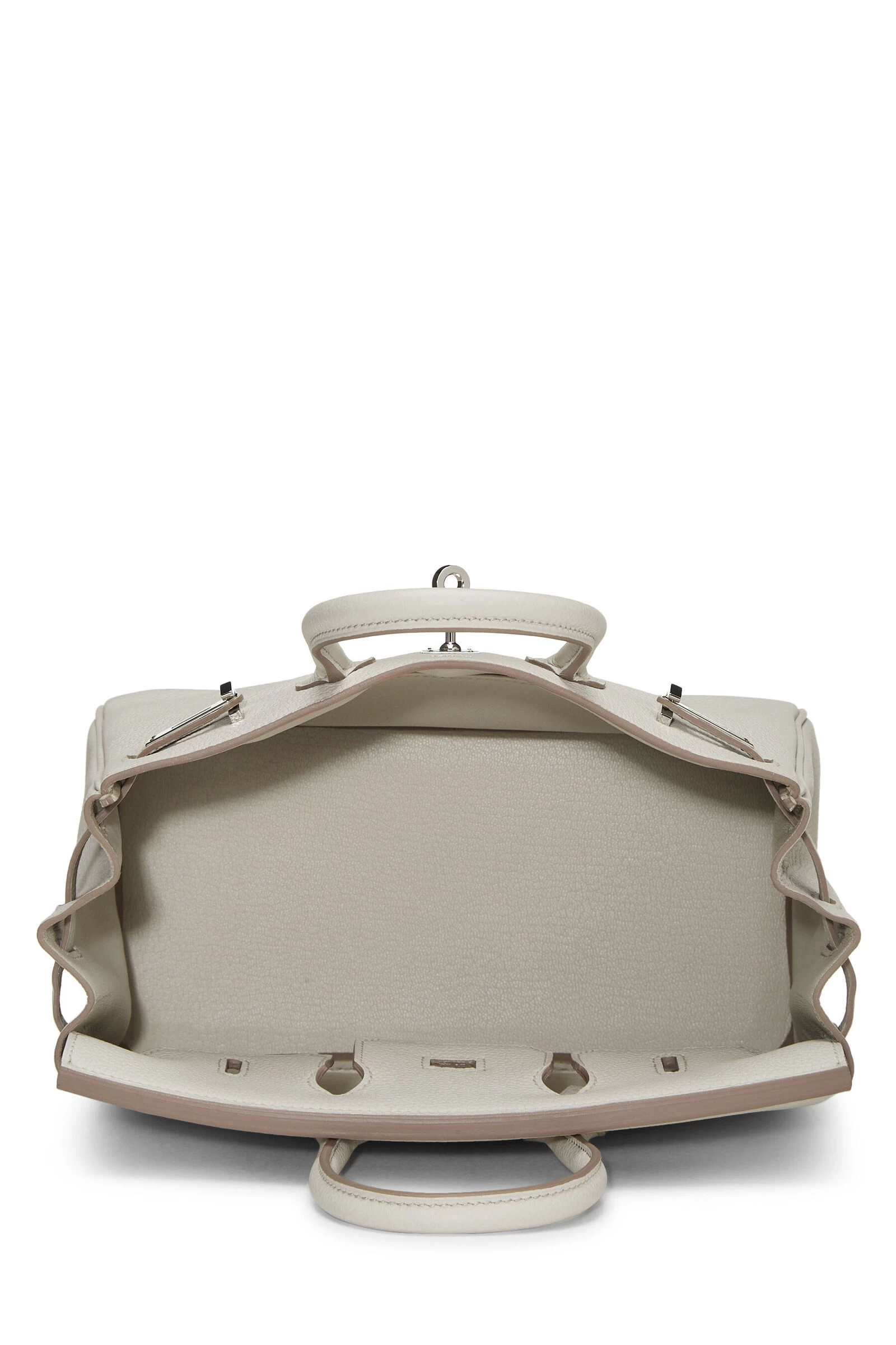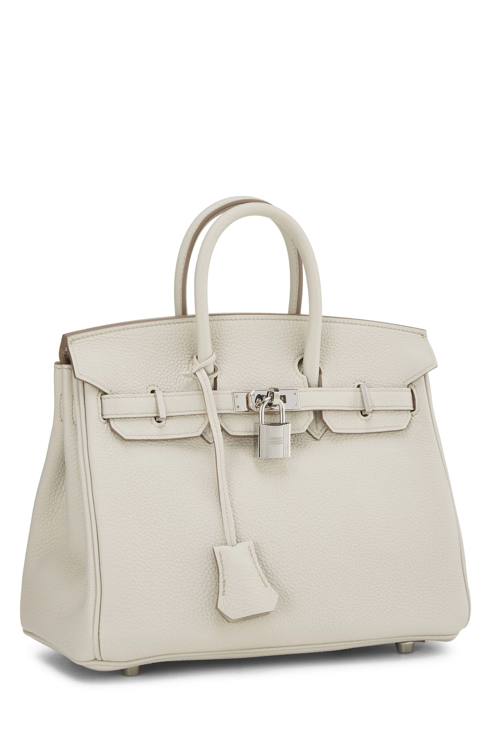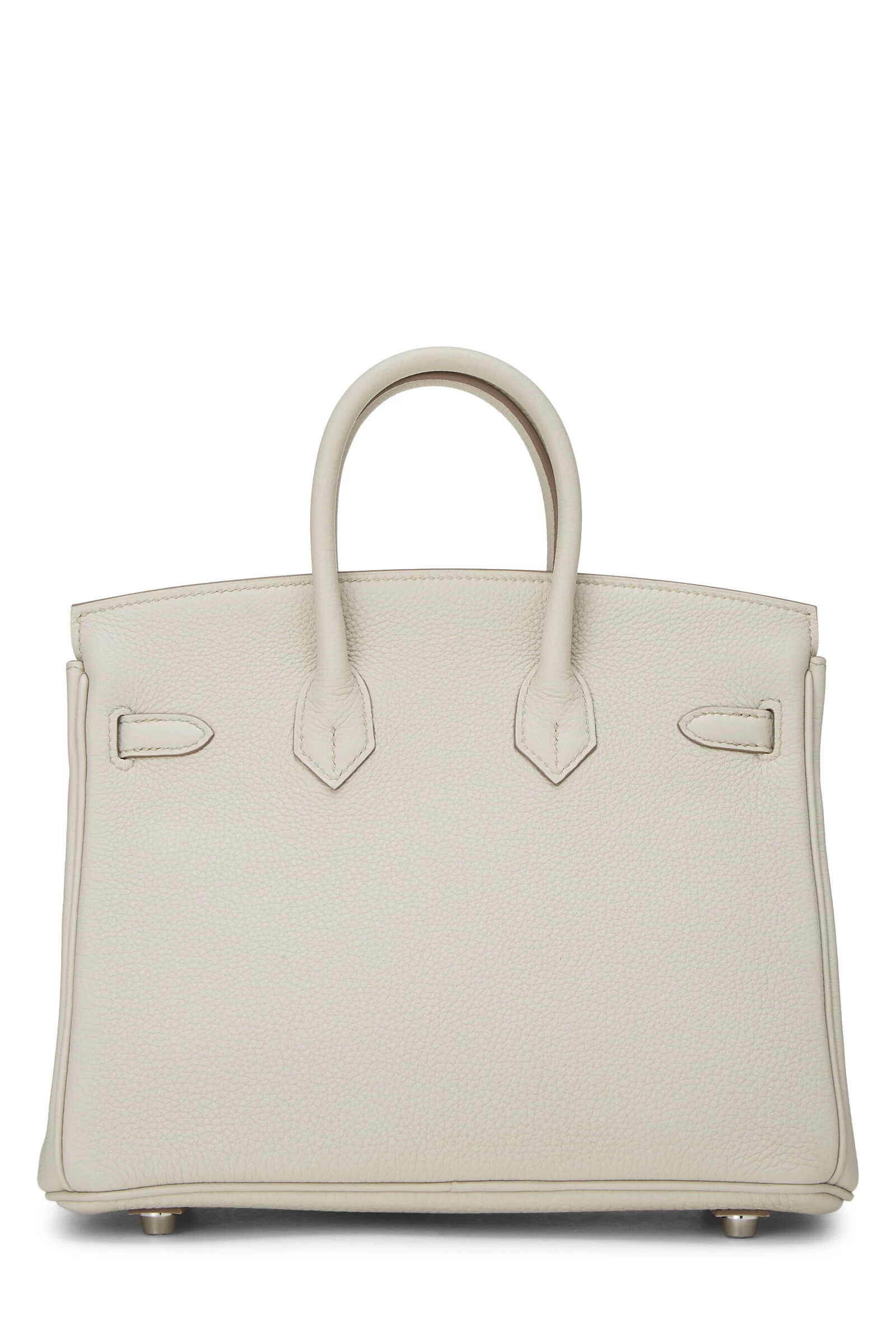 Classic Birkin 25cm rendered in cream Beton Togo leather and accented with Palladium-plated hardware. Togo leather is a thick and durable calfskin with a medium grain known for its resilience to scratches and ability to be repaired easily. Includes lock, two keys, and clochette.