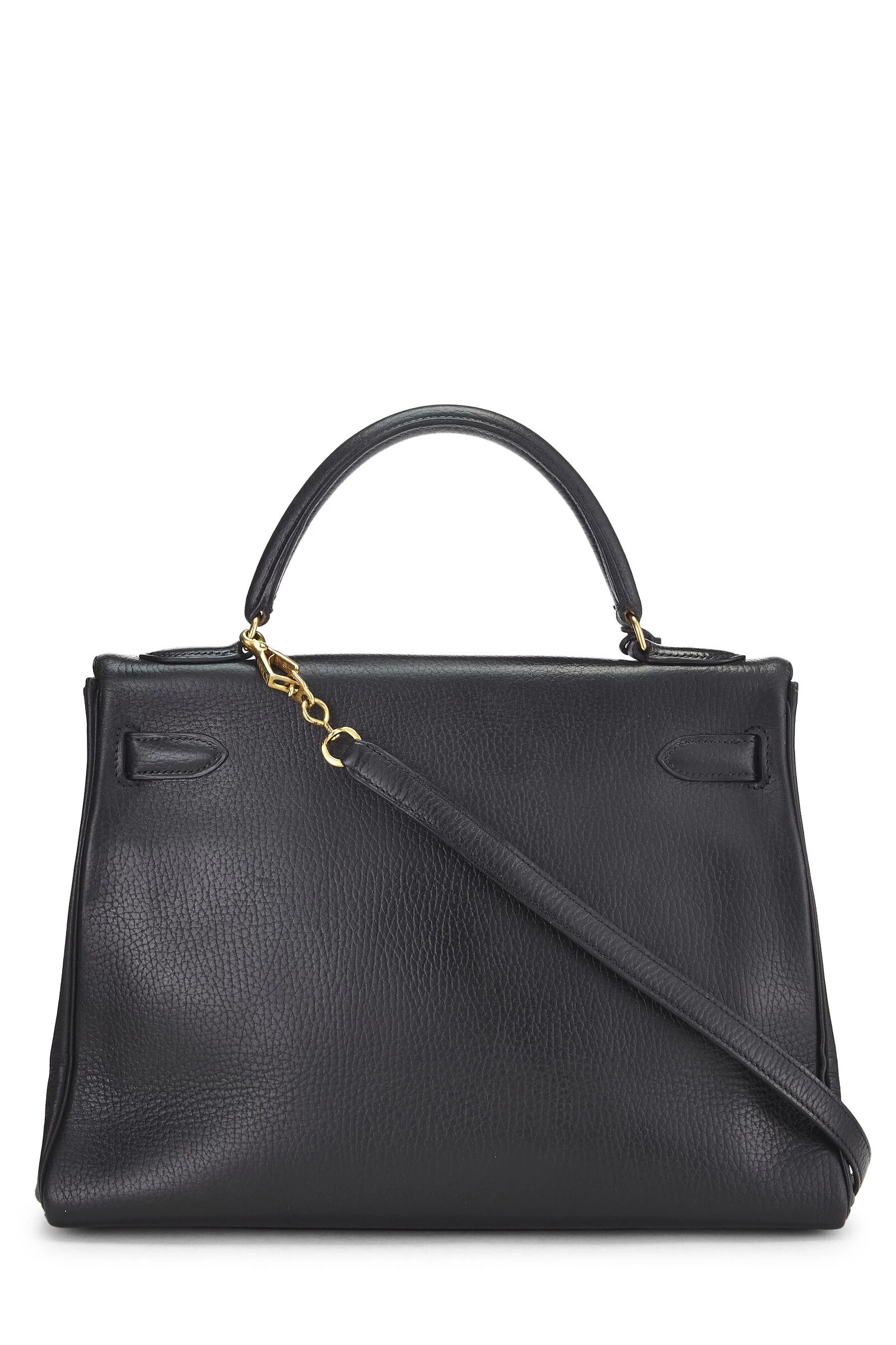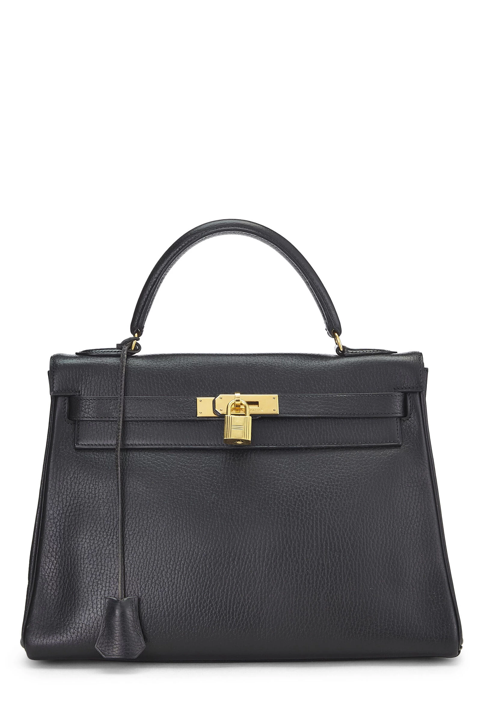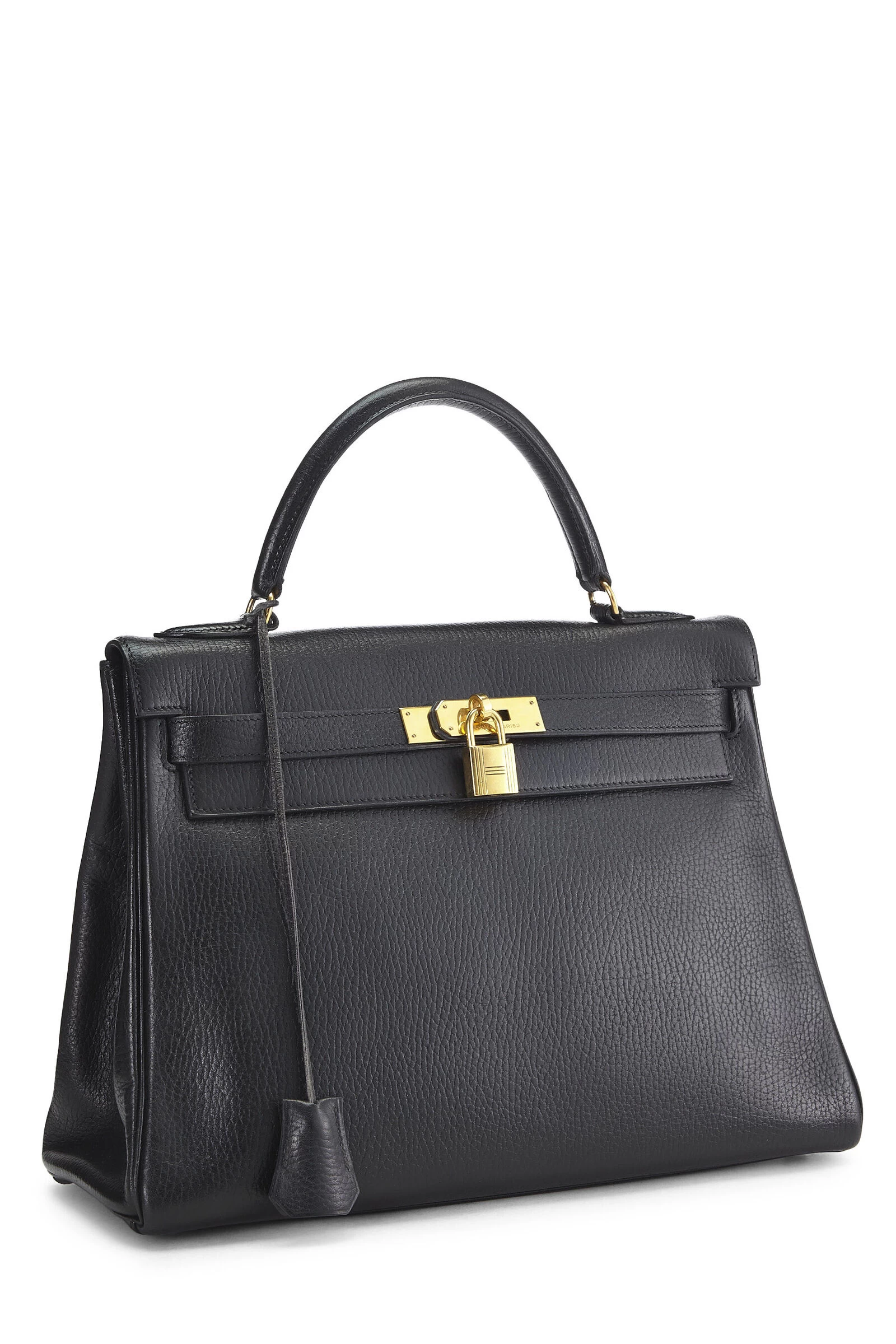 Classic black Ardennes leather Kelly accented with gold-plated hardware. Ardennes is a sturdy calfskin leather with raised visible grain known for its durability against moisture, scratches and slouching. Includes lock, two keys and clochette.