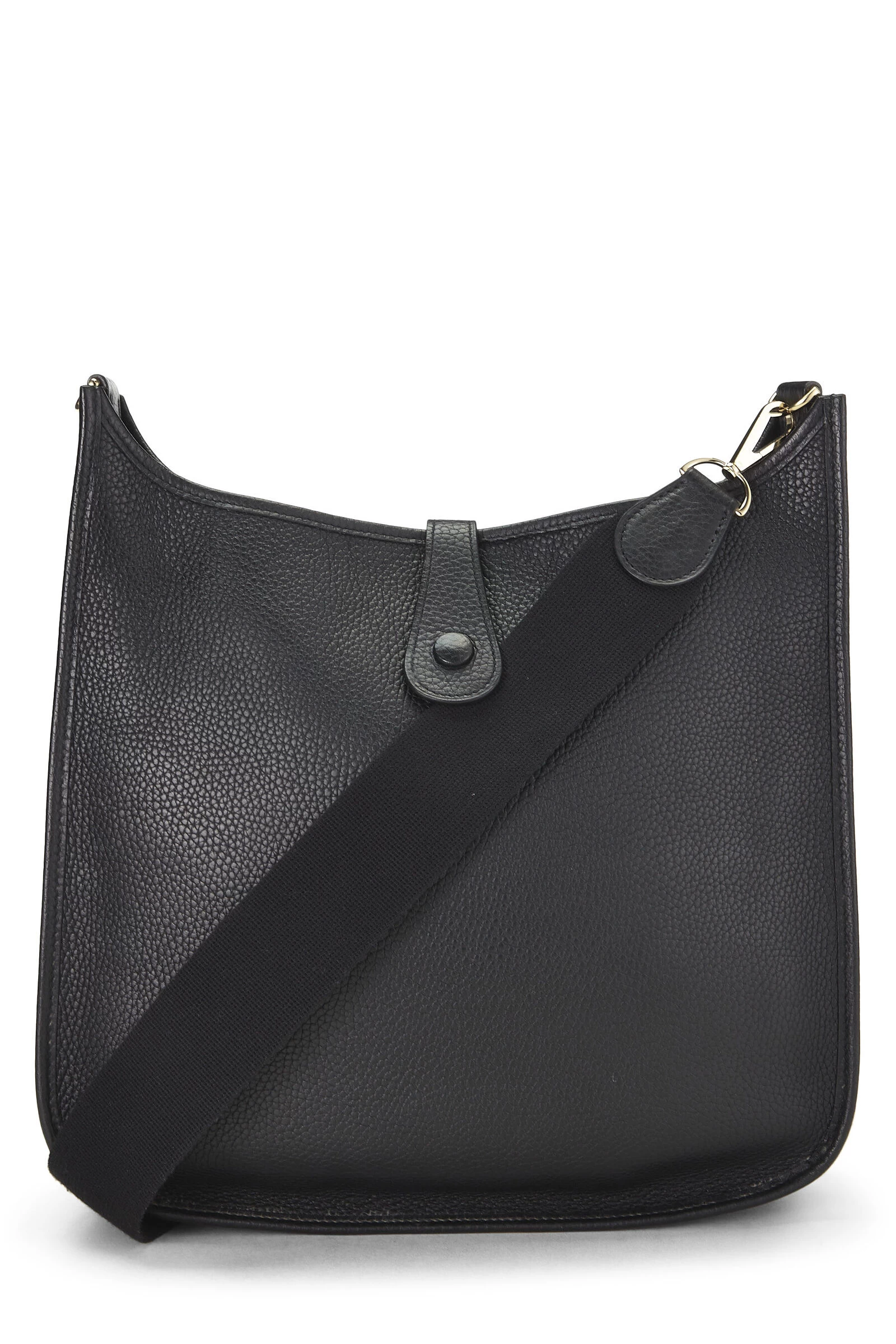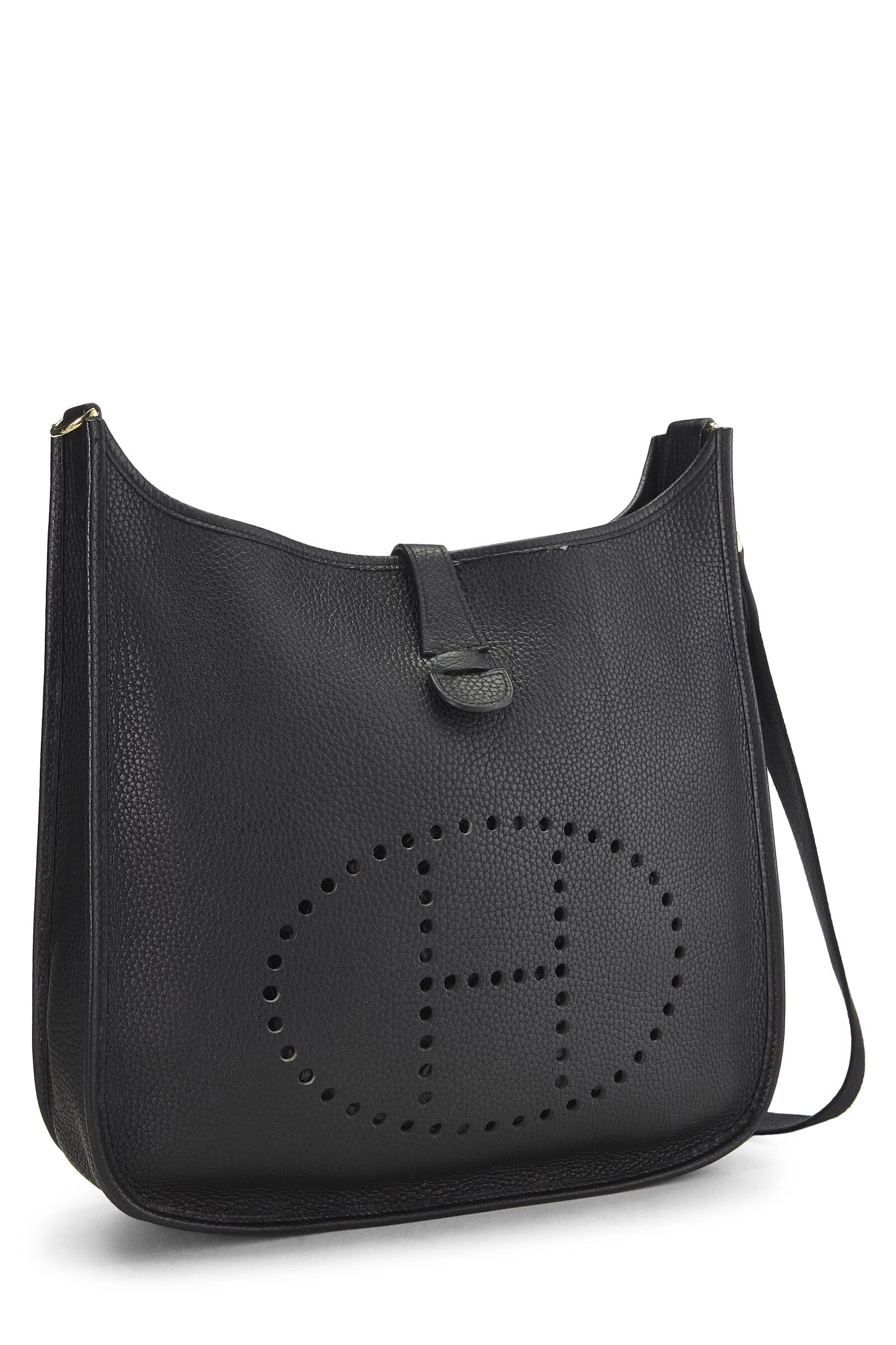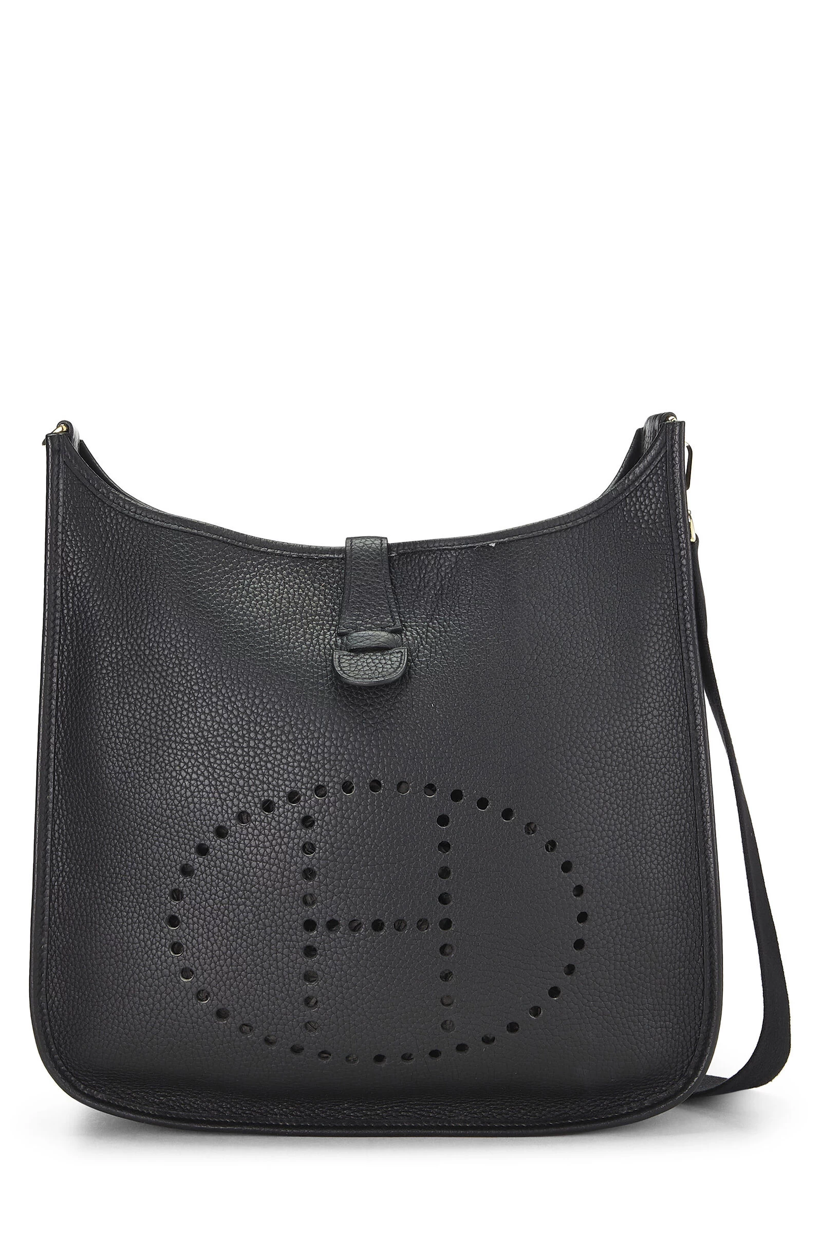 Black Clemence leather Evelyne I GM accented with gold-tone metal hardware. Clemence leather is a thick and durable calfskin with a medium textured grain known for resisting scratches, its ability to be refurbished, and a soft relaxed feel with use.