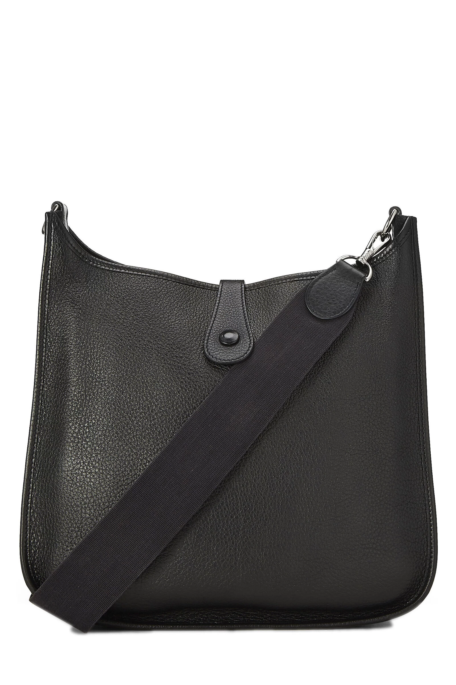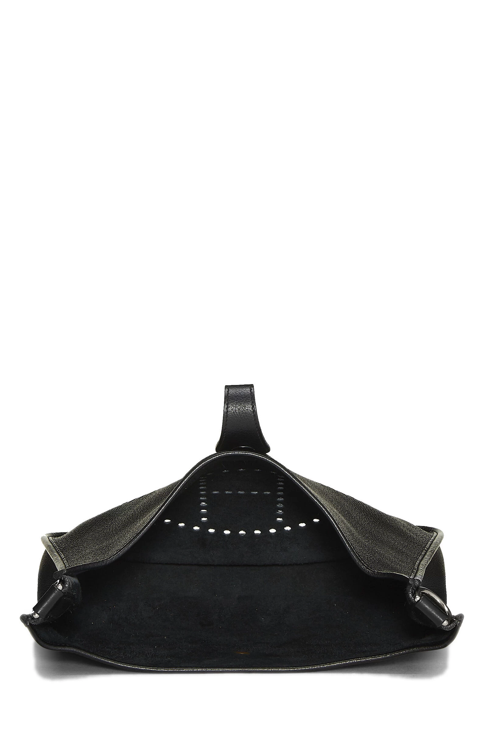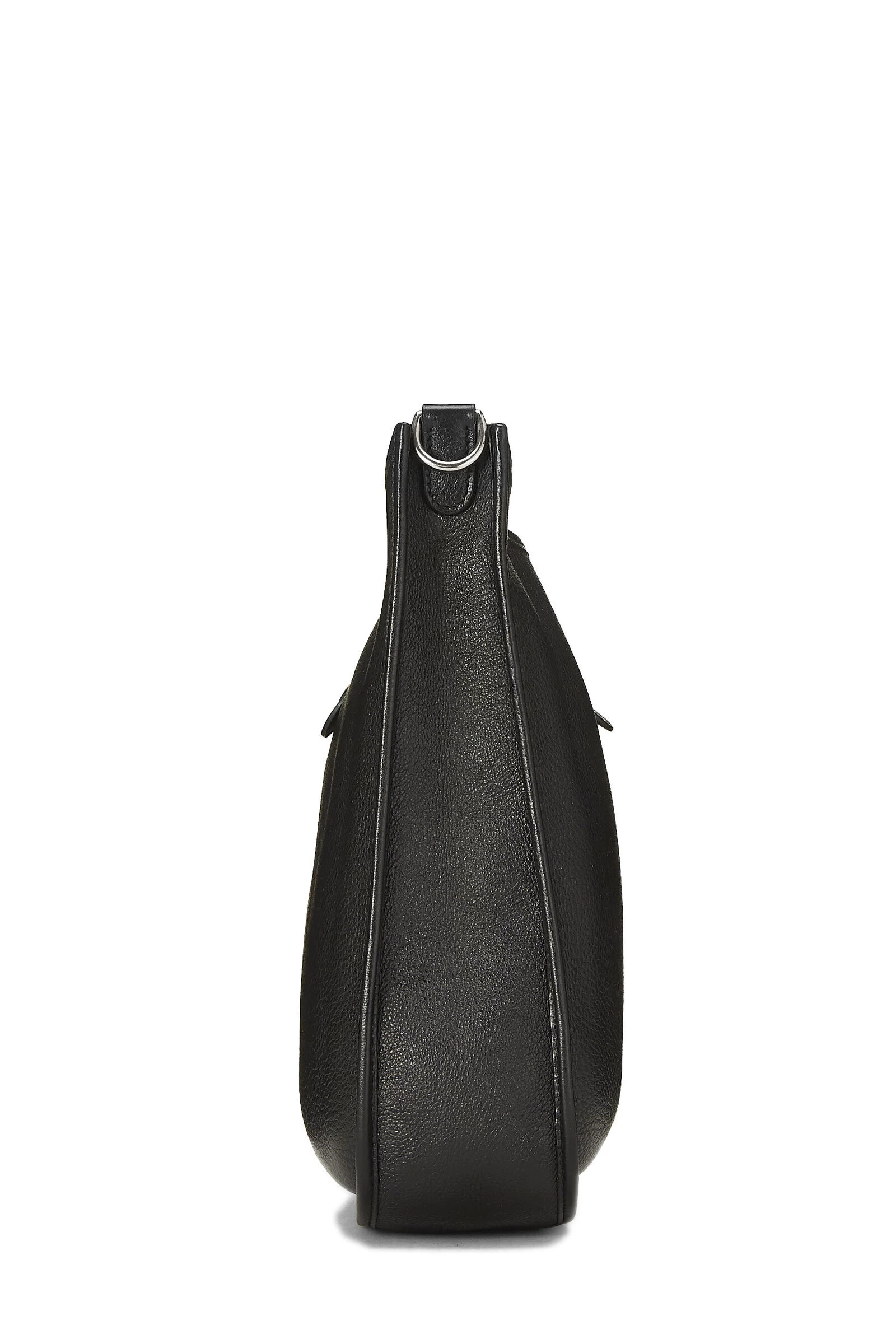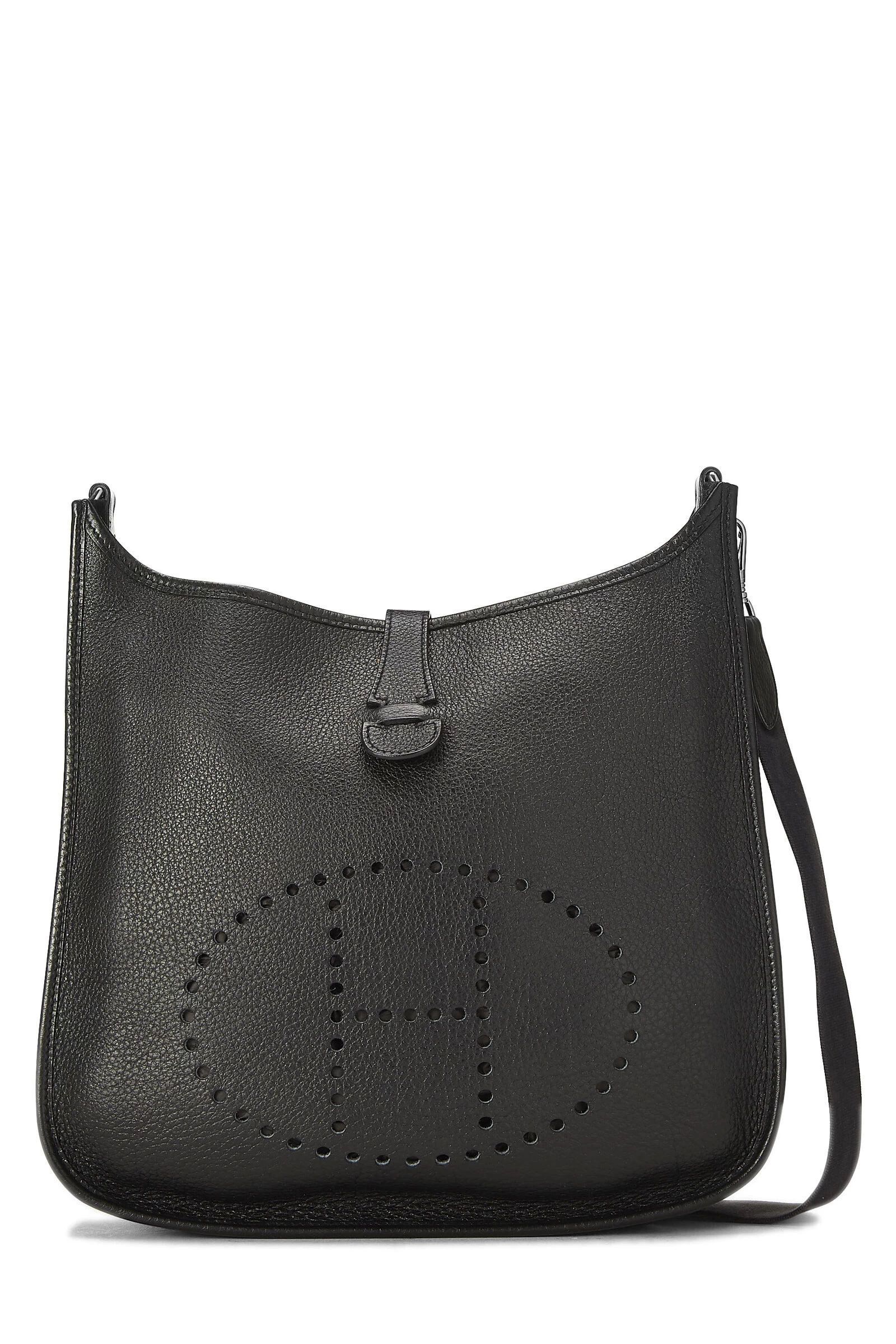Black Clemence leather Evelyne I PM with Palladium-plated hardware. Clemence leather is a thick and durable calfskin with a medium textured grain known for resisting scratches, its ability to be refurbished and a soft relaxed feel with use.