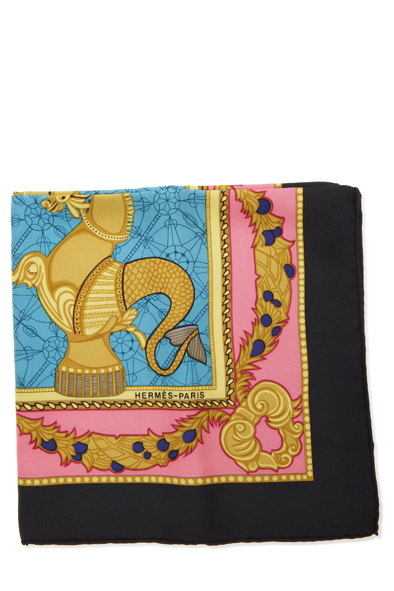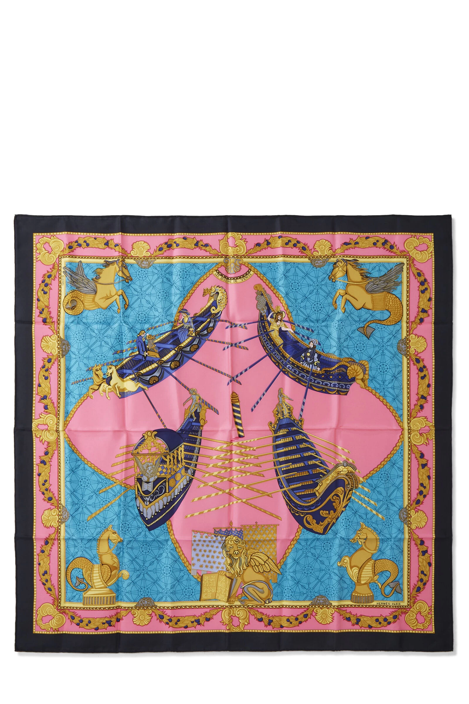 Classic Hermès silk scarf featuring black and multicolor ‘Les Bissone de Venise’ boats in Venice motif, finished with hand-rolled edges. 100% Silk. Artist Annie Faivre.