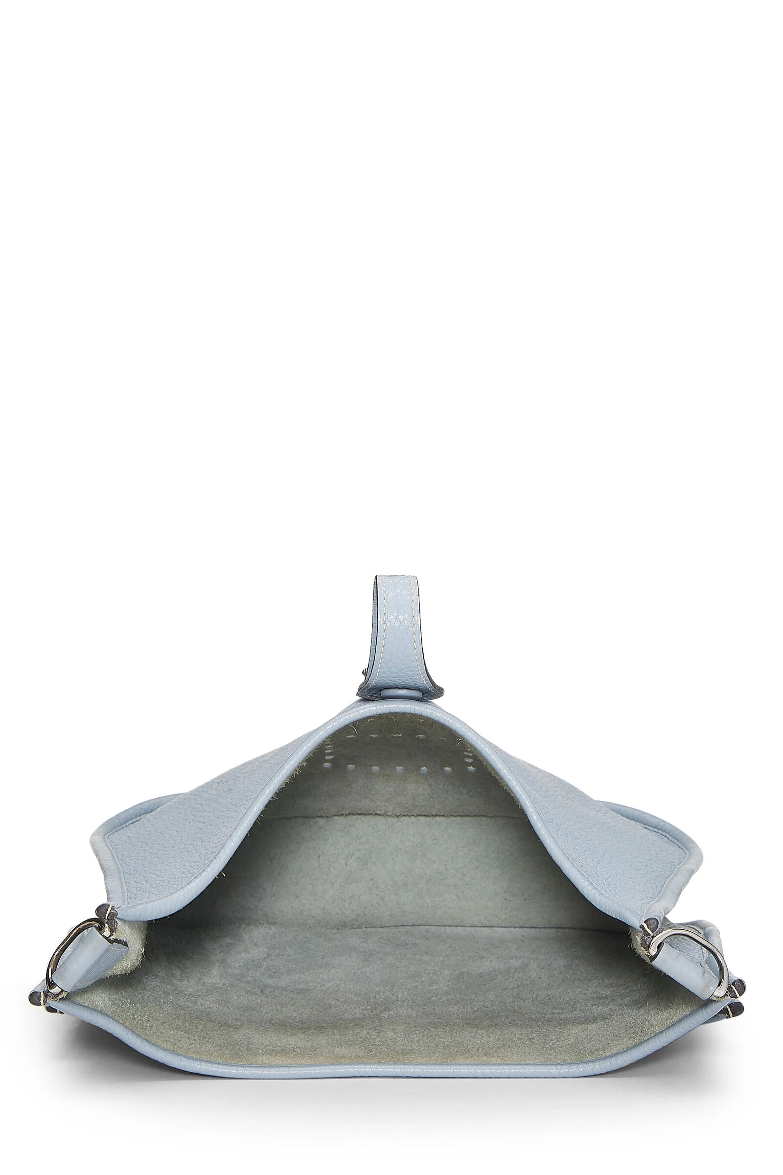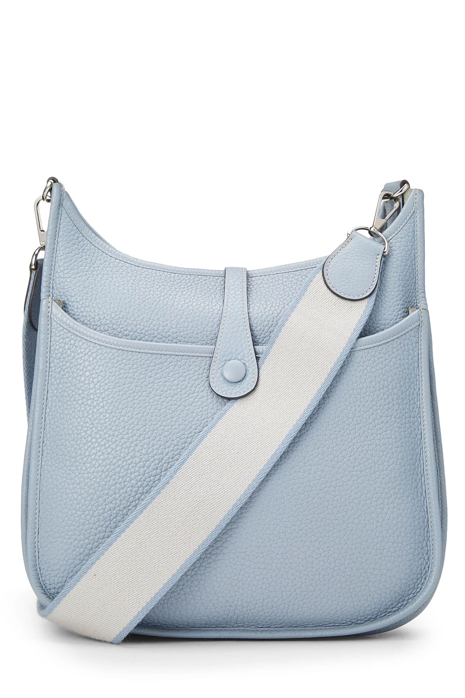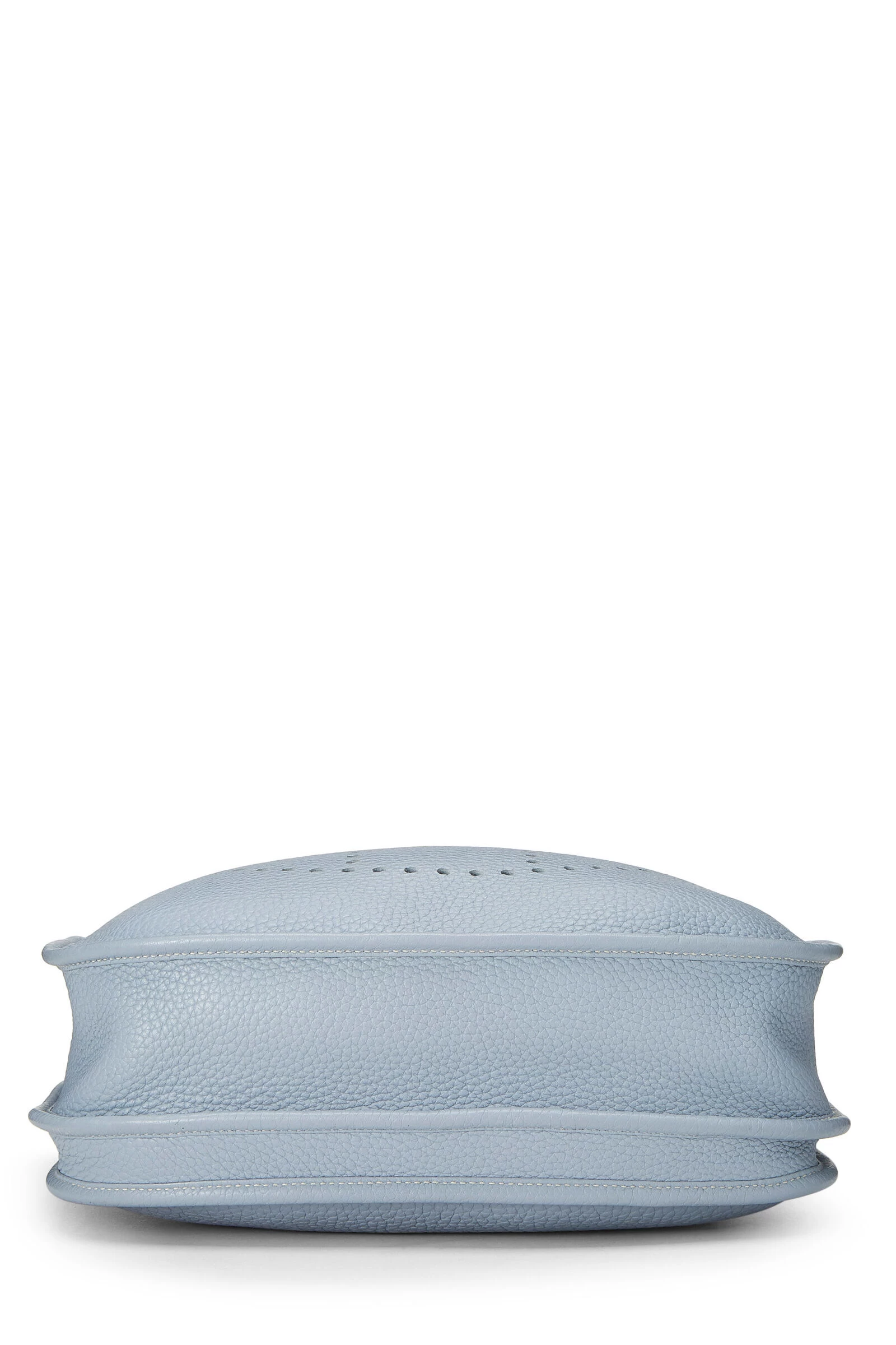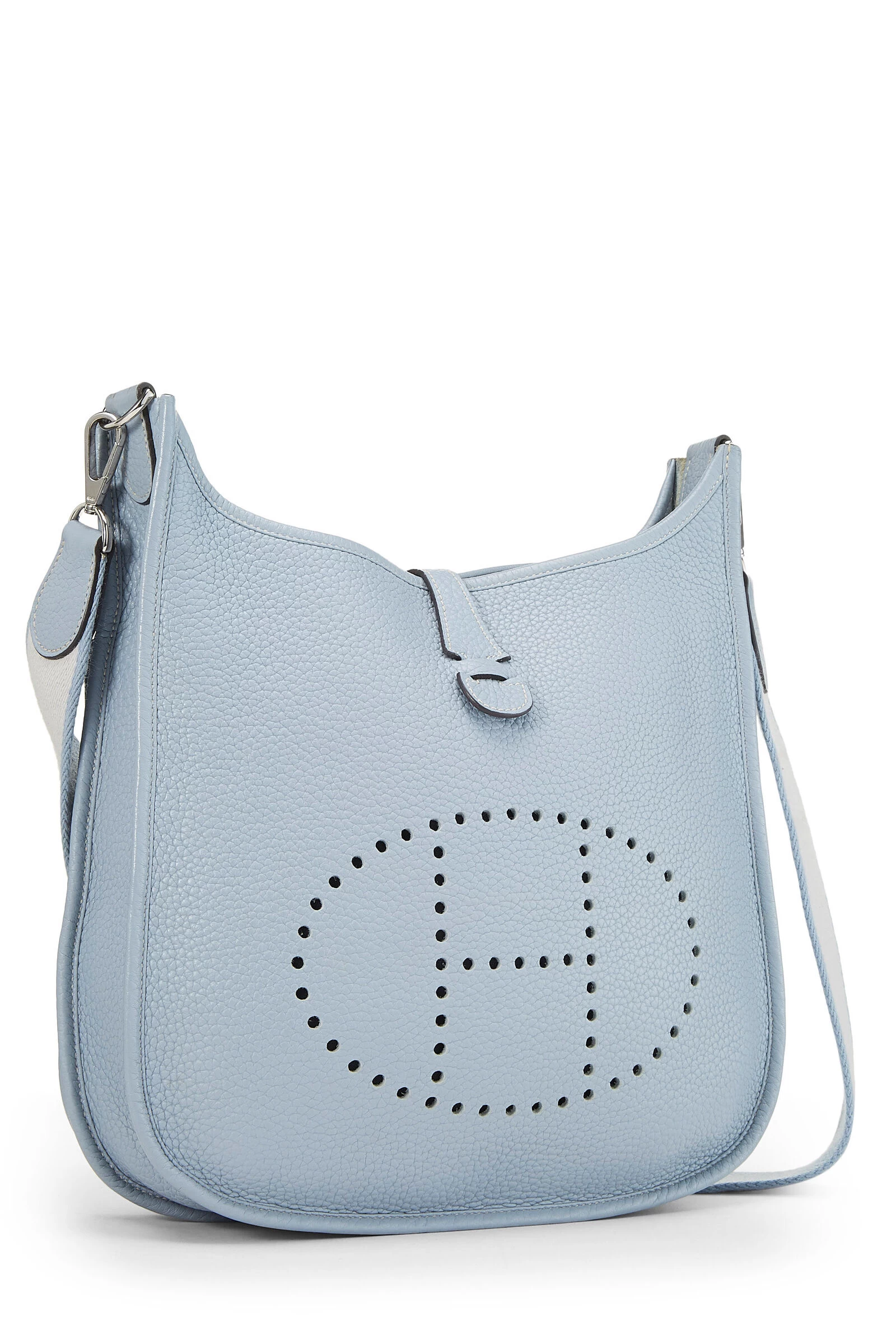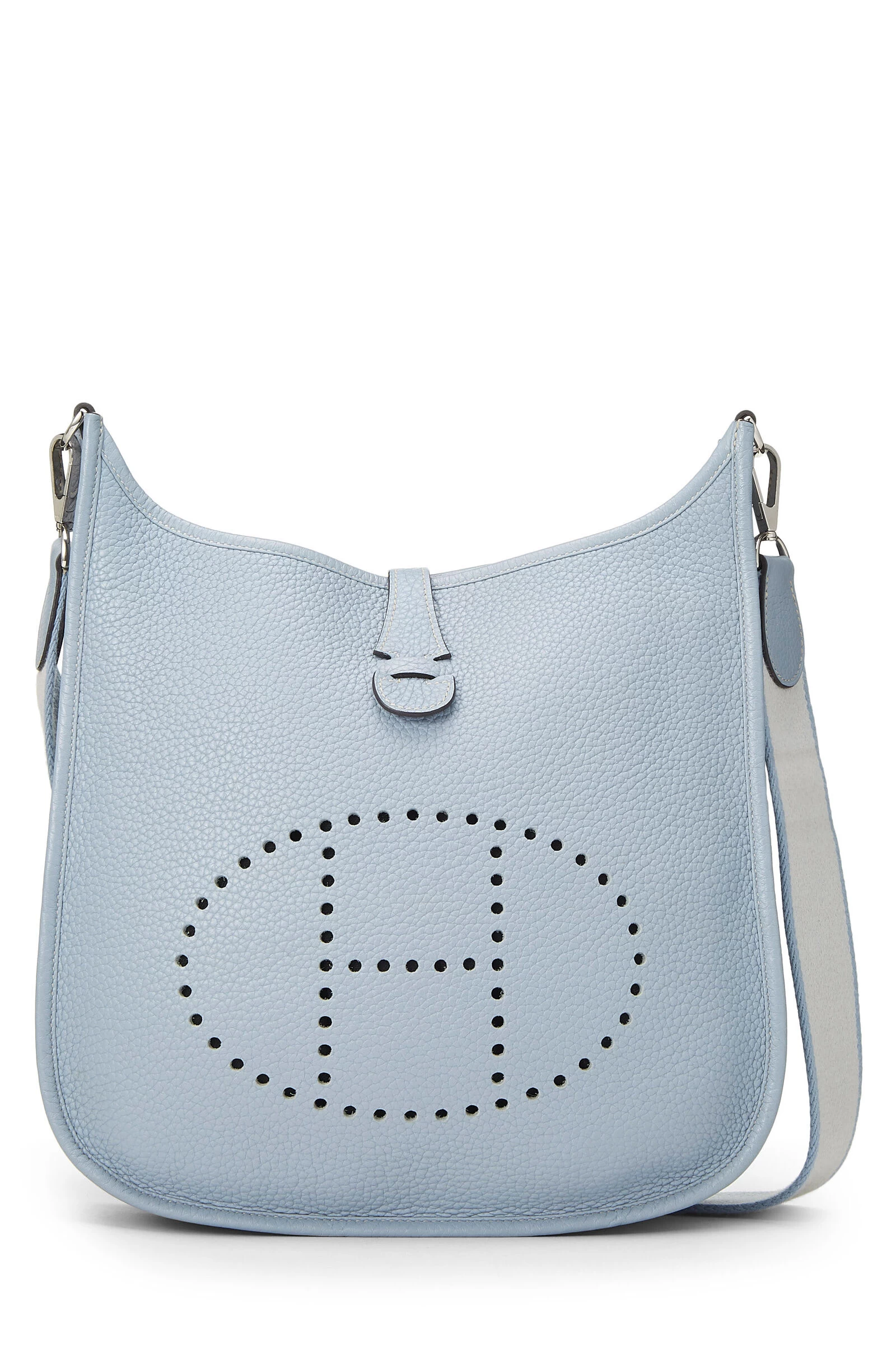 Classic Hermès Evelyne III Amazone bag rendered in Ciel blue grained leather, featuring perforated H at the exterior and finished with a cream and blue canvas shoulder strap.