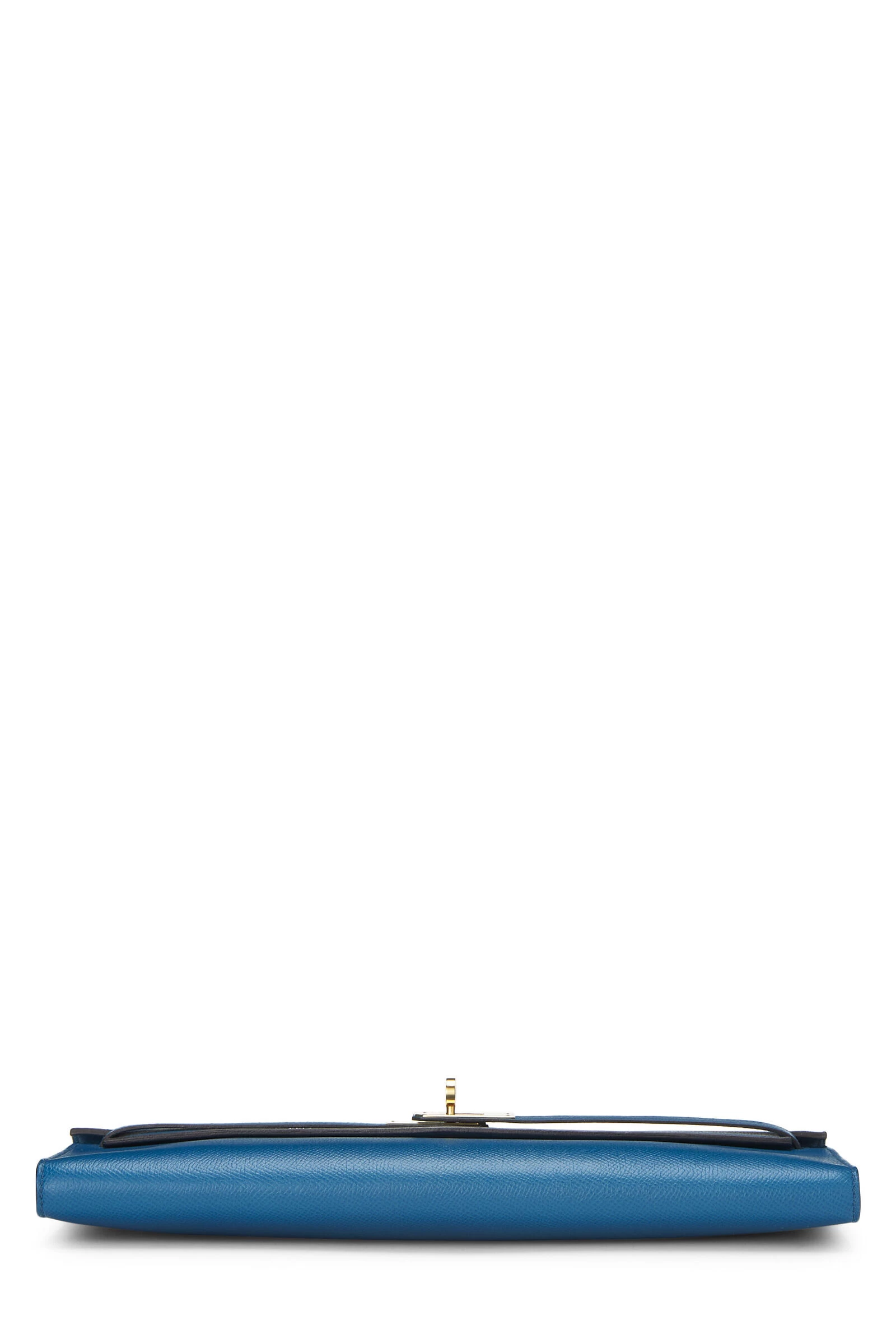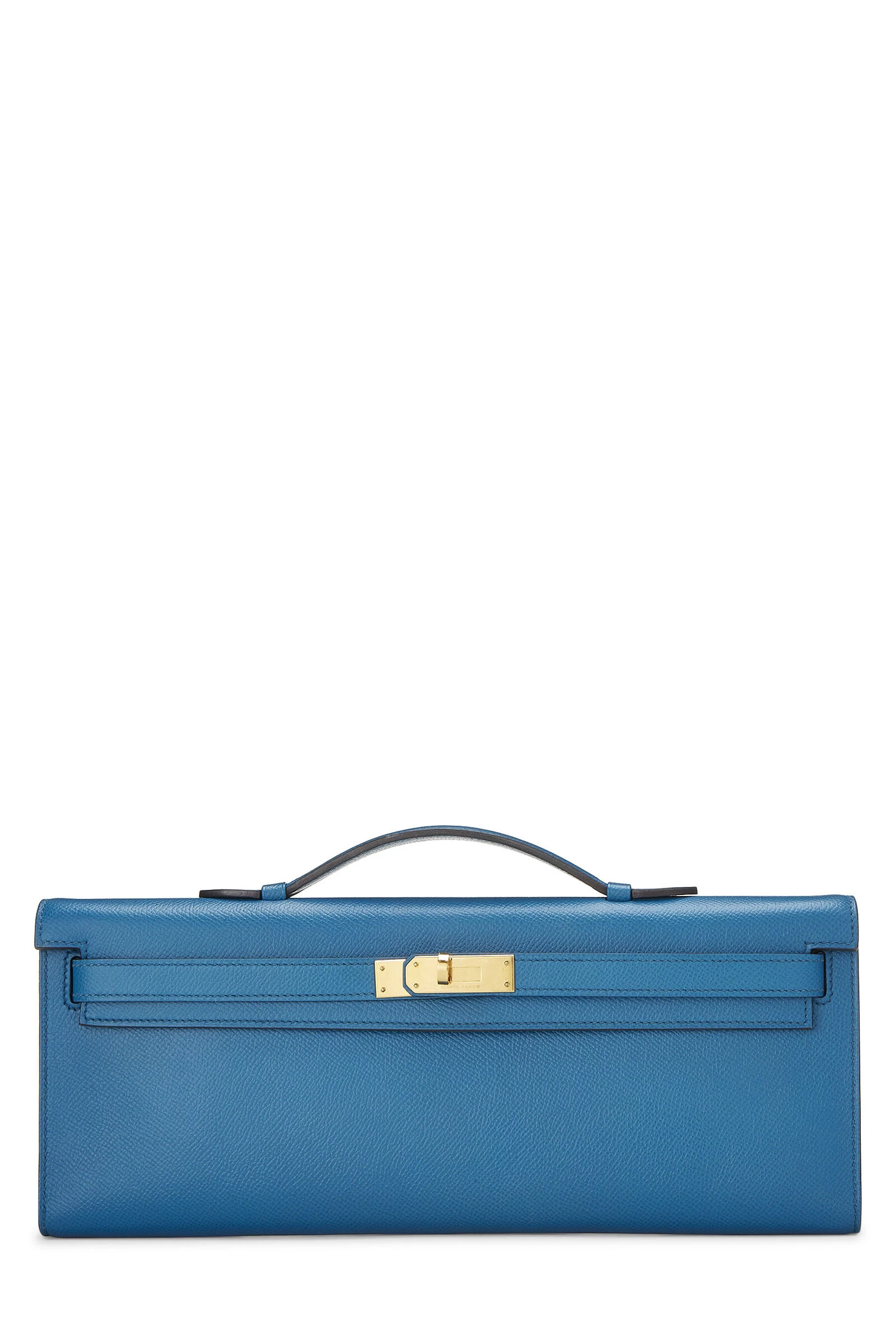 A compact version of the iconic Kelly, this Hermès Cut clutch is crafted in Blue Izmir Epsom leather with a leather top handle and signature Kelly lock hardware in gold-plated metal. Epsom leather is the most lightweight and easy to clean of all Hermès leathers, it is embossed for a consistent grain and increased durability that will hold shape and does not scratch easily.