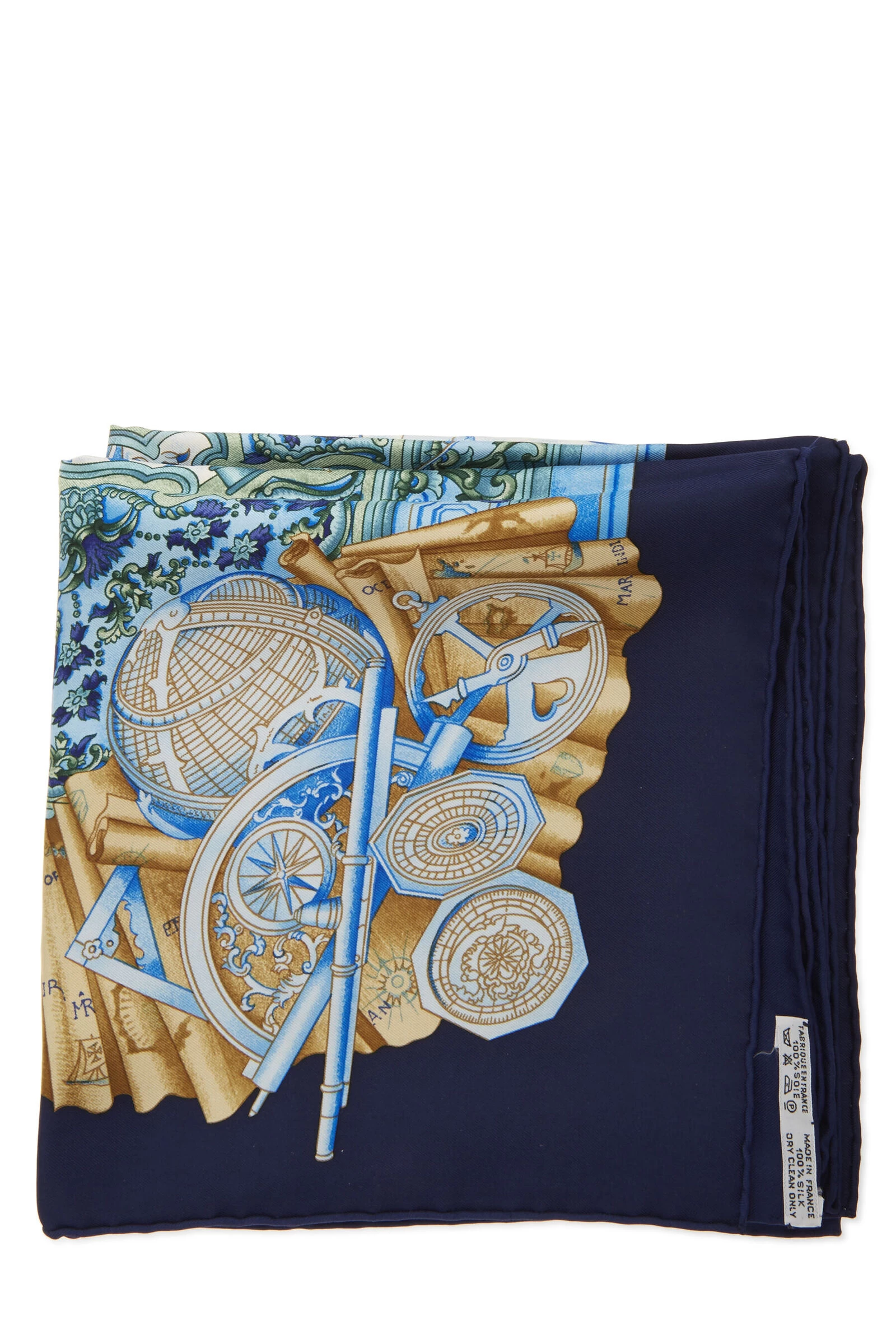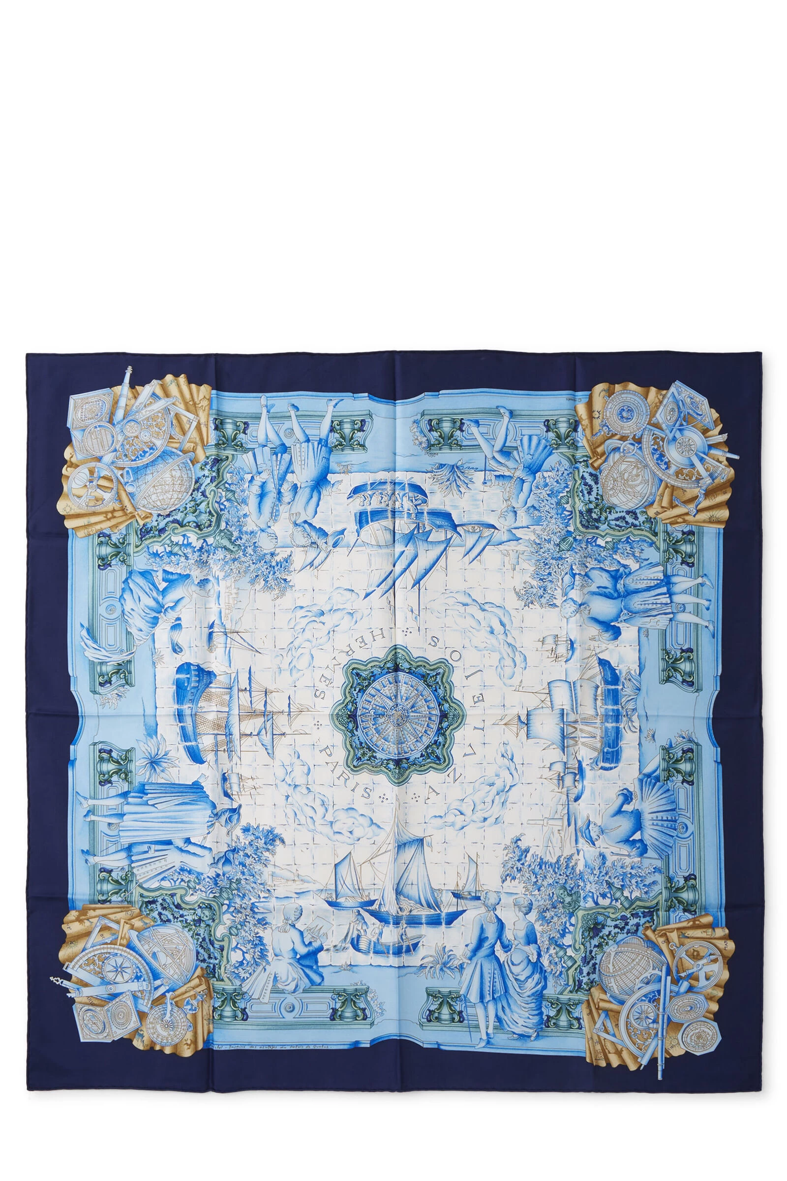 Classic Hermès silk scarf featuring blue and multicolor ‘Azulejos’ ship motif, finished with hand-rolled edges. 100% Silk. Artist Catherine Baschet.