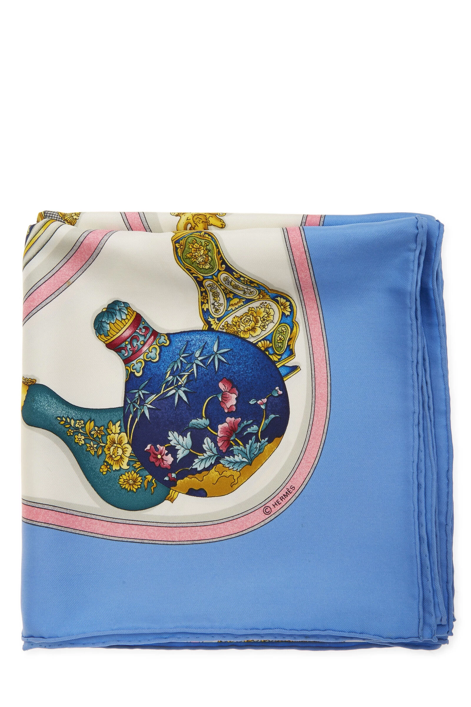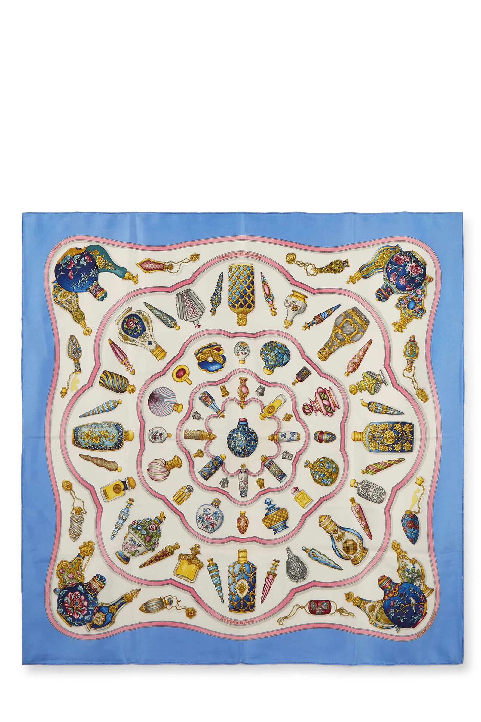 Classic Hermès silk scarf featuring blue and multicolor ‘Qu’ Importe le Flacon’ bottle motif, finished with hand-rolled edges. 100% Silk. Artist Catherine Baschet.