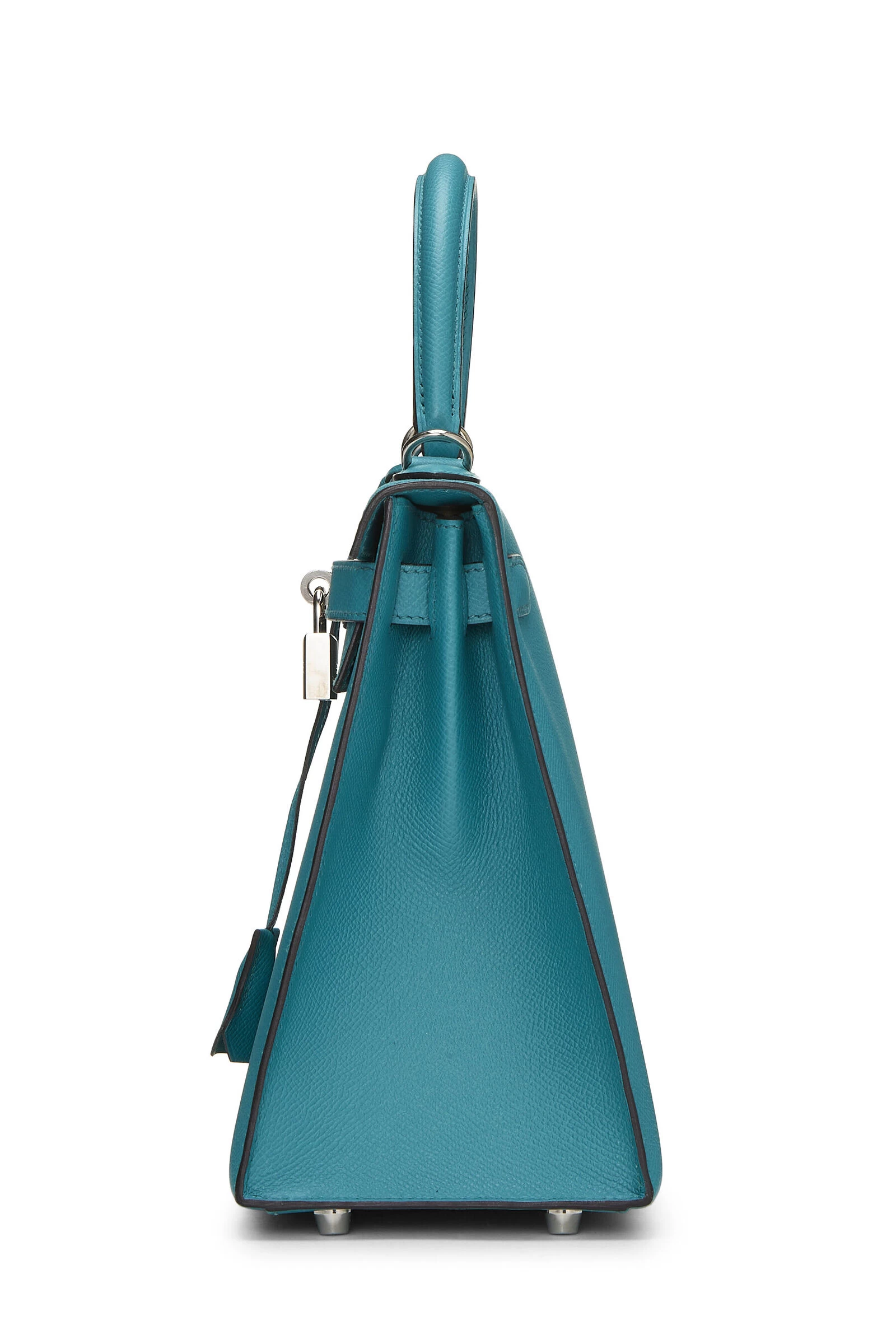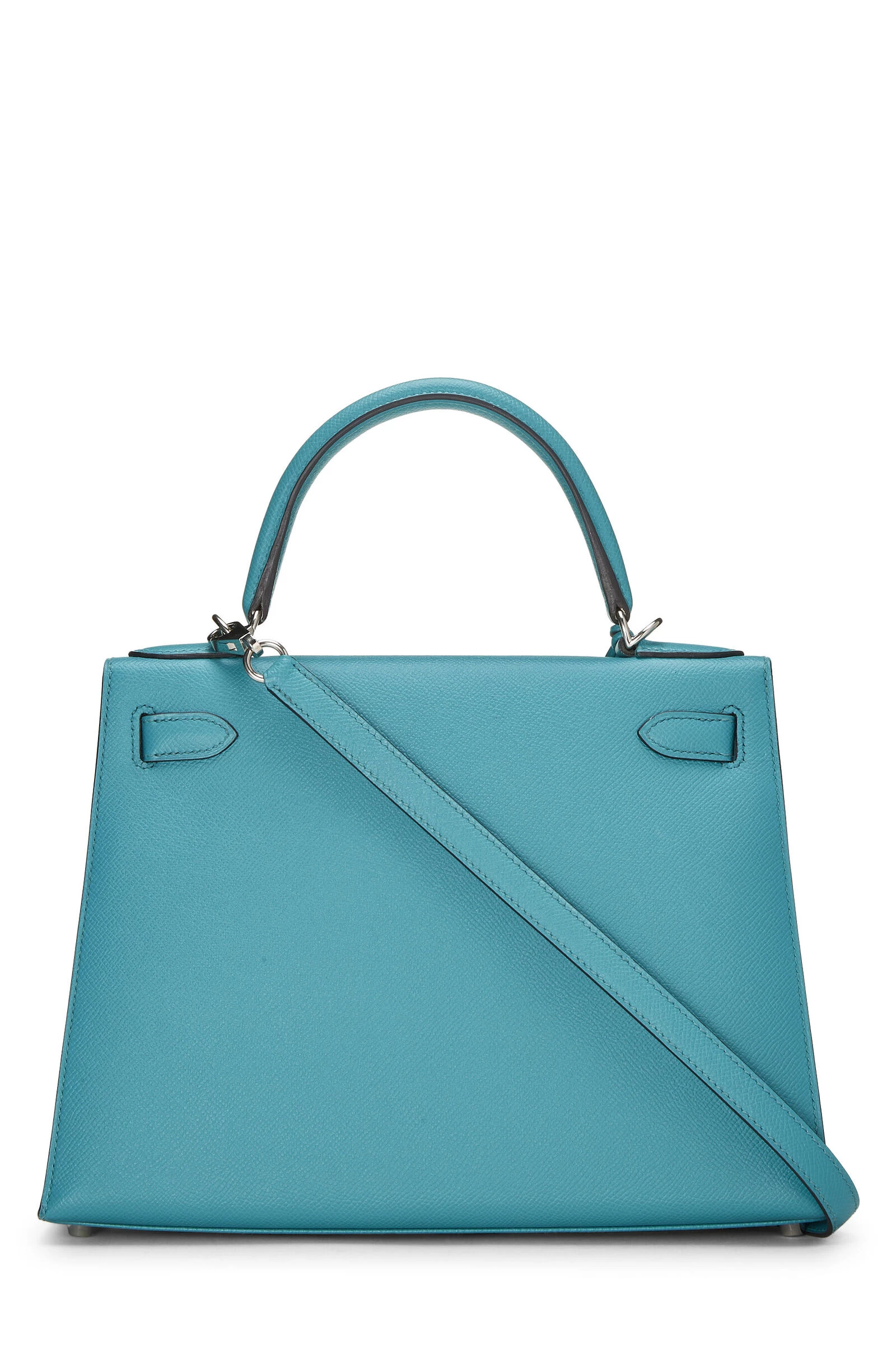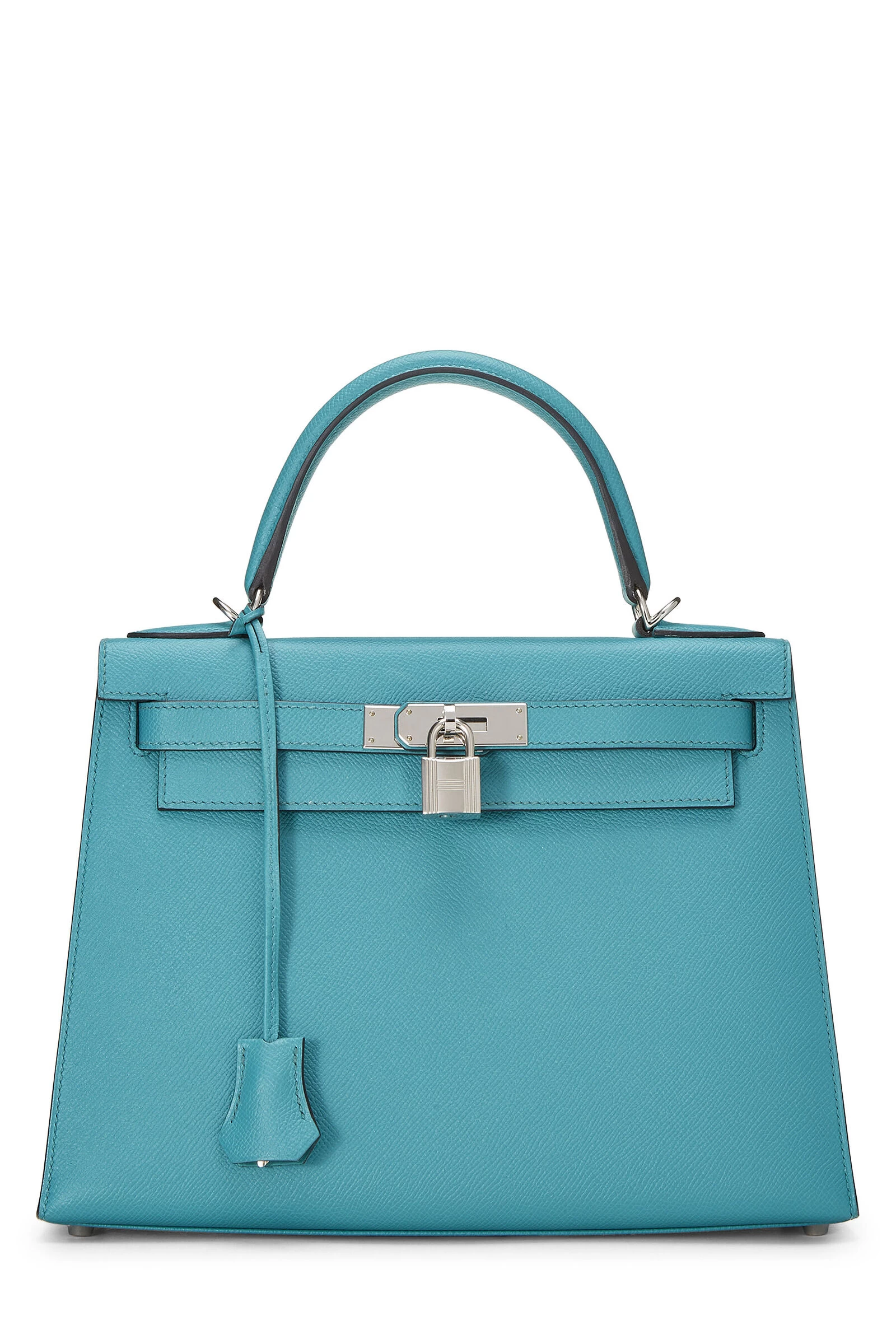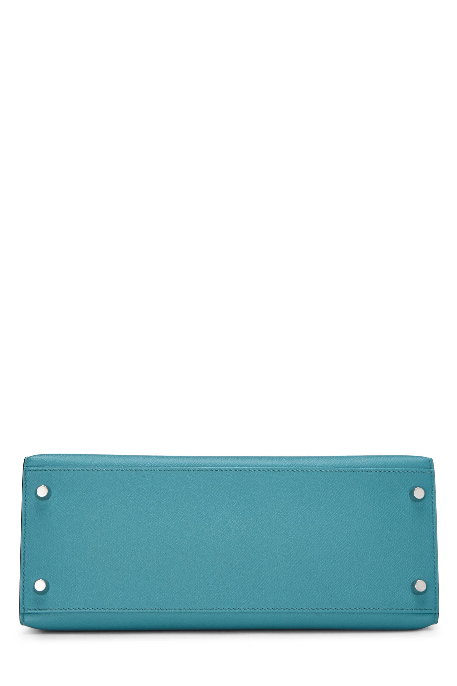 Classic Kelly Sellier 28 rendered in Blue Paon teal Epsom leather and accented with Palladium-plated hardware. Epsom leather is the most lightweight and easy to clean of all Hermès leathers, it is embossed for a consistent grain and increased durability that will hold shape and does not scratch easily. Includes lock, two keys and clochette.