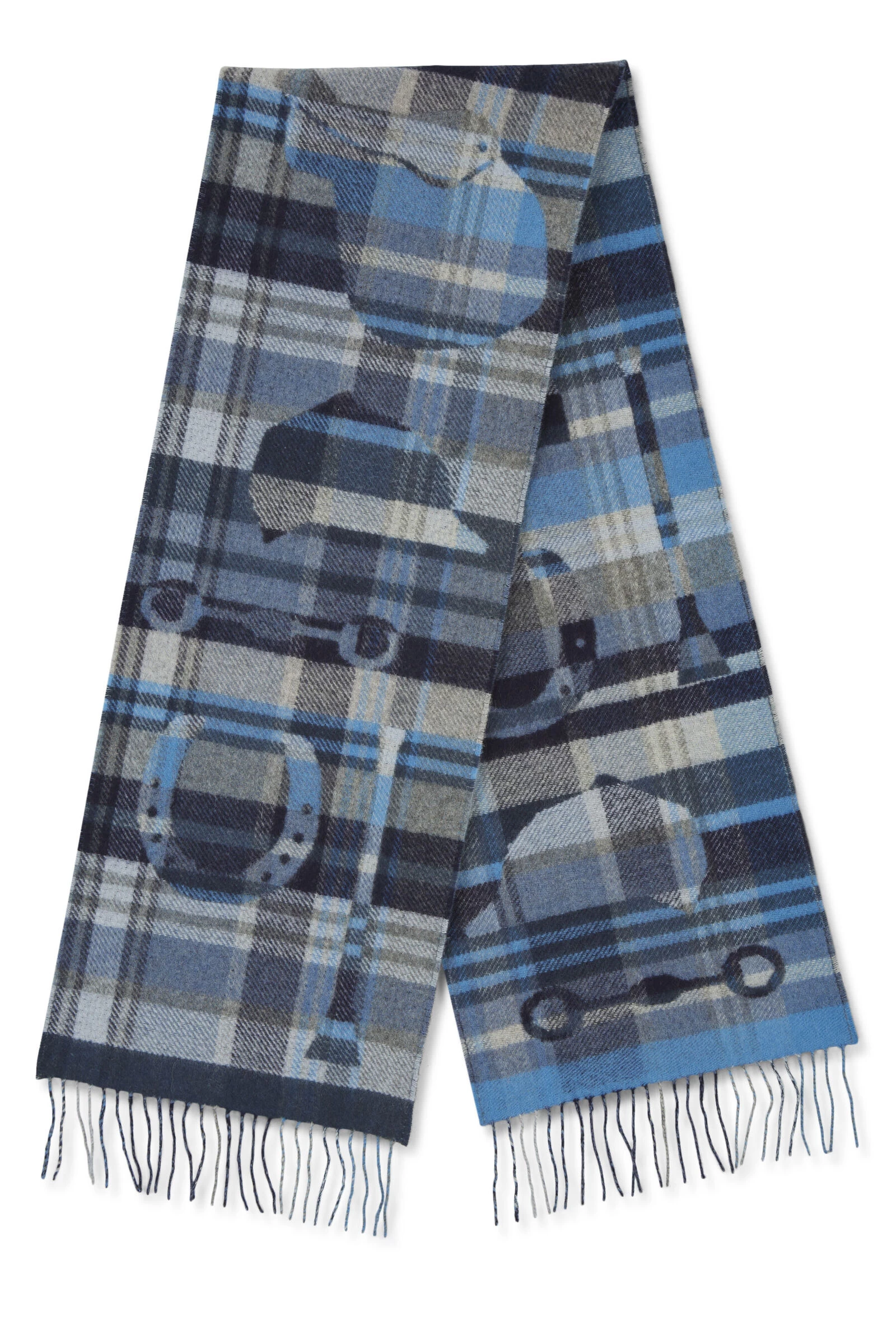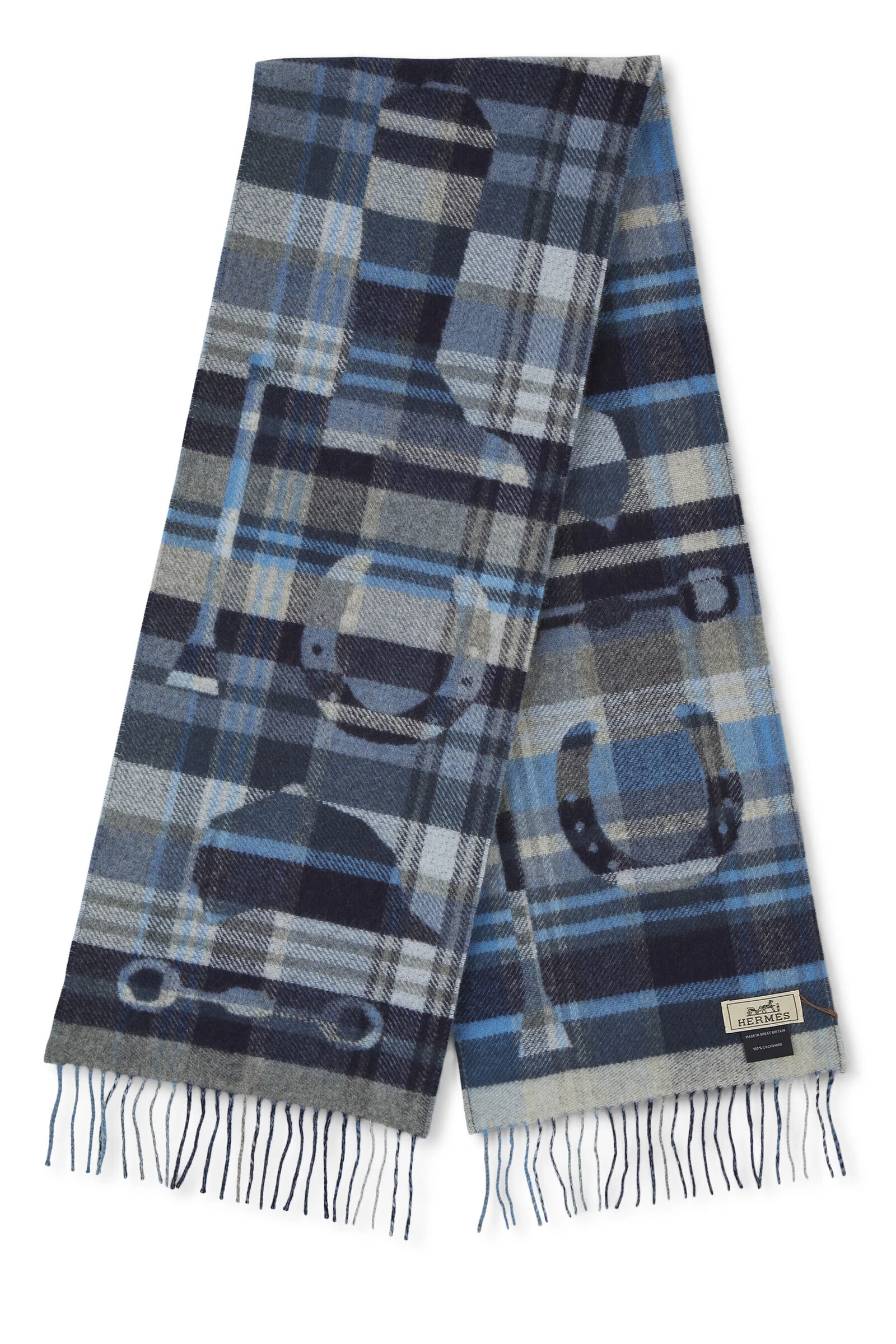 Perfectly warm for the colder months, this Hermès scarf is crafted in multitone blue and gray plaid cashmere with equestrian motifs, and is finished with fringe detailing along the edges.