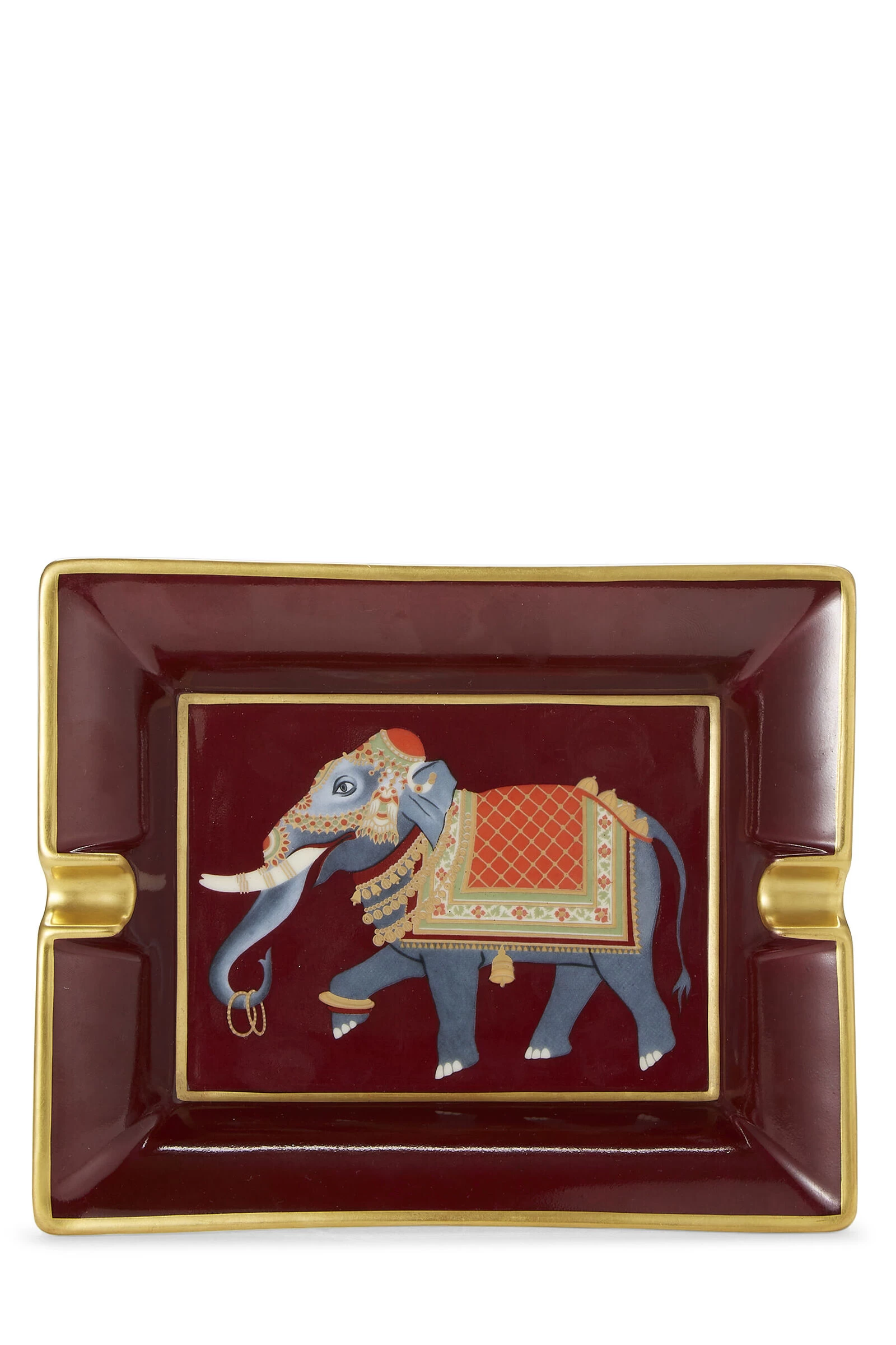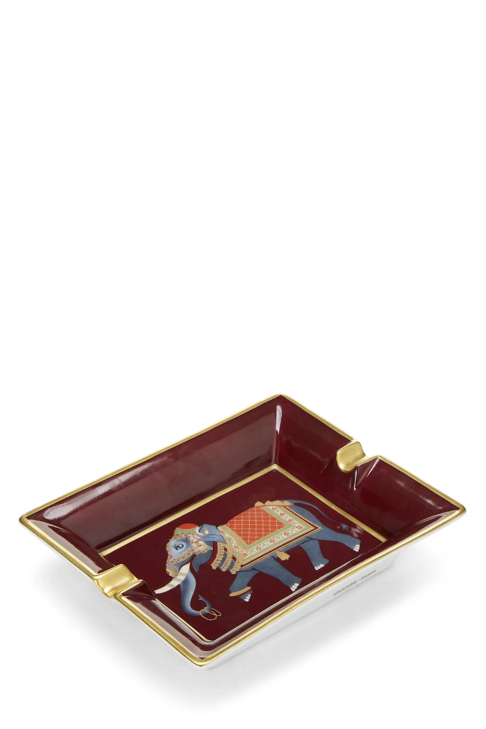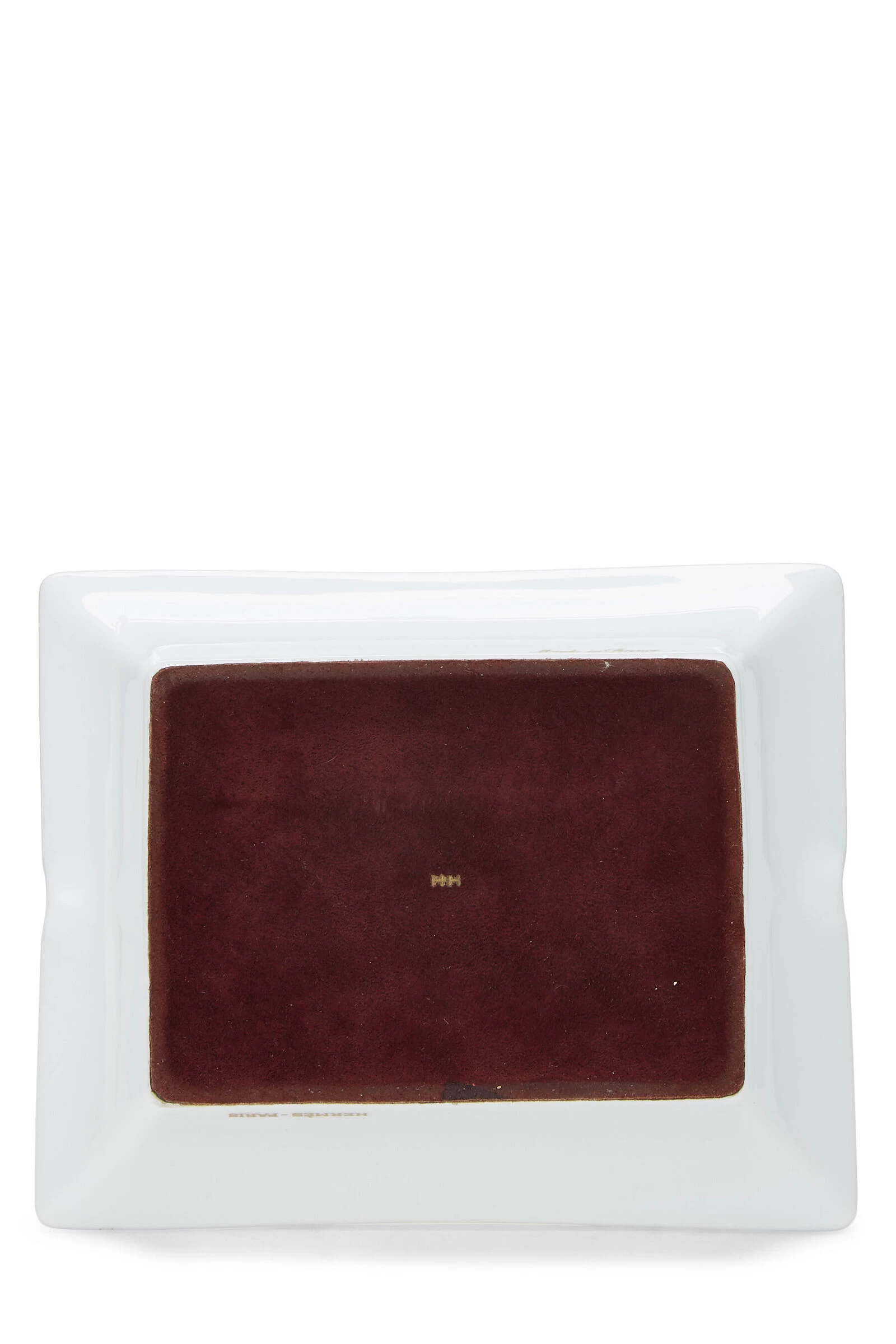 This elegant, square Hermès Porcelain ashtray features an Elephant motif. It is crafted onto the porcelain by the use of chromolithography and the base is adorned in velvet goat-skin.
